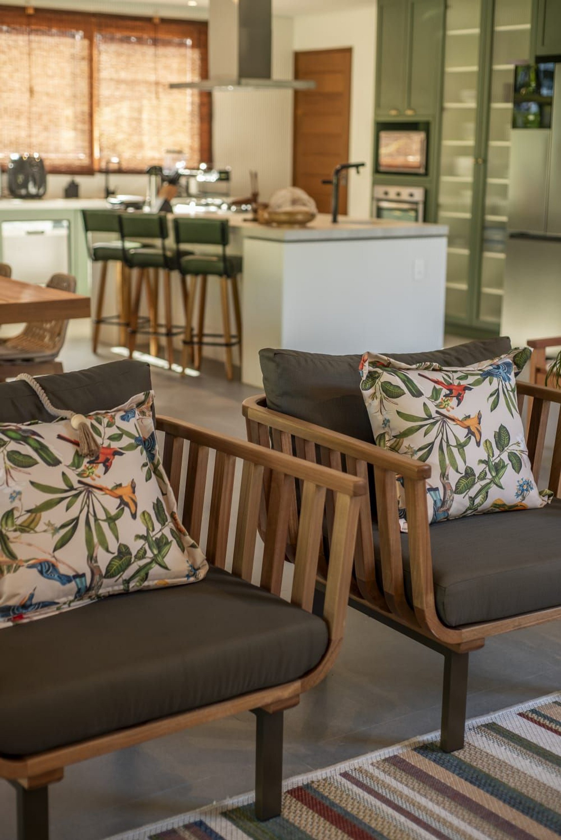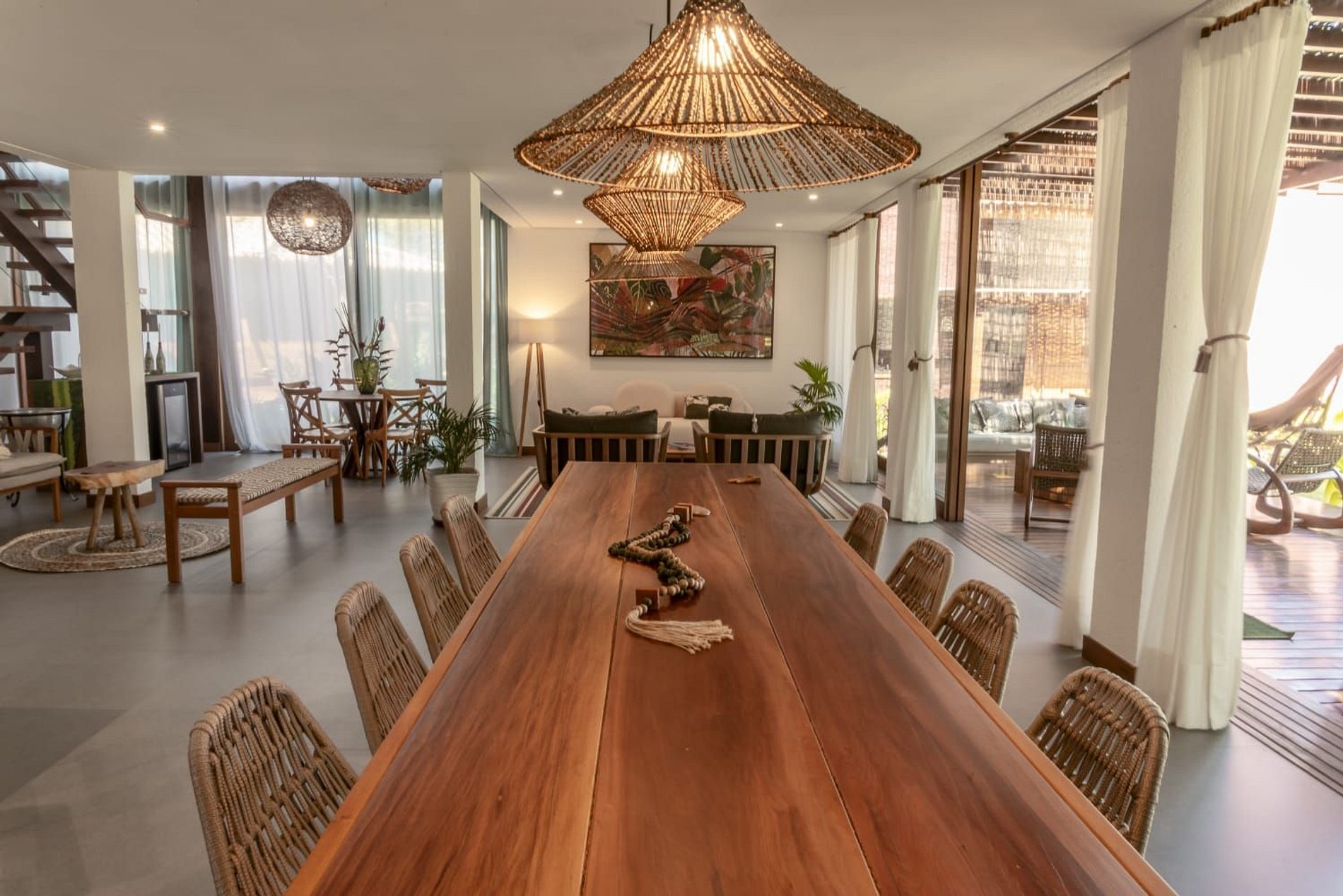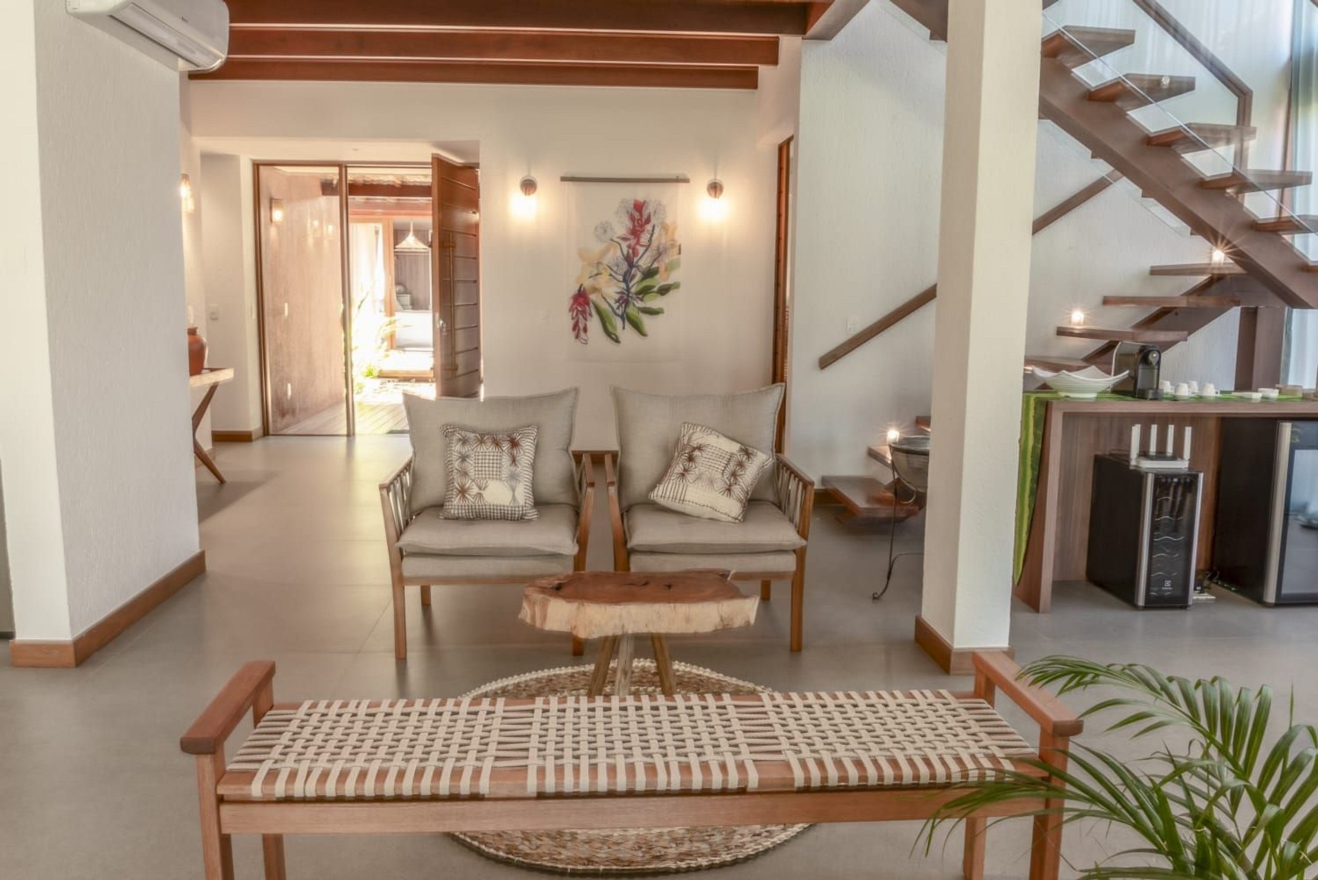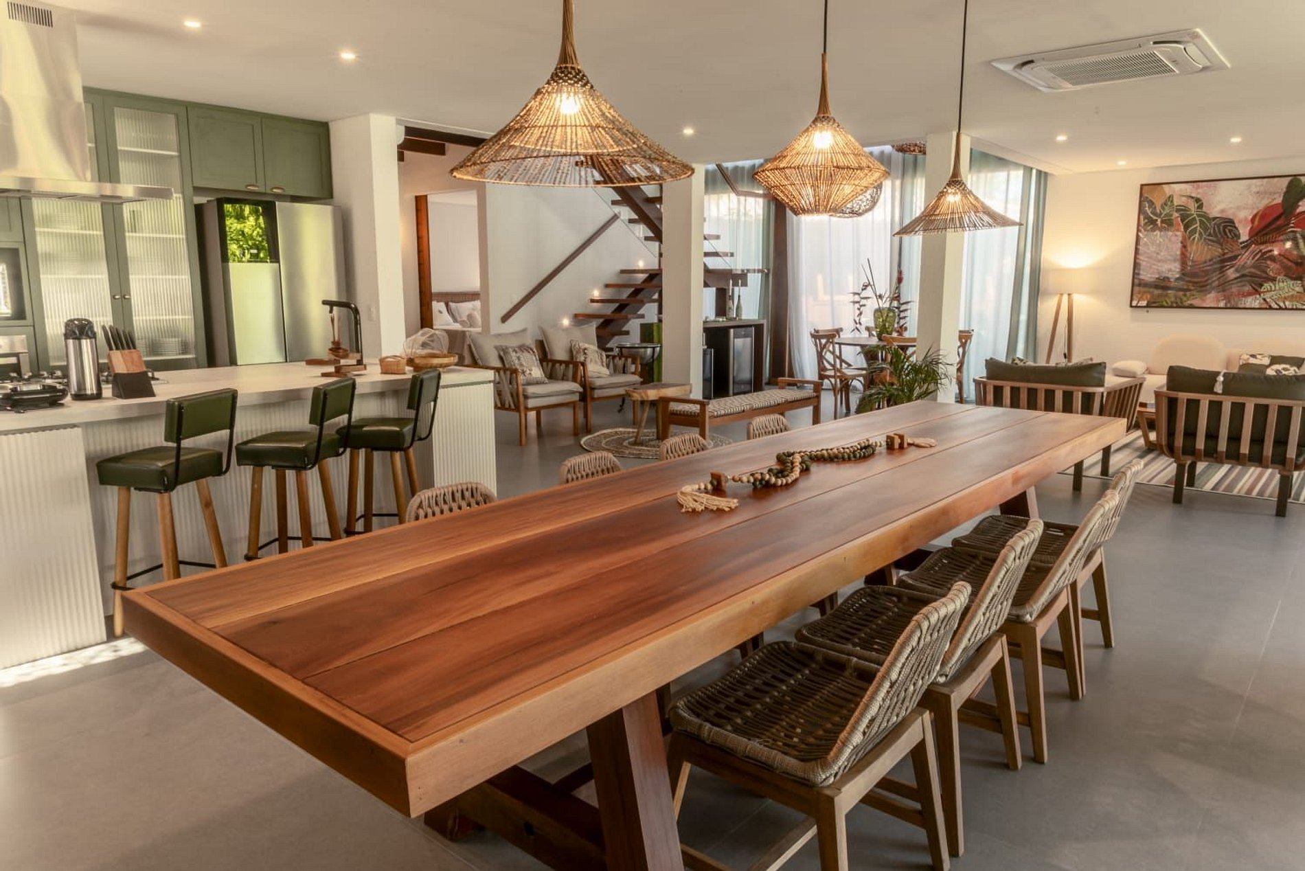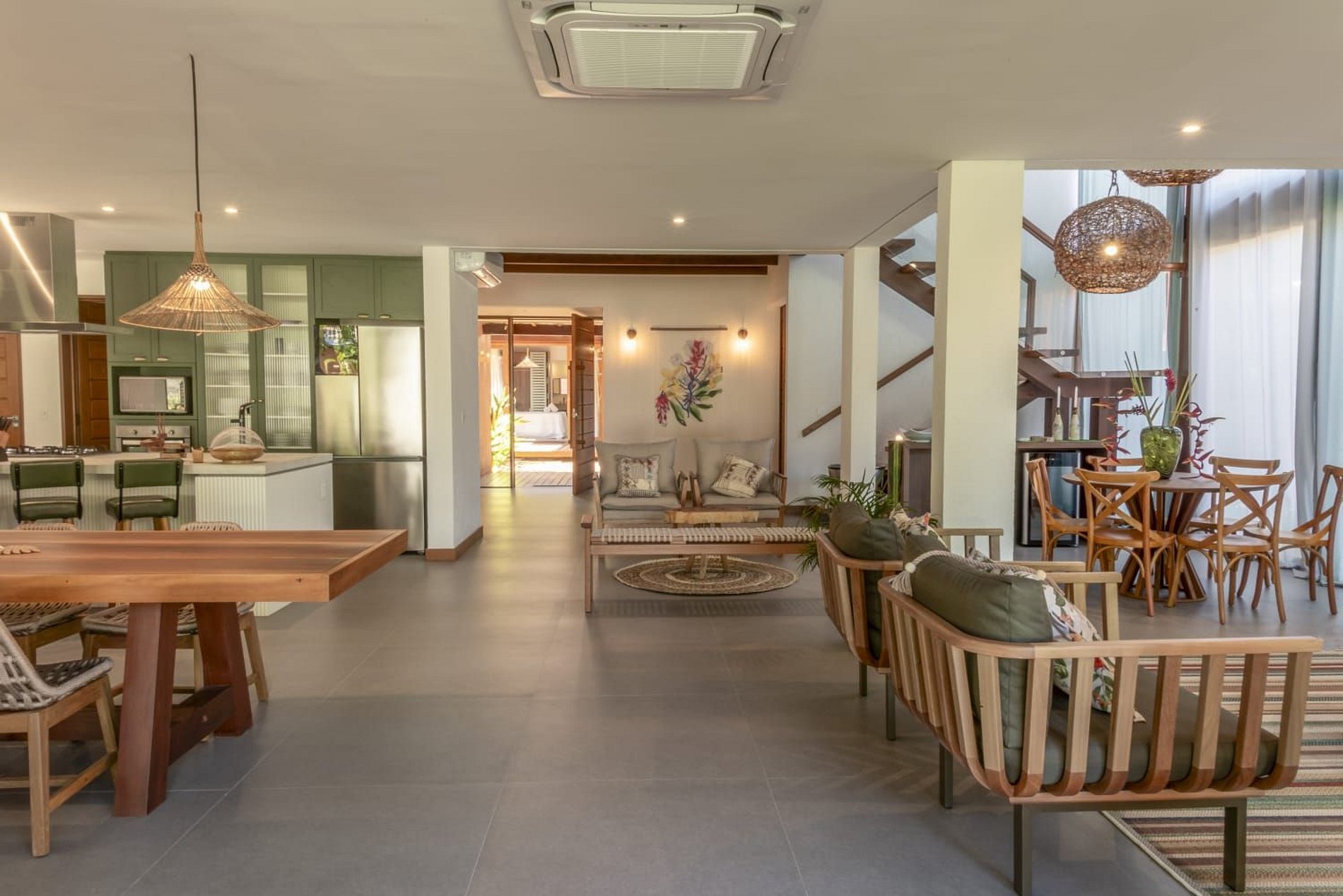 O interior da casa é moderno e bem iluminado, com amplos espaços integrados que unem sofisticação e aconchego. A sala de estar possui móveis de madeira com design contemporâneo e decoração tropical, enquanto grandes janelas de vidro permitem a entrada abundante de luz natural. A atmosfera é leve, elegante e perfeita para receber famílias ou grupos de amigos.