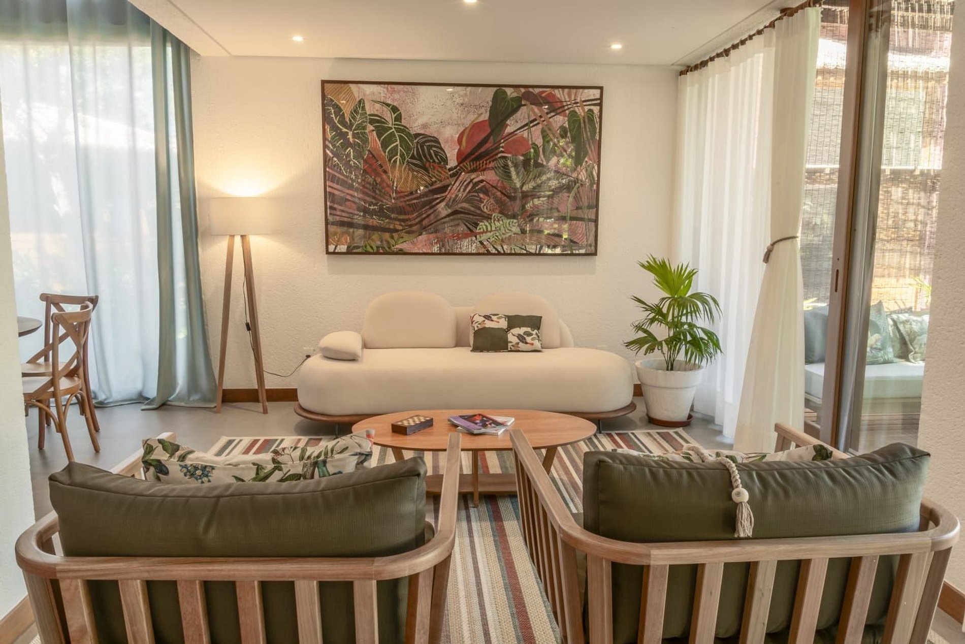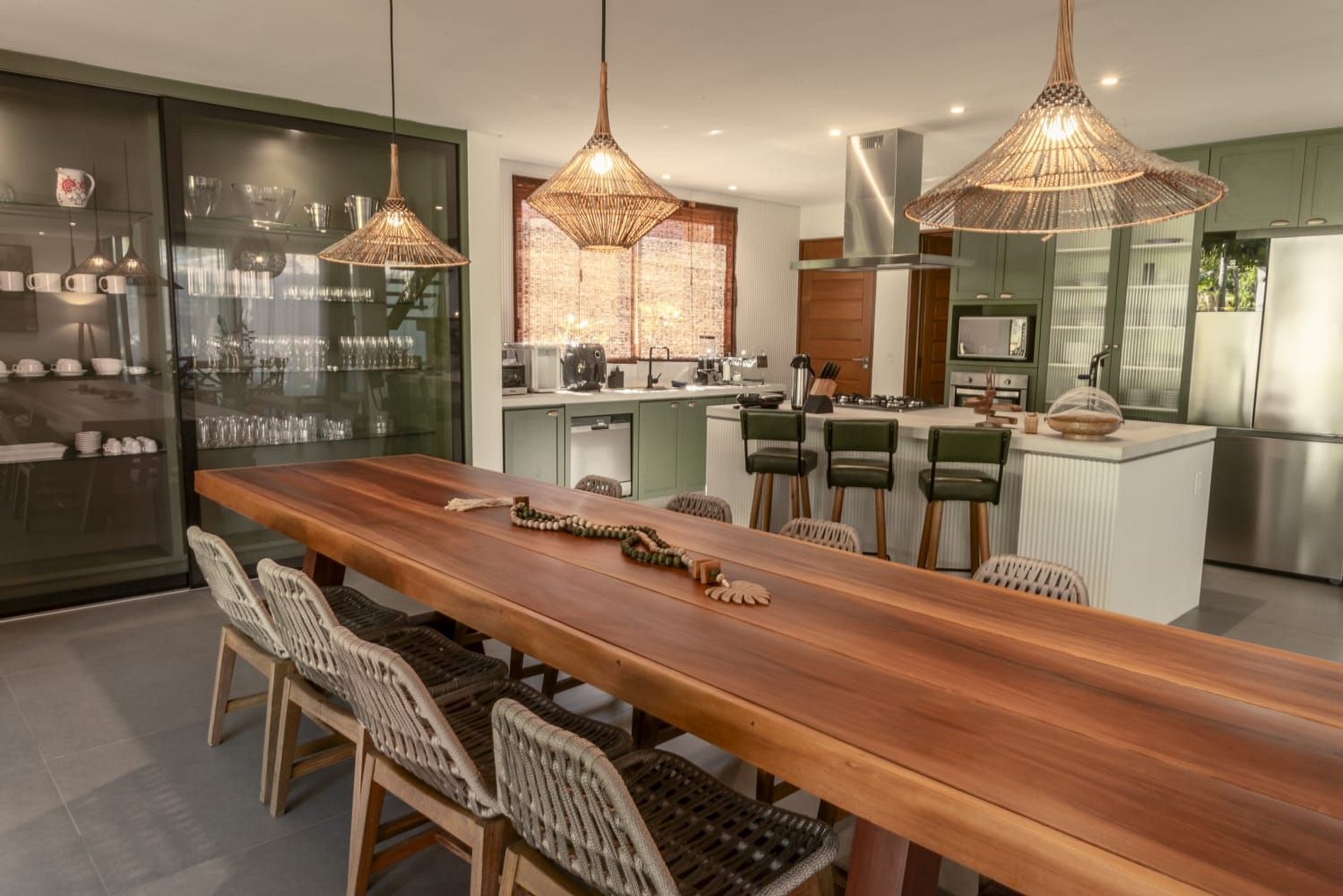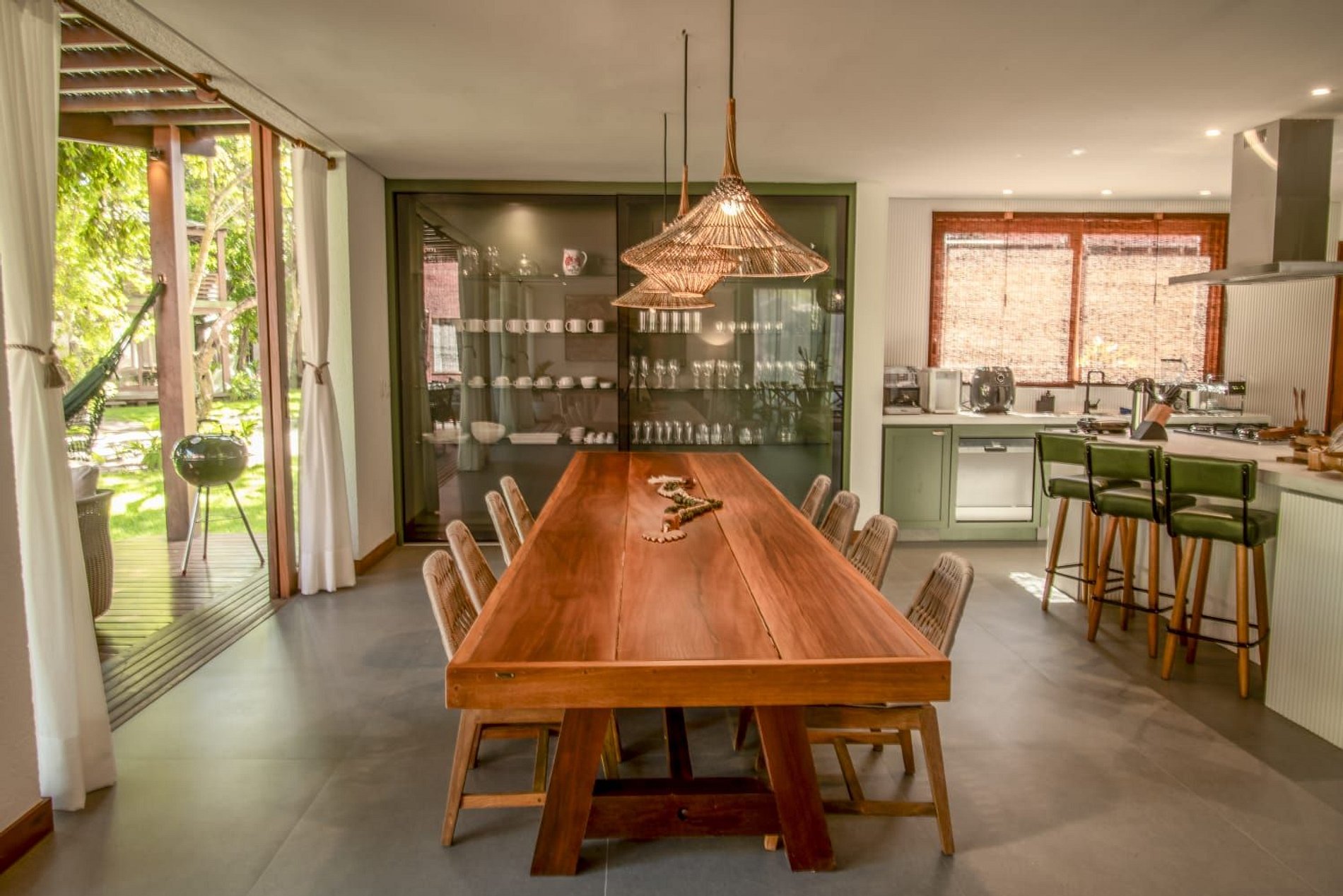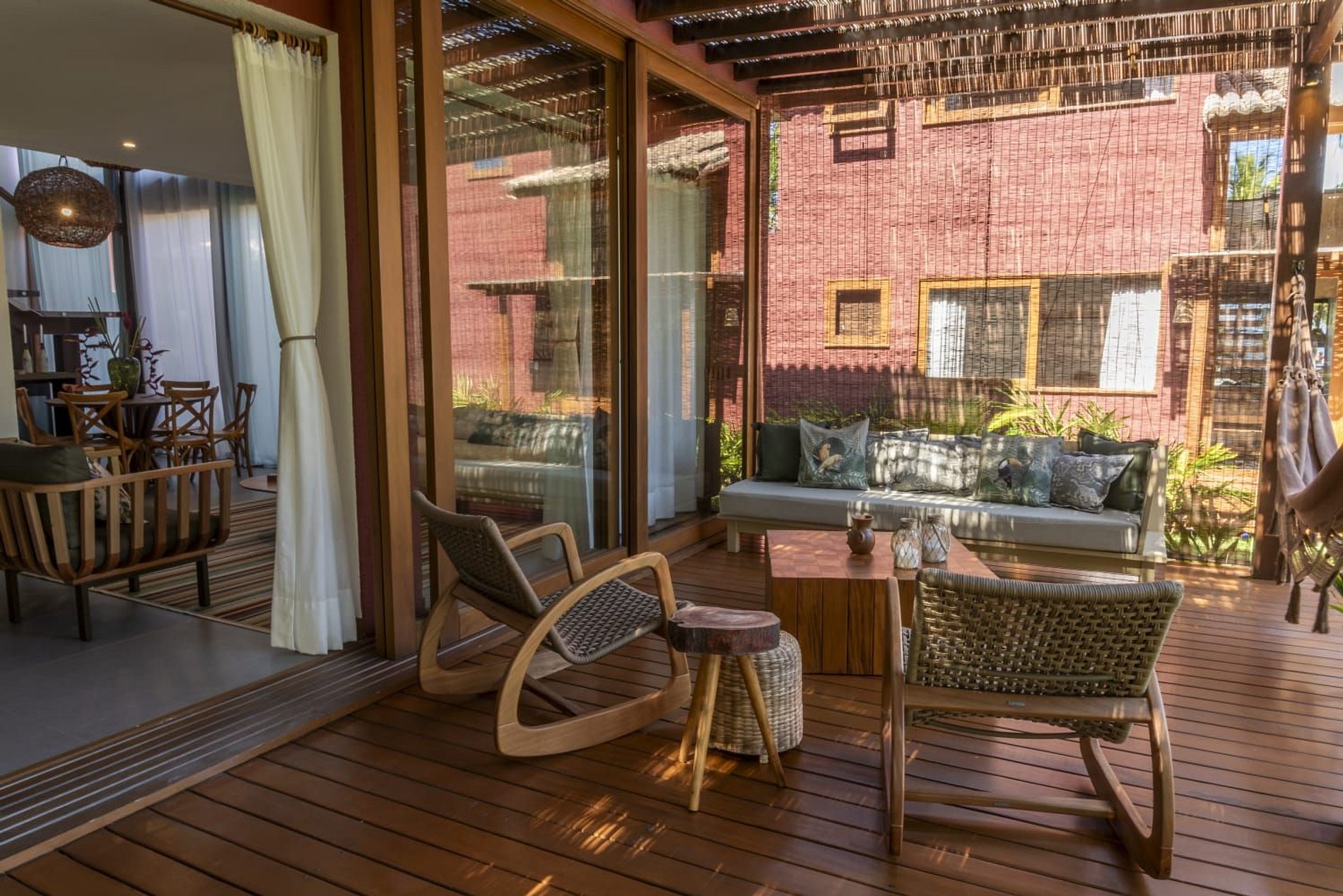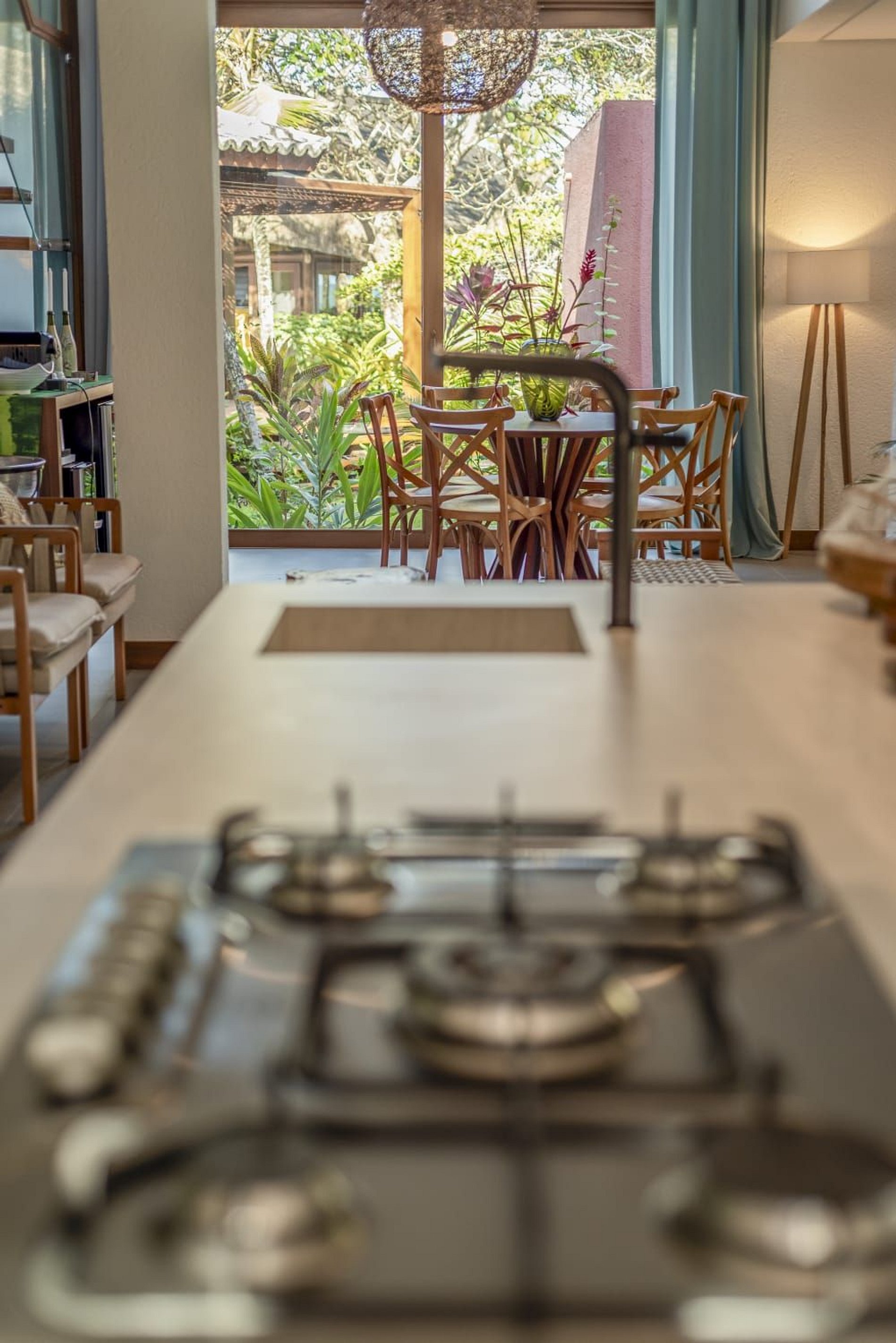 O interior da casa é moderno e bem iluminado, com amplos espaços integrados que unem sofisticação e aconchego. A sala de estar possui móveis de madeira com design contemporâneo e decoração tropical, enquanto grandes janelas de vidro permitem a entrada abundante de luz natural. A atmosfera é leve, elegante e perfeita para receber famílias ou grupos de amigos.
