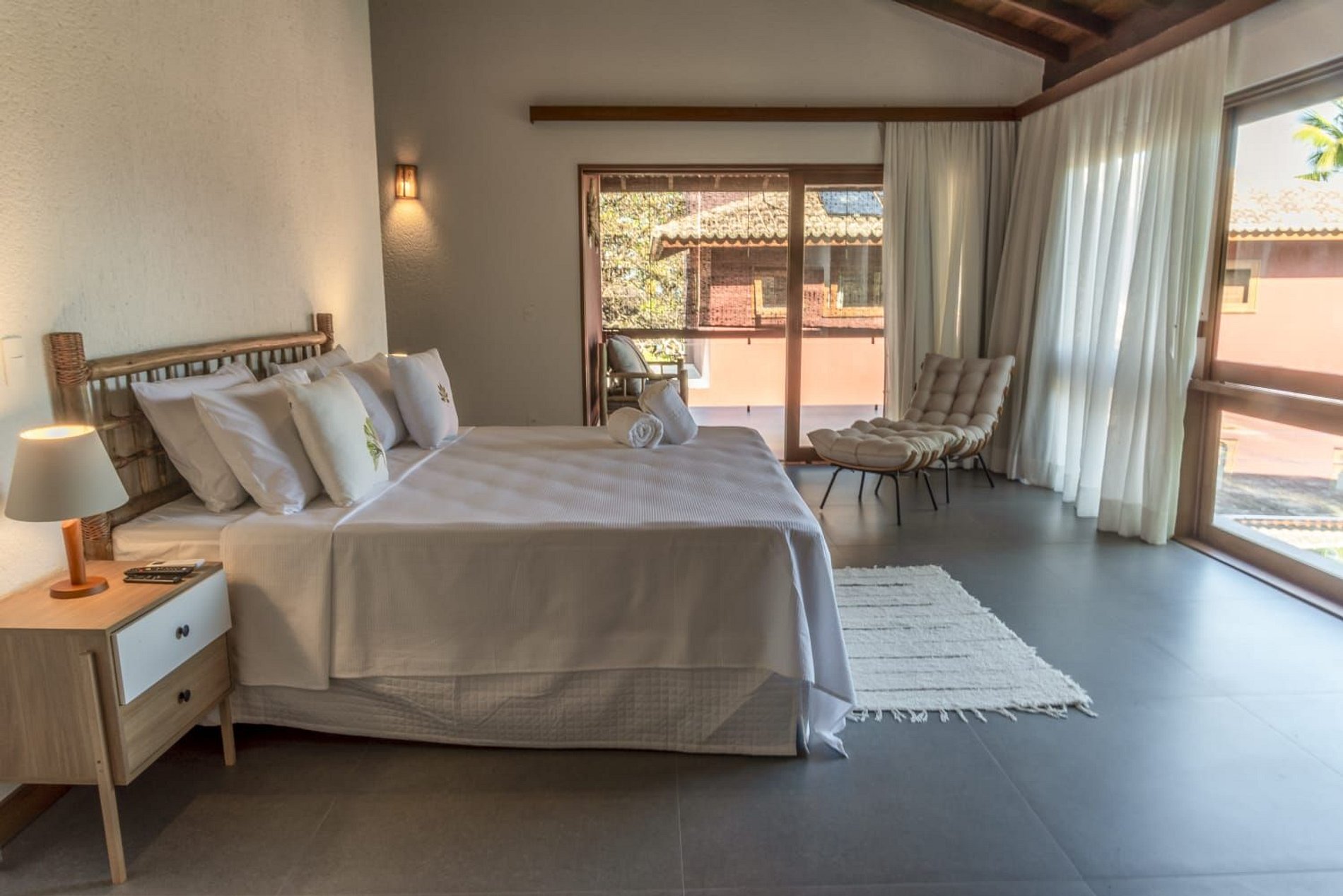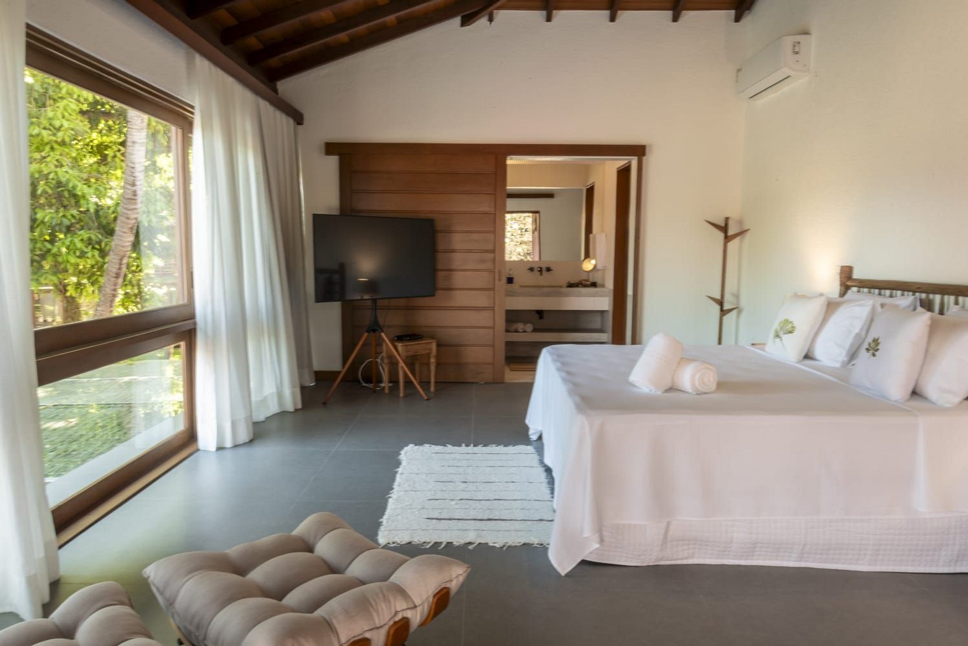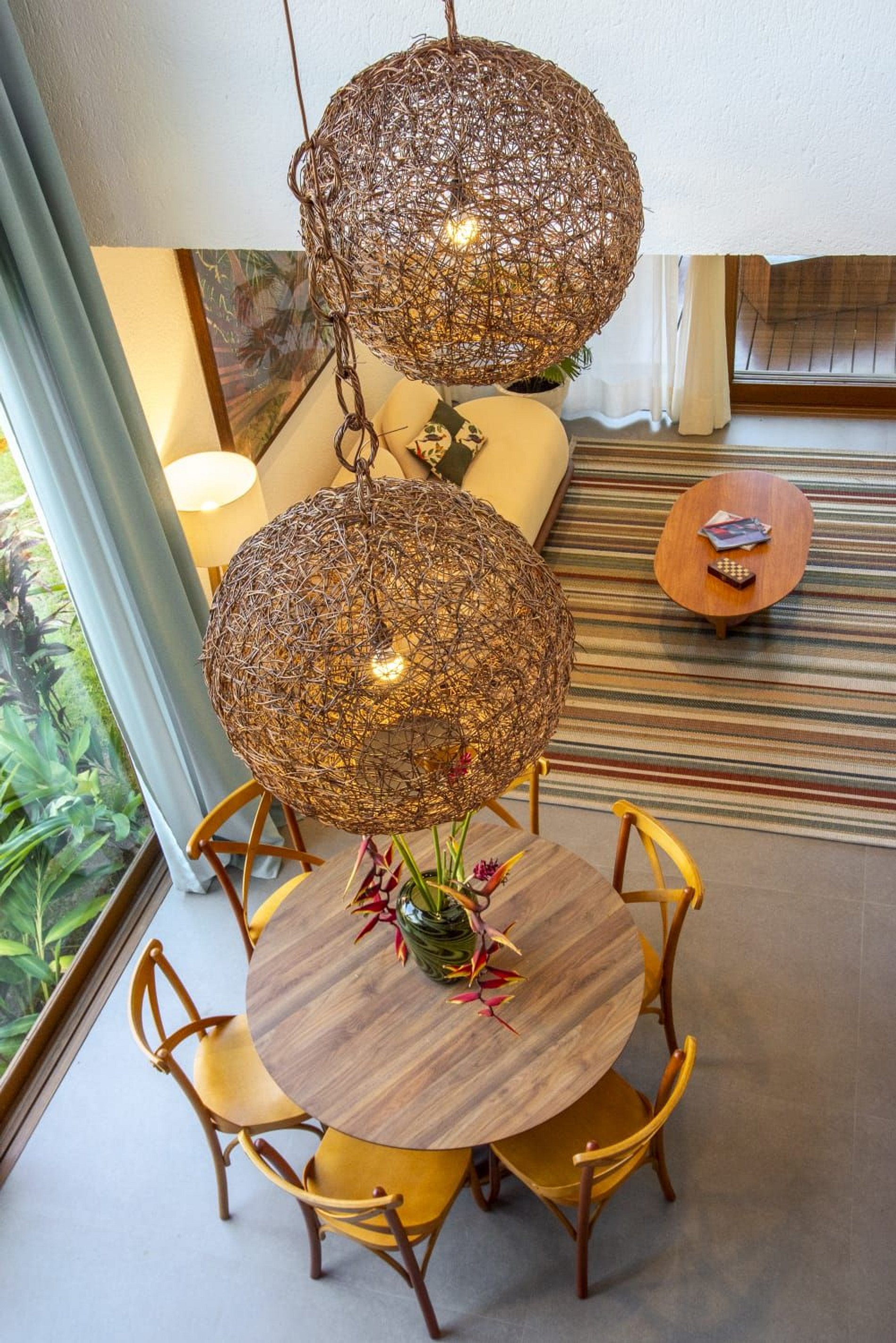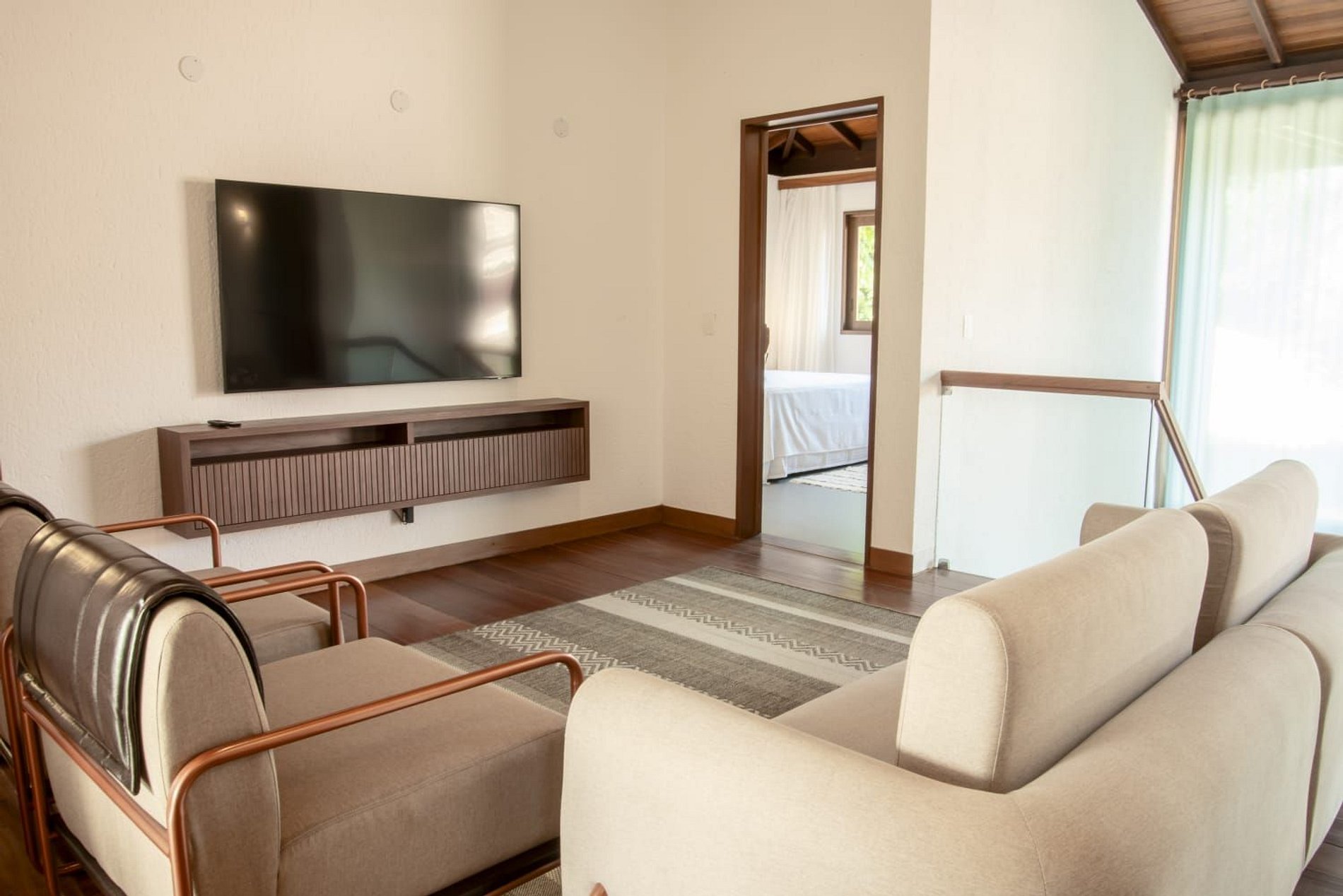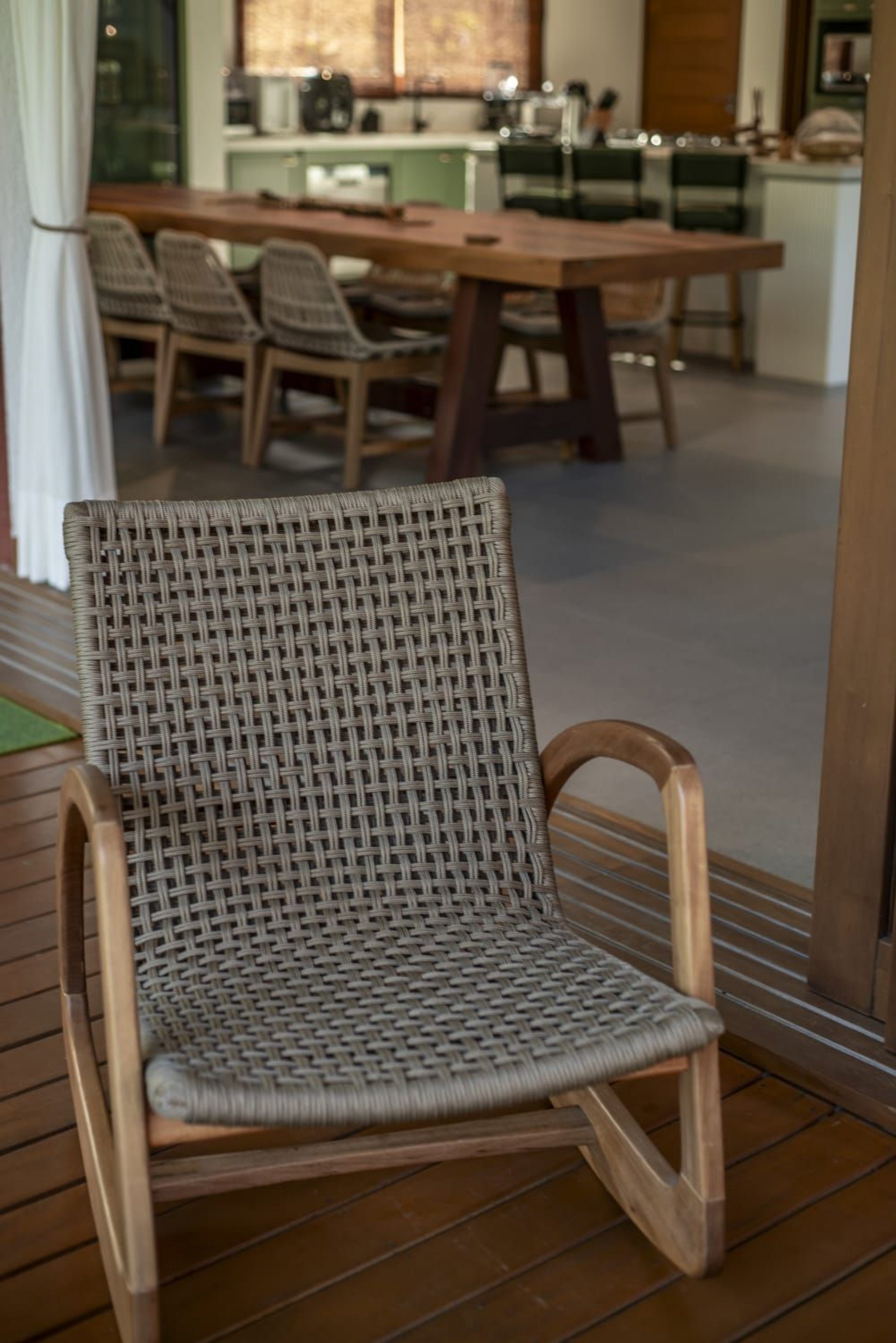 O interior da casa é moderno e bem iluminado, com amplos espaços integrados que unem sofisticação e aconchego. A sala de estar possui móveis de madeira com design contemporâneo e decoração tropical, enquanto grandes janelas de vidro permitem a entrada abundante de luz natural. A atmosfera é leve, elegante e perfeita para receber famílias ou grupos de amigos.