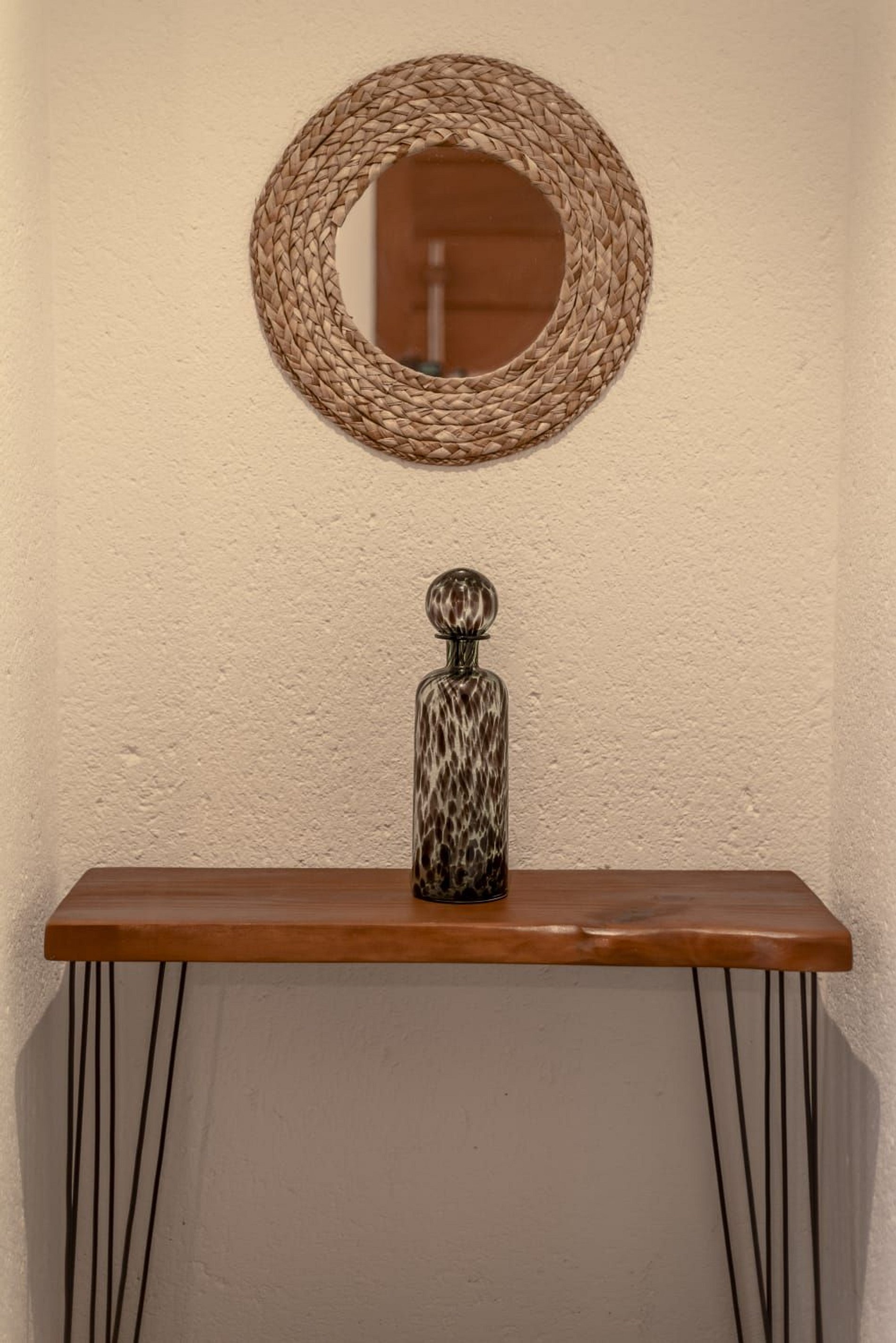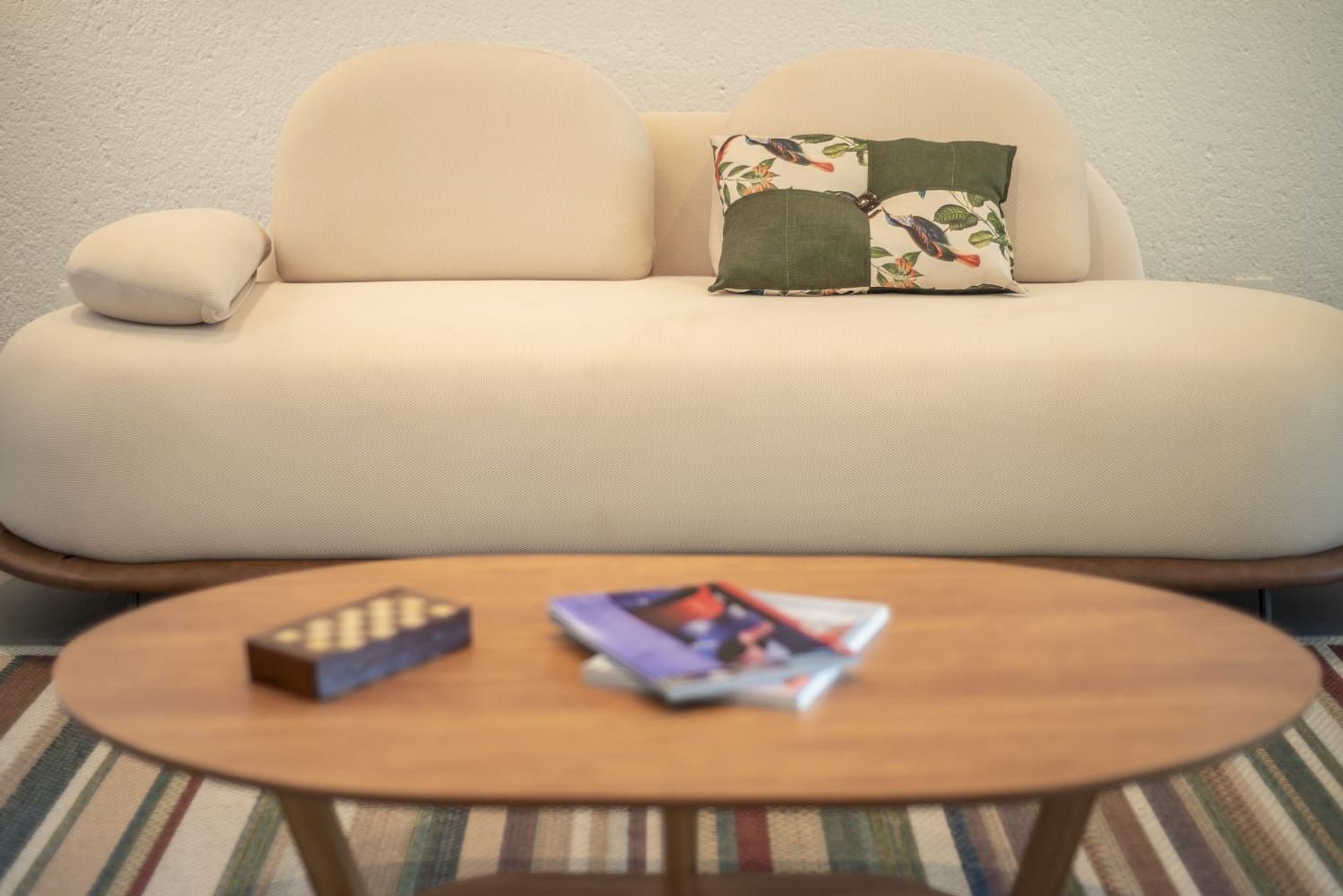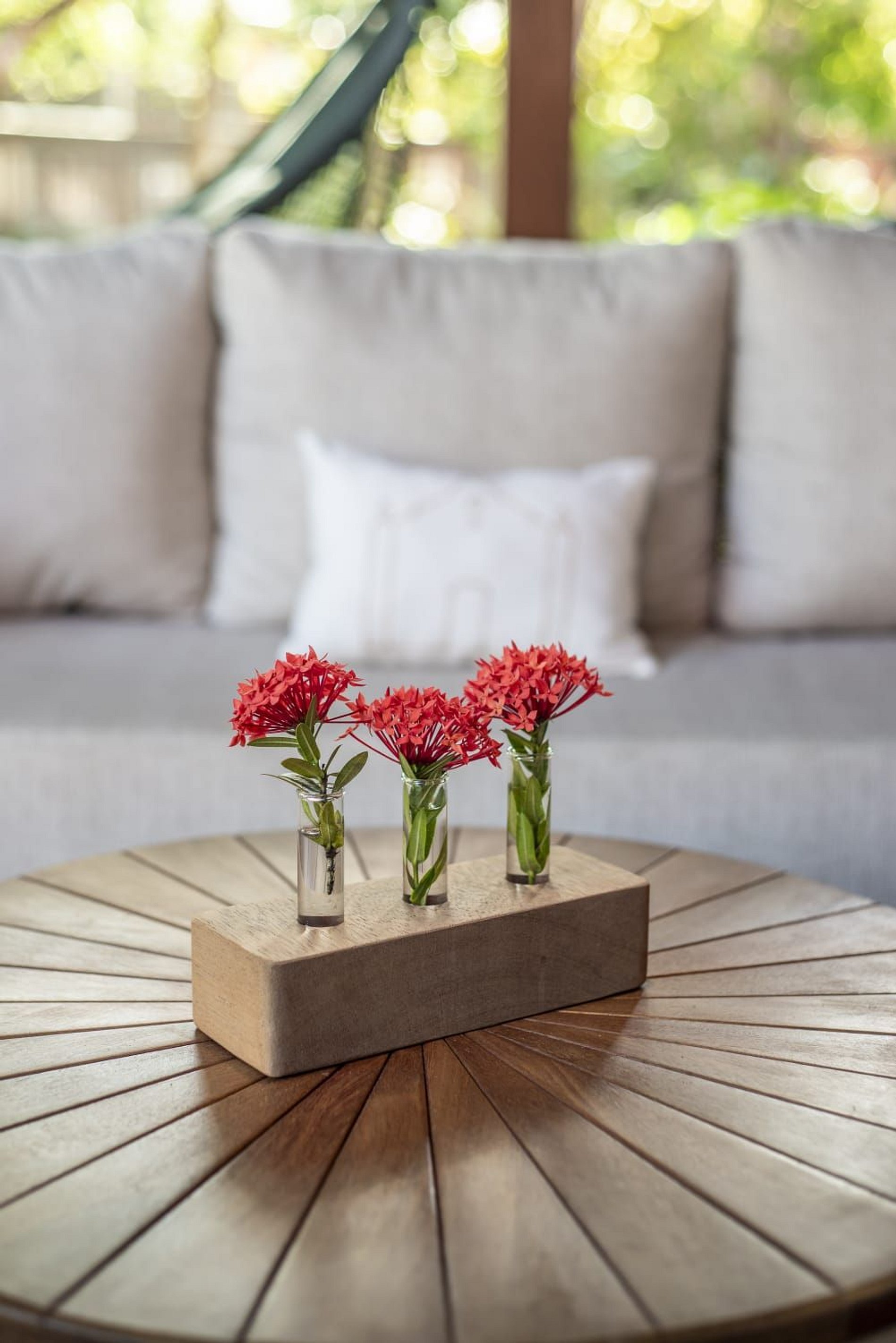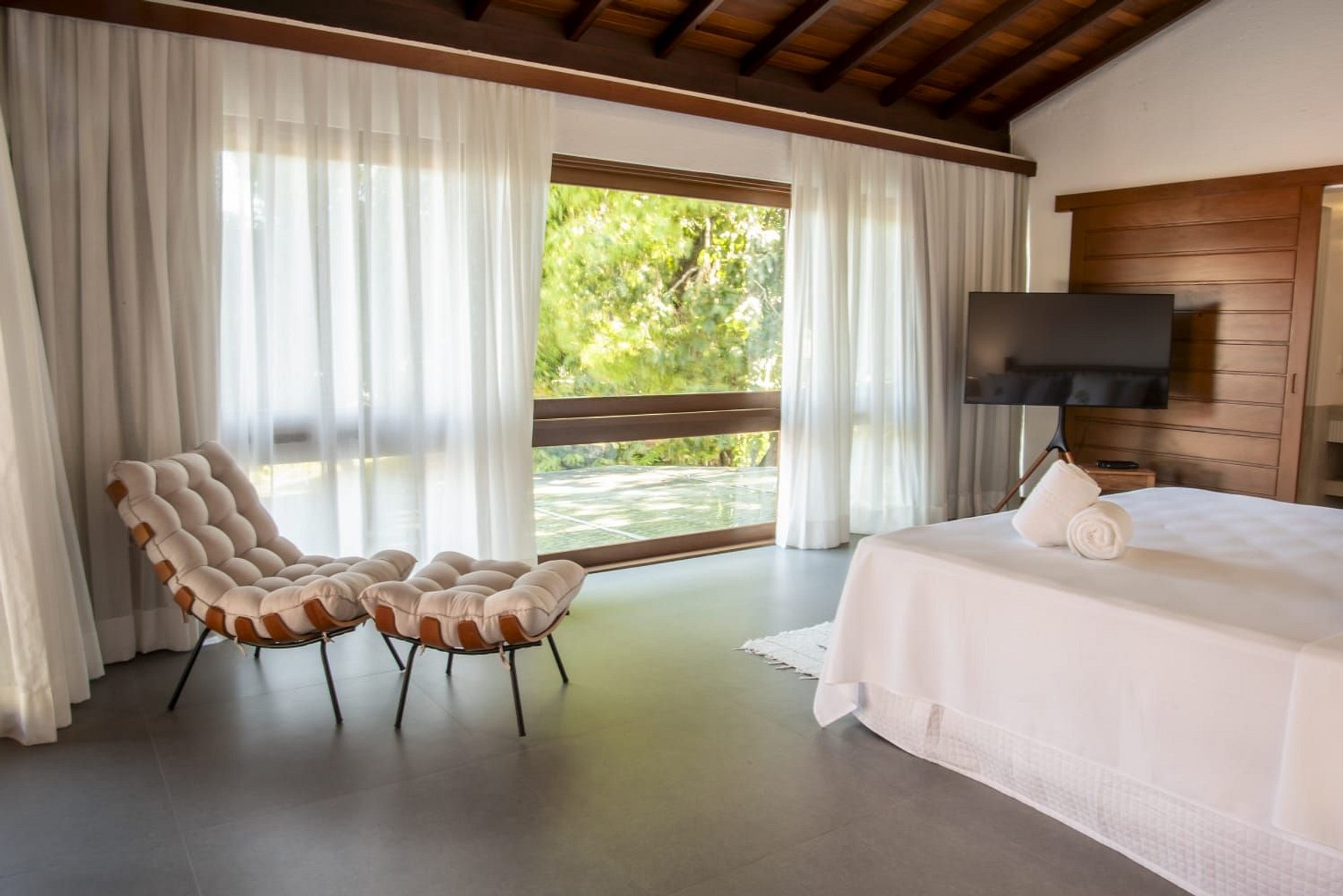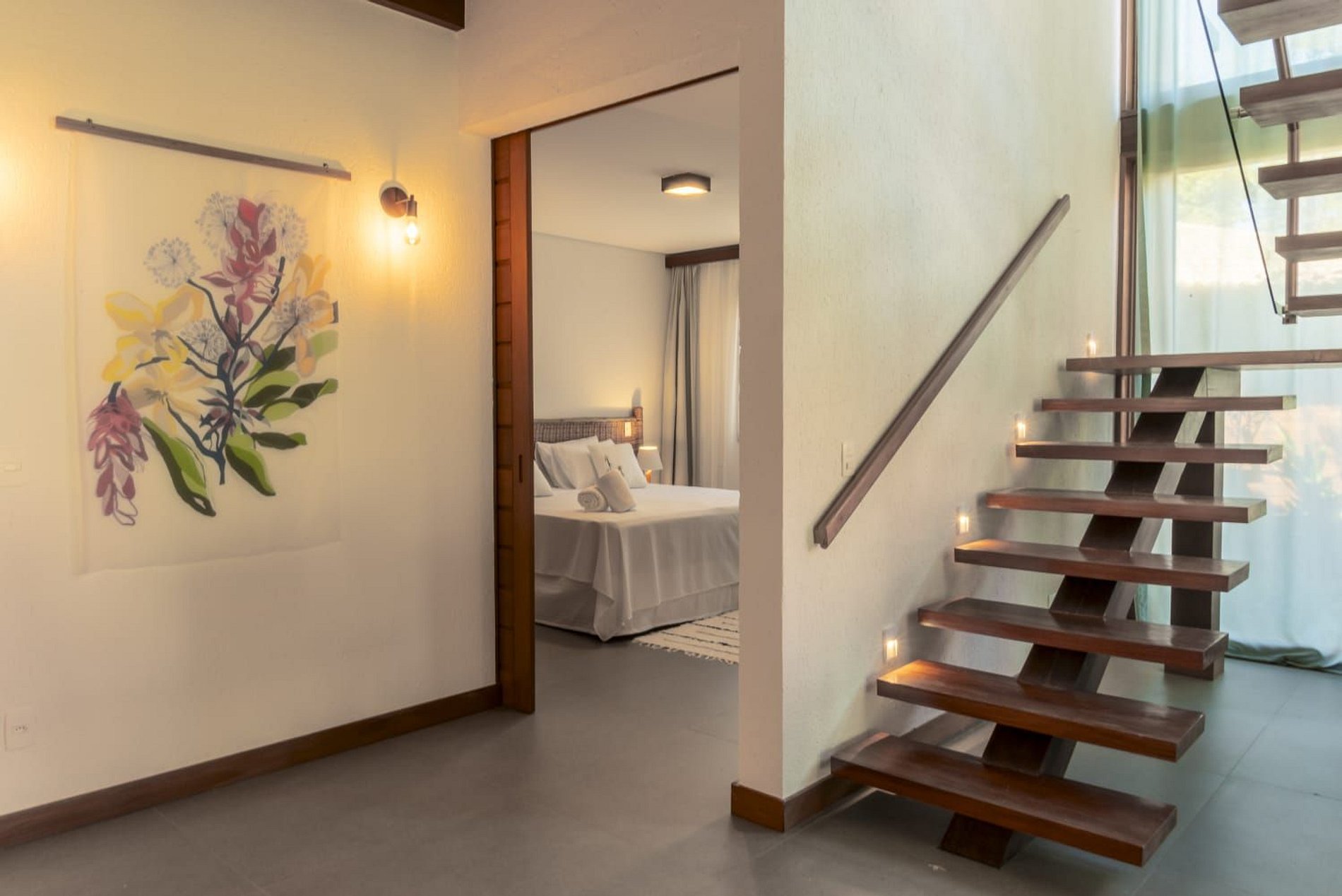 O interior da casa é moderno e bem iluminado, com amplos espaços integrados que unem sofisticação e aconchego. A sala de estar possui móveis de madeira com design contemporâneo e decoração tropical, enquanto grandes janelas de vidro permitem a entrada abundante de luz natural. A atmosfera é leve, elegante e perfeita para receber famílias ou grupos de amigos.
