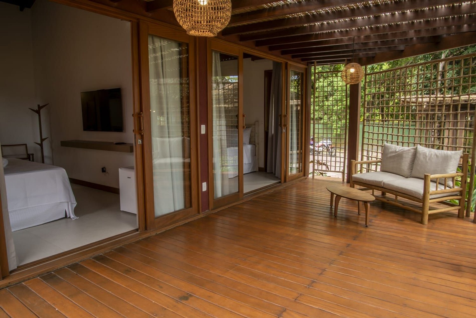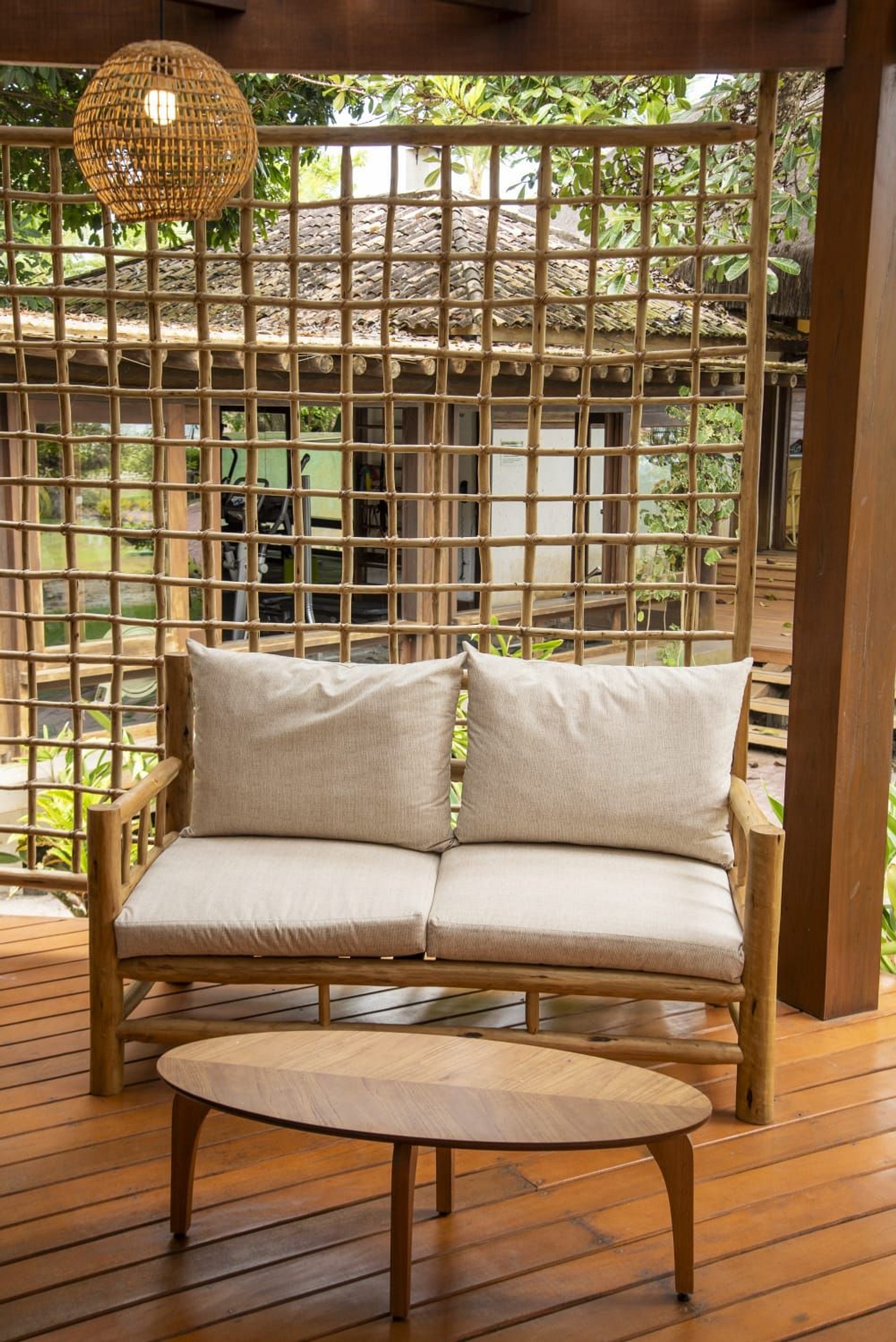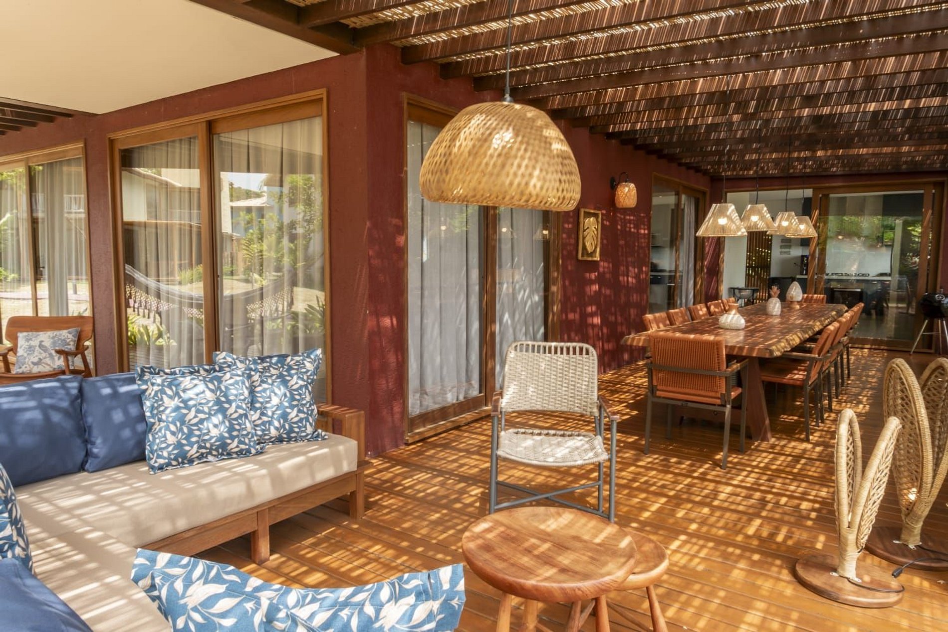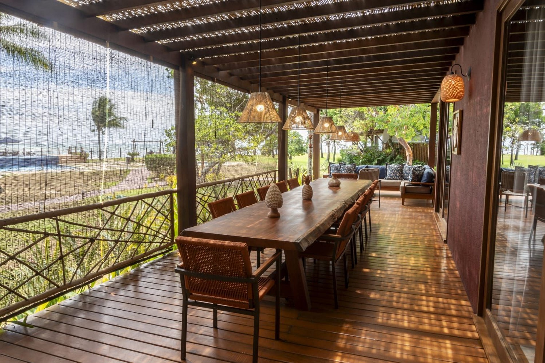 A casa conta com um charmoso deck de madeira integrado ao jardim, perfeito para momentos de descanso e contemplação da natureza. A varanda é ampla e equipada com sofás, poltronas e redes que convidam a relaxar enquanto a brisa do mar refresca o ambiente. O jardim gramado ao redor complementa a atmosfera tranquila e acolhedora.