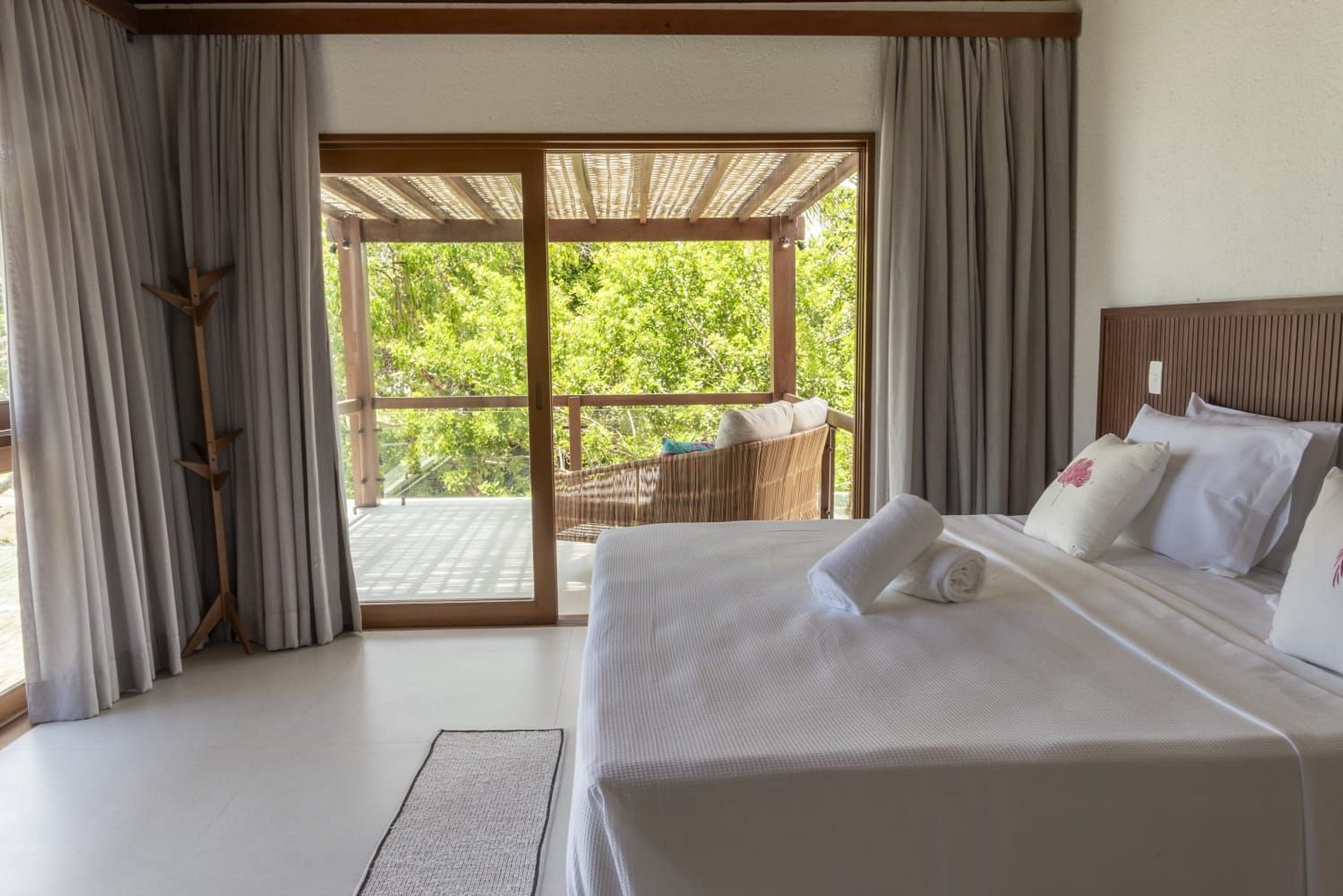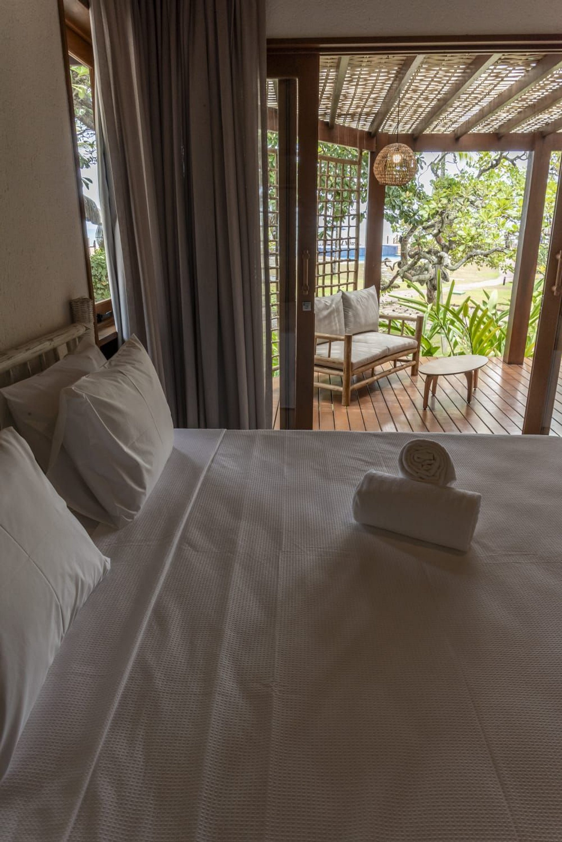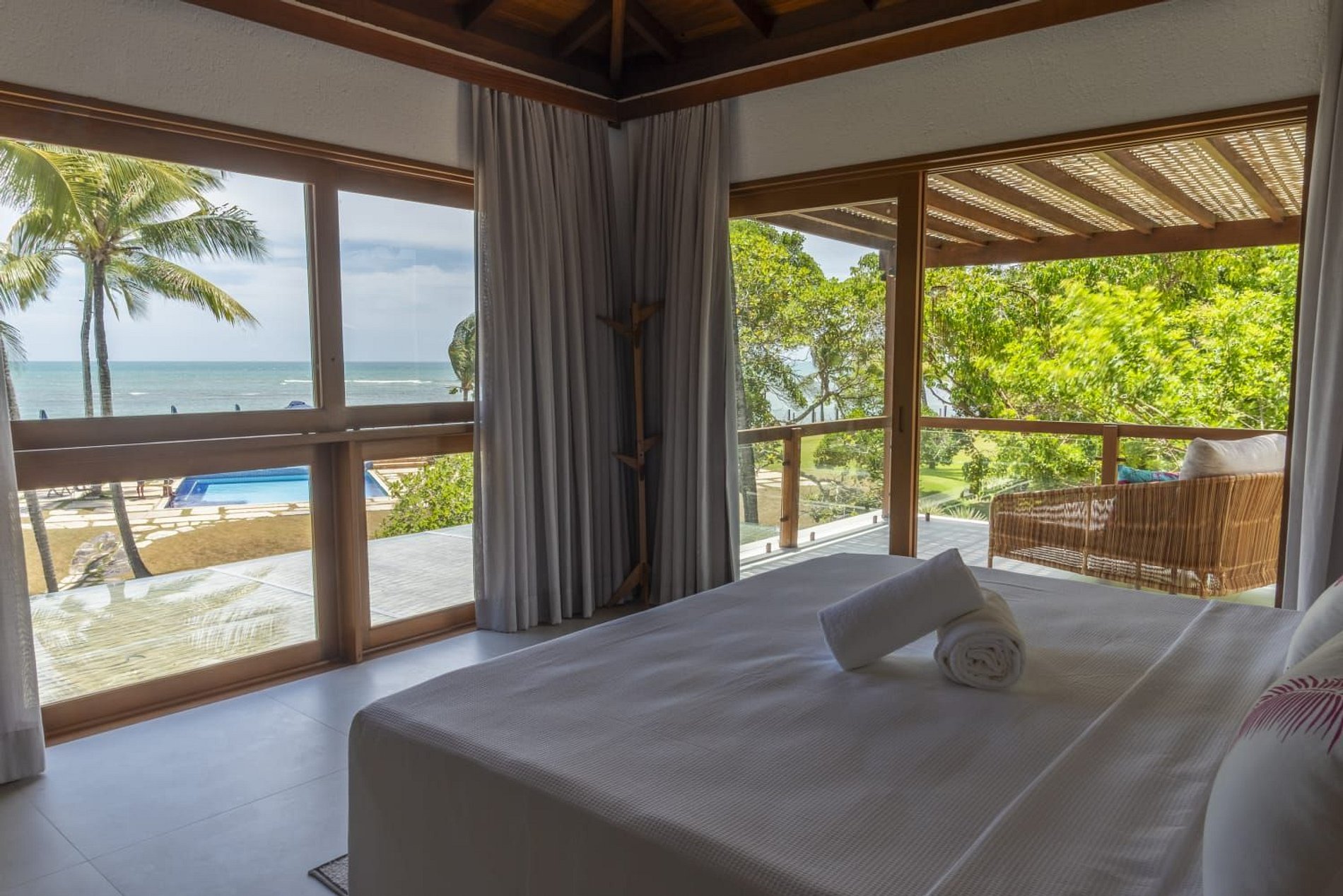 A casa conta com um charmoso deck de madeira integrado ao jardim, perfeito para momentos de descanso e contemplação da natureza. A varanda é ampla e equipada com sofás, poltronas e redes que convidam a relaxar enquanto a brisa do mar refresca o ambiente. O jardim gramado ao redor complementa a atmosfera tranquila e acolhedora.