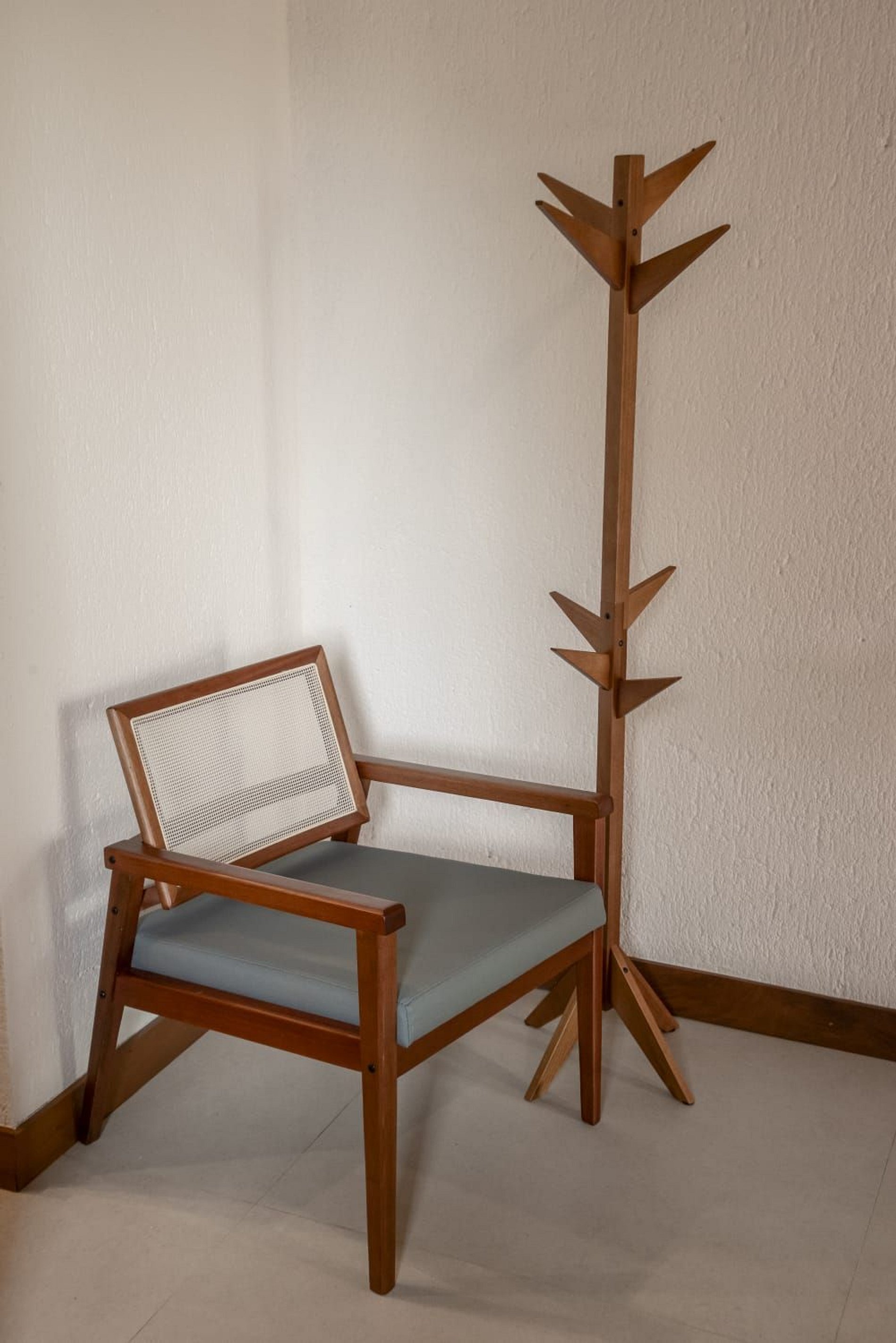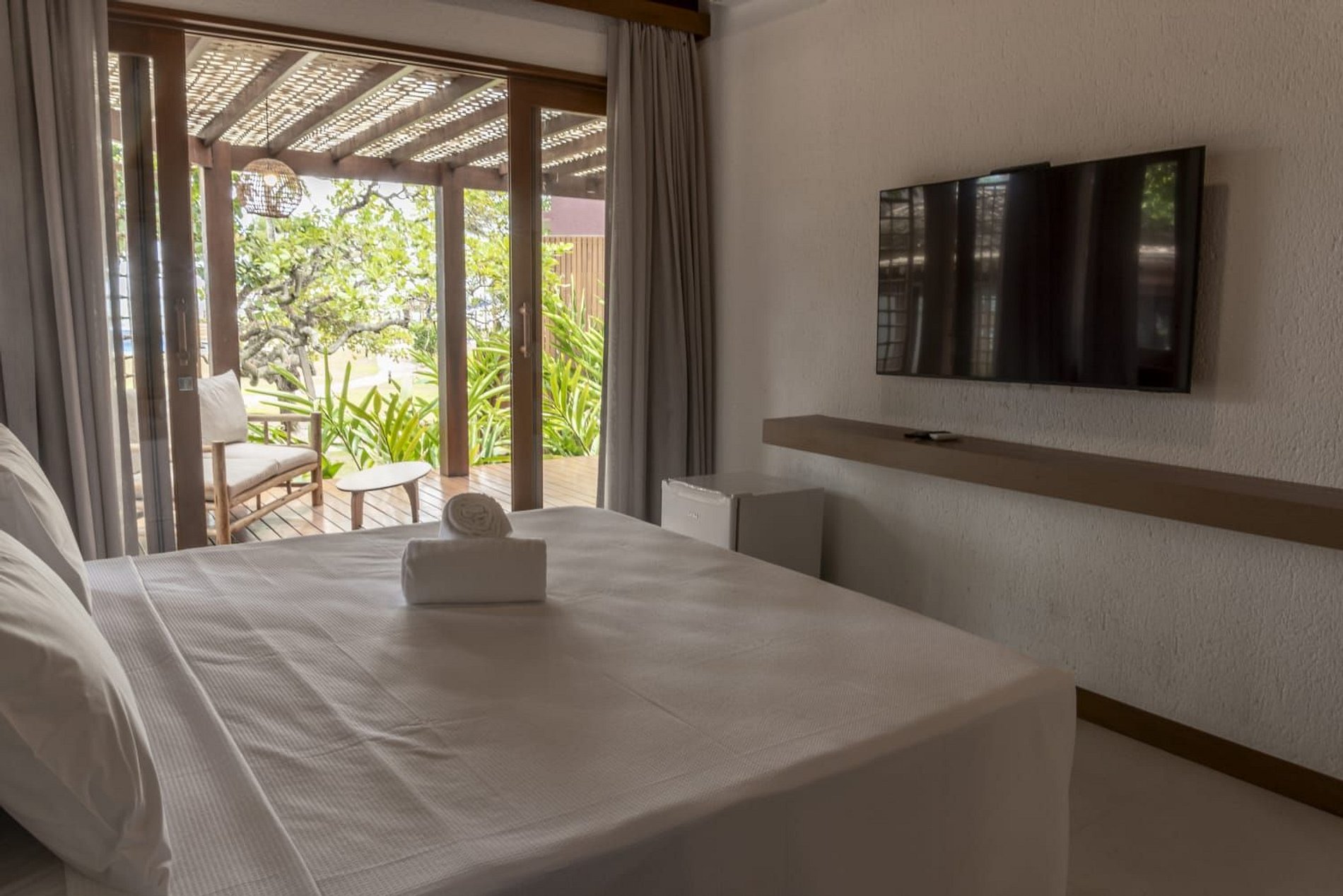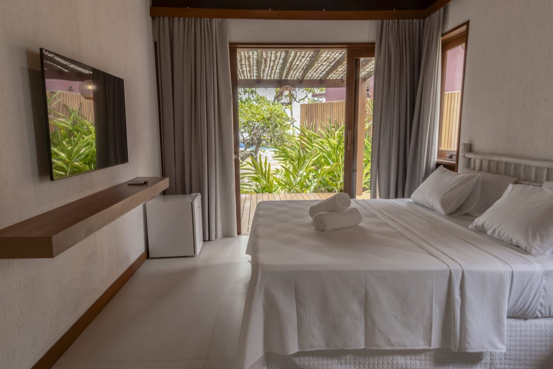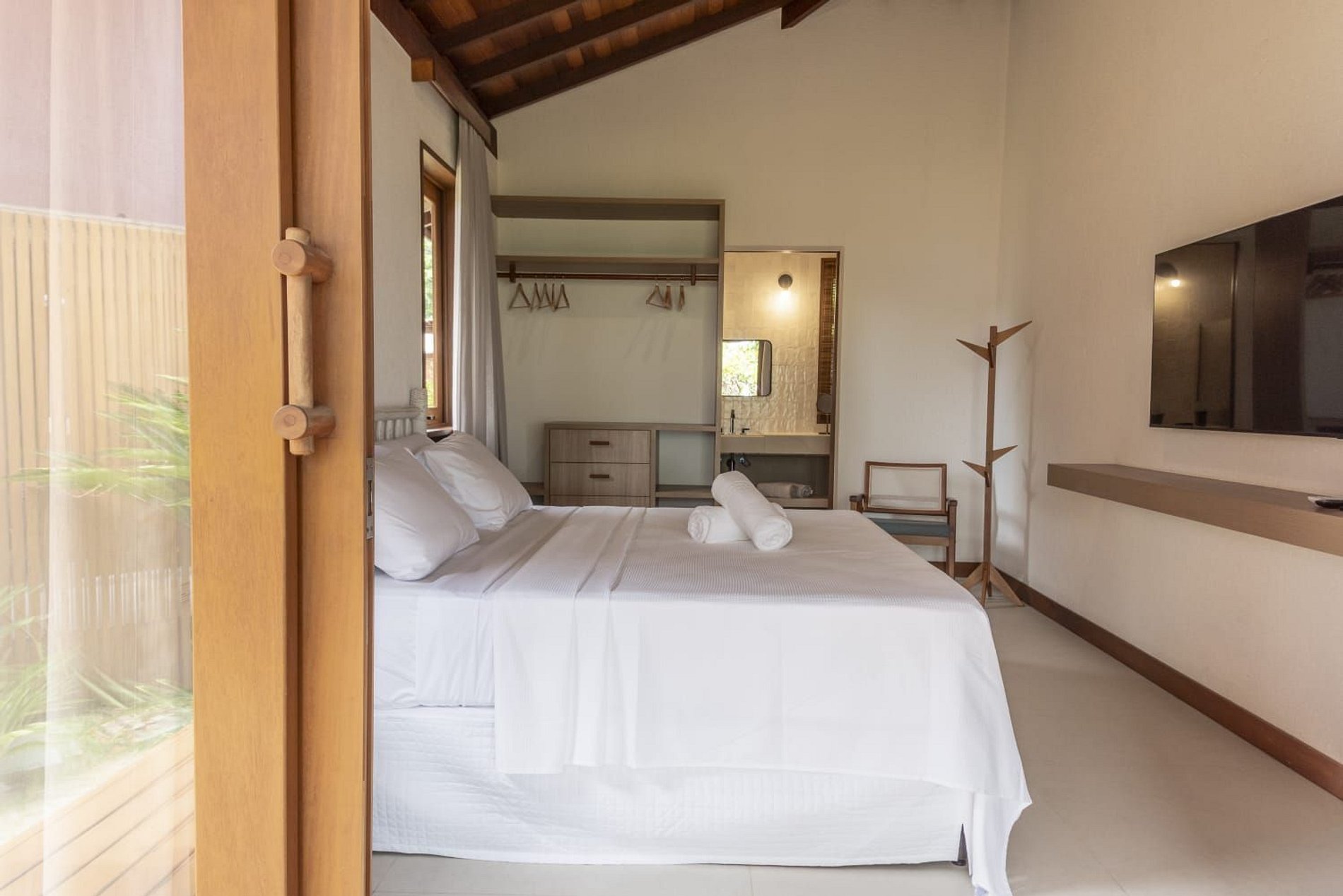 A casa conta com um charmoso deck de madeira integrado ao jardim, perfeito para momentos de descanso e contemplação da natureza. A varanda é ampla e equipada com sofás, poltronas e redes que convidam a relaxar enquanto a brisa do mar refresca o ambiente. O jardim gramado ao redor complementa a atmosfera tranquila e acolhedora.