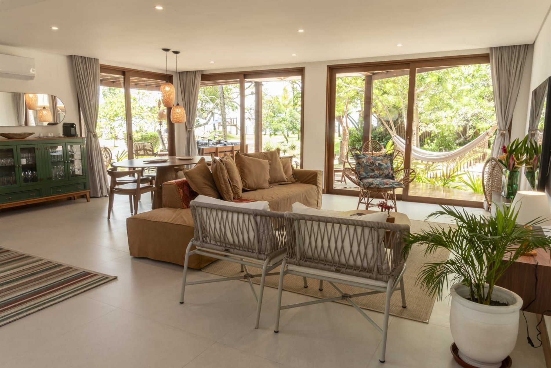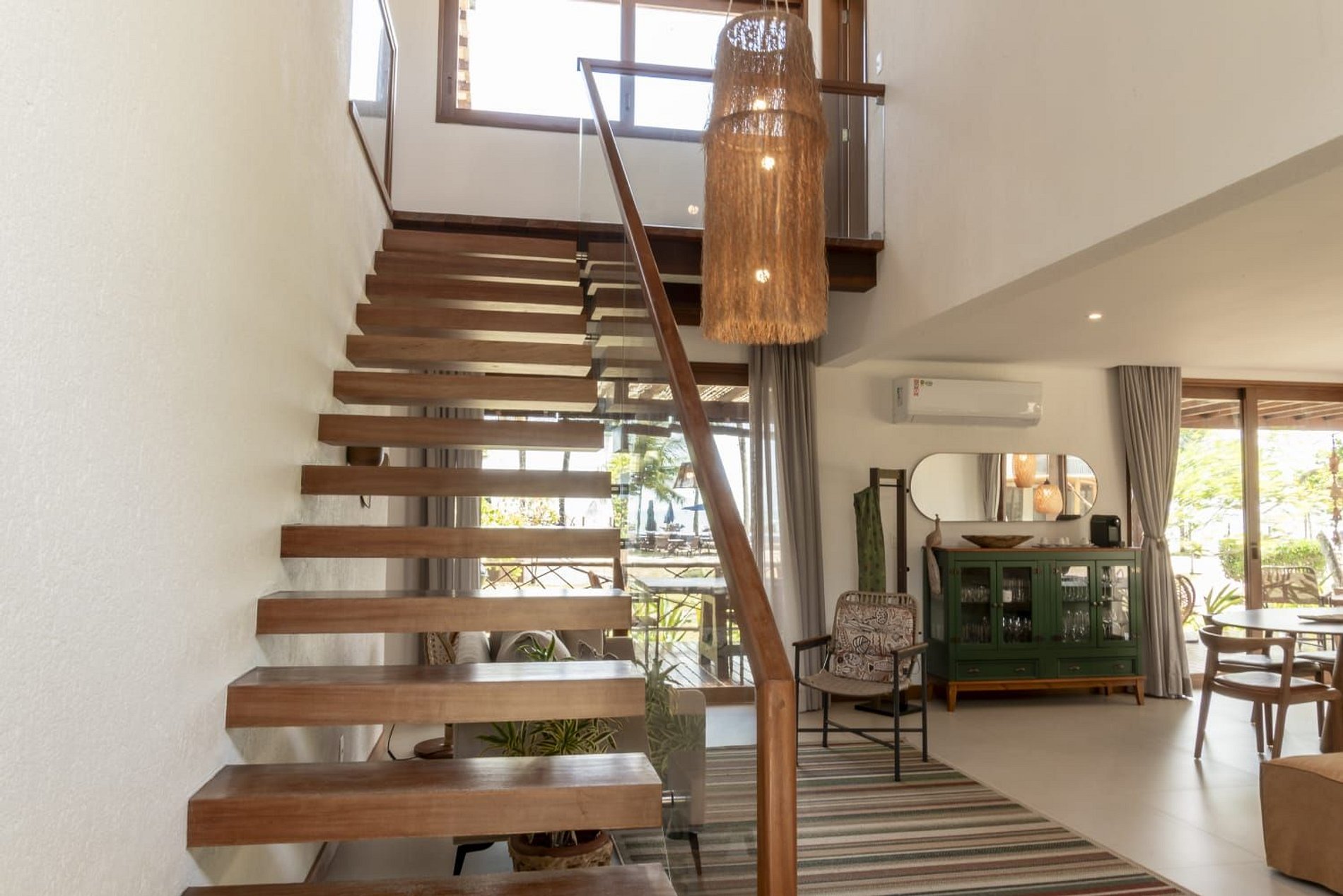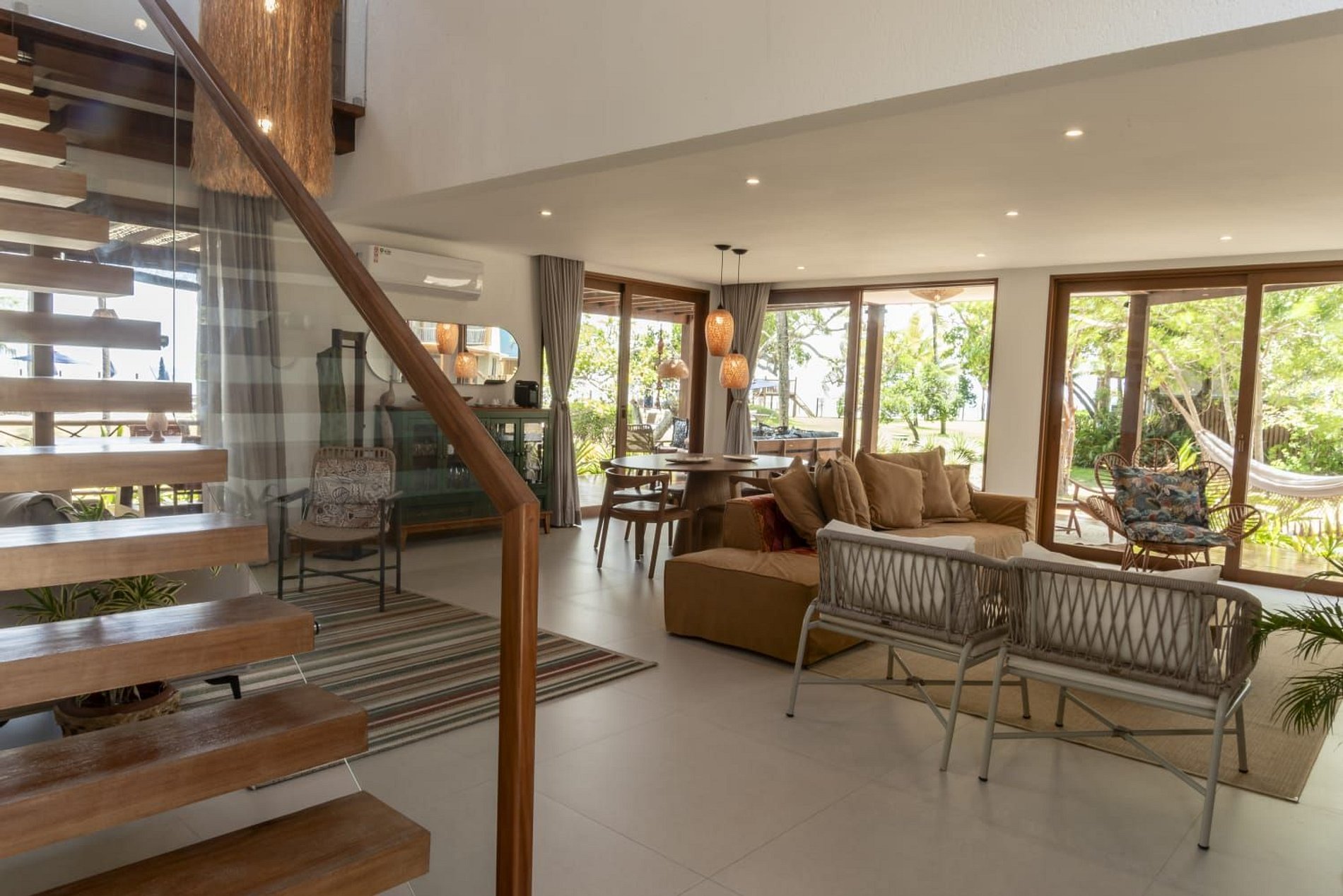 No térreo, os ambientes são integrados em um estilo moderno e acolhedor, com sala de estar e jantar amplas, lavabo e cozinha totalmente equipada. Todos os espaços são climatizados, garantindo máximo conforto para os hóspedes.