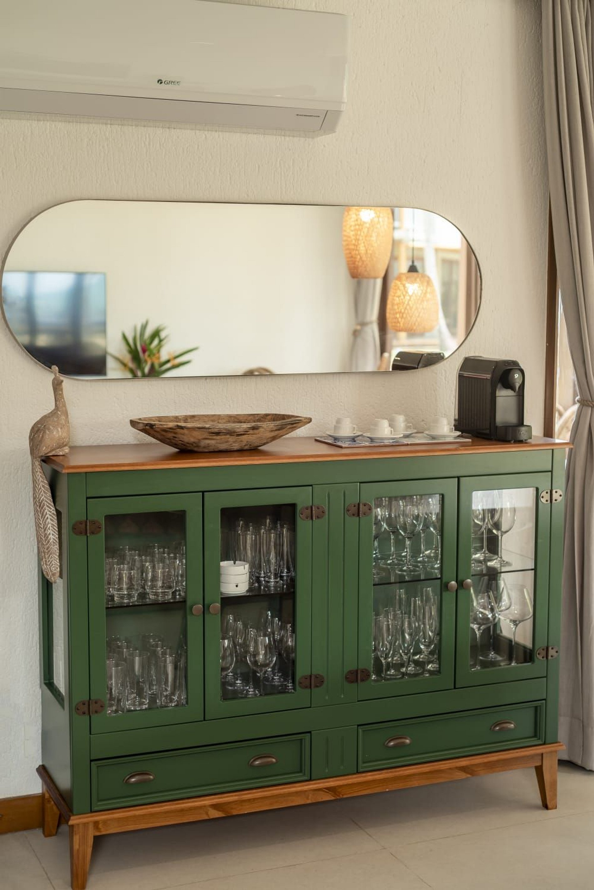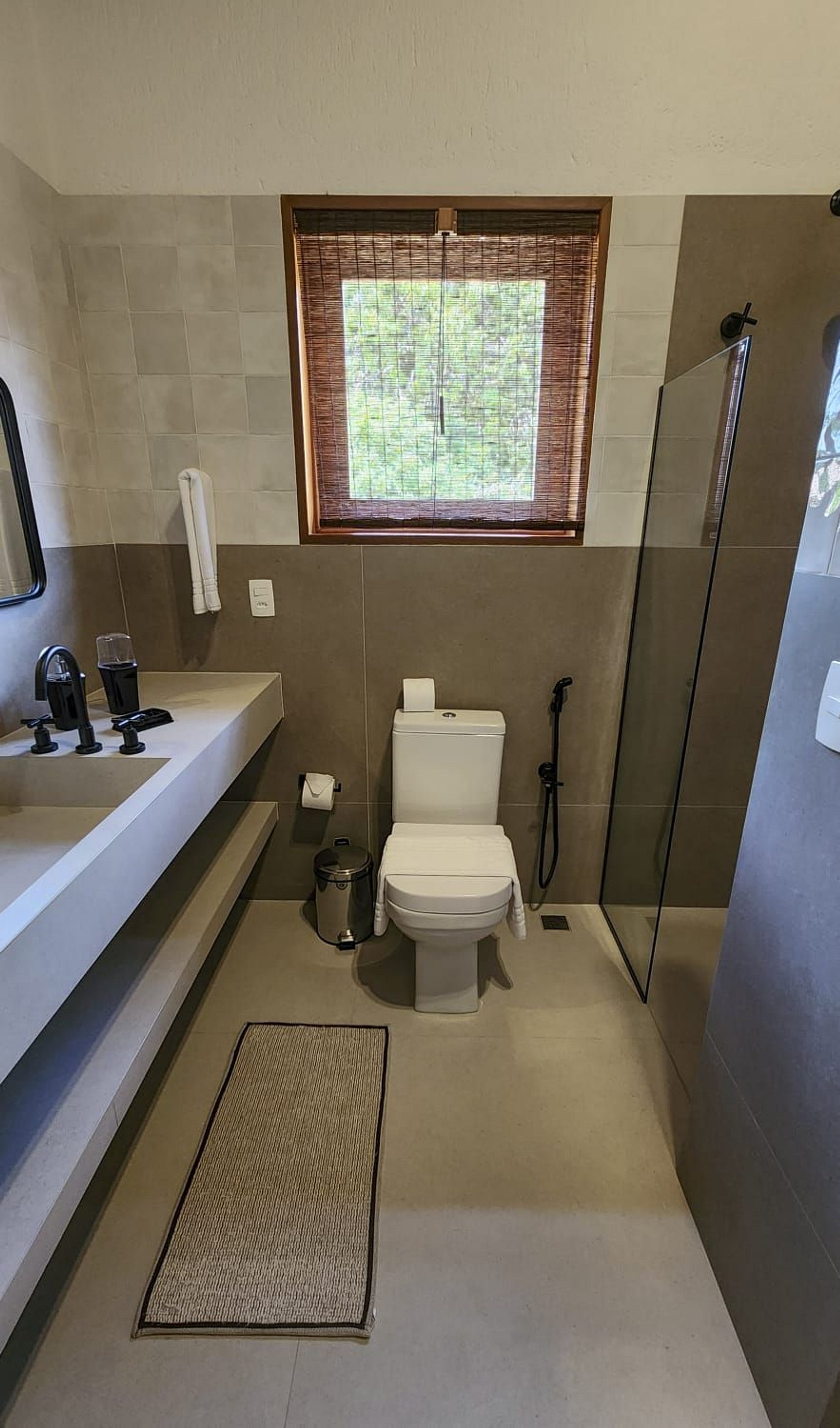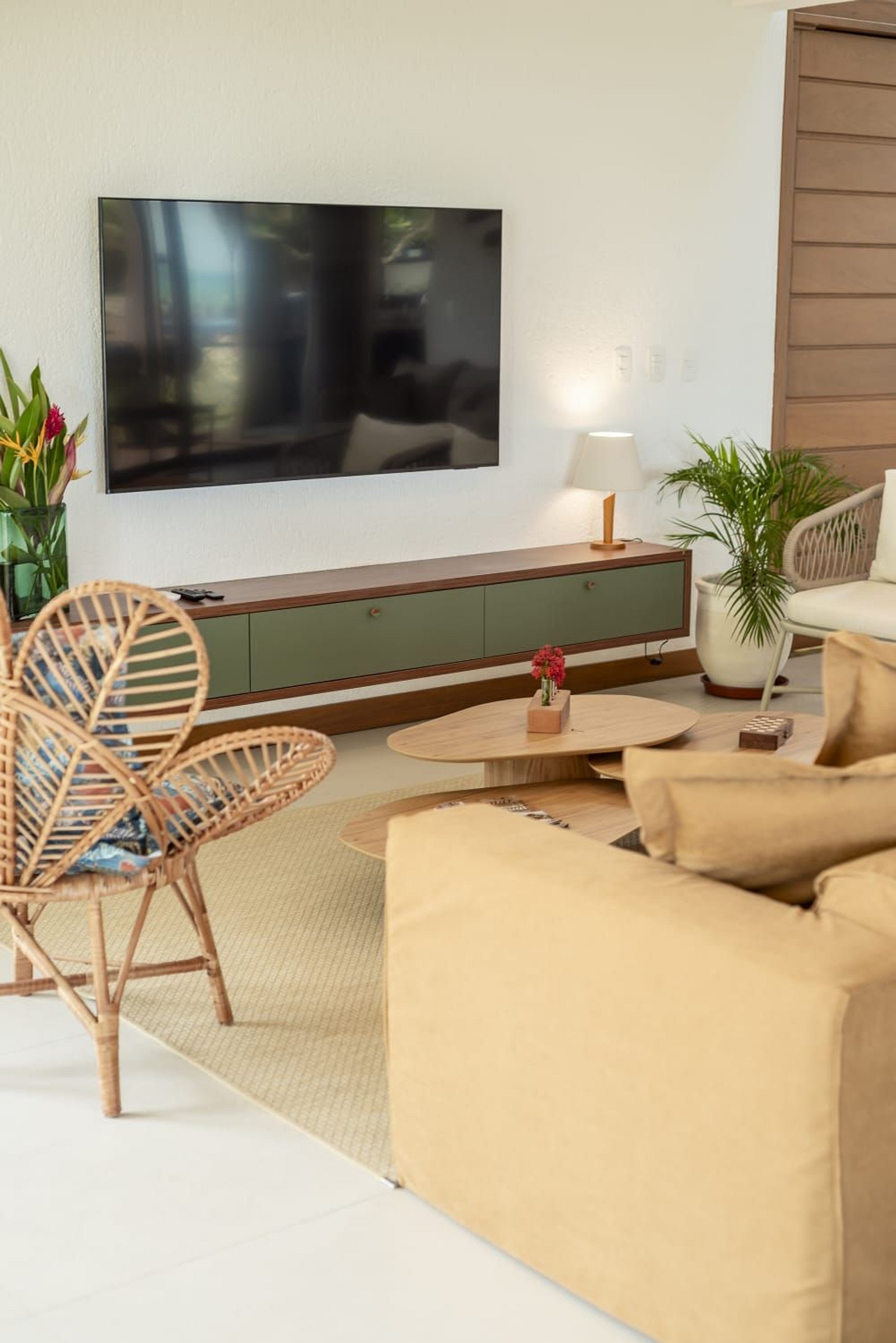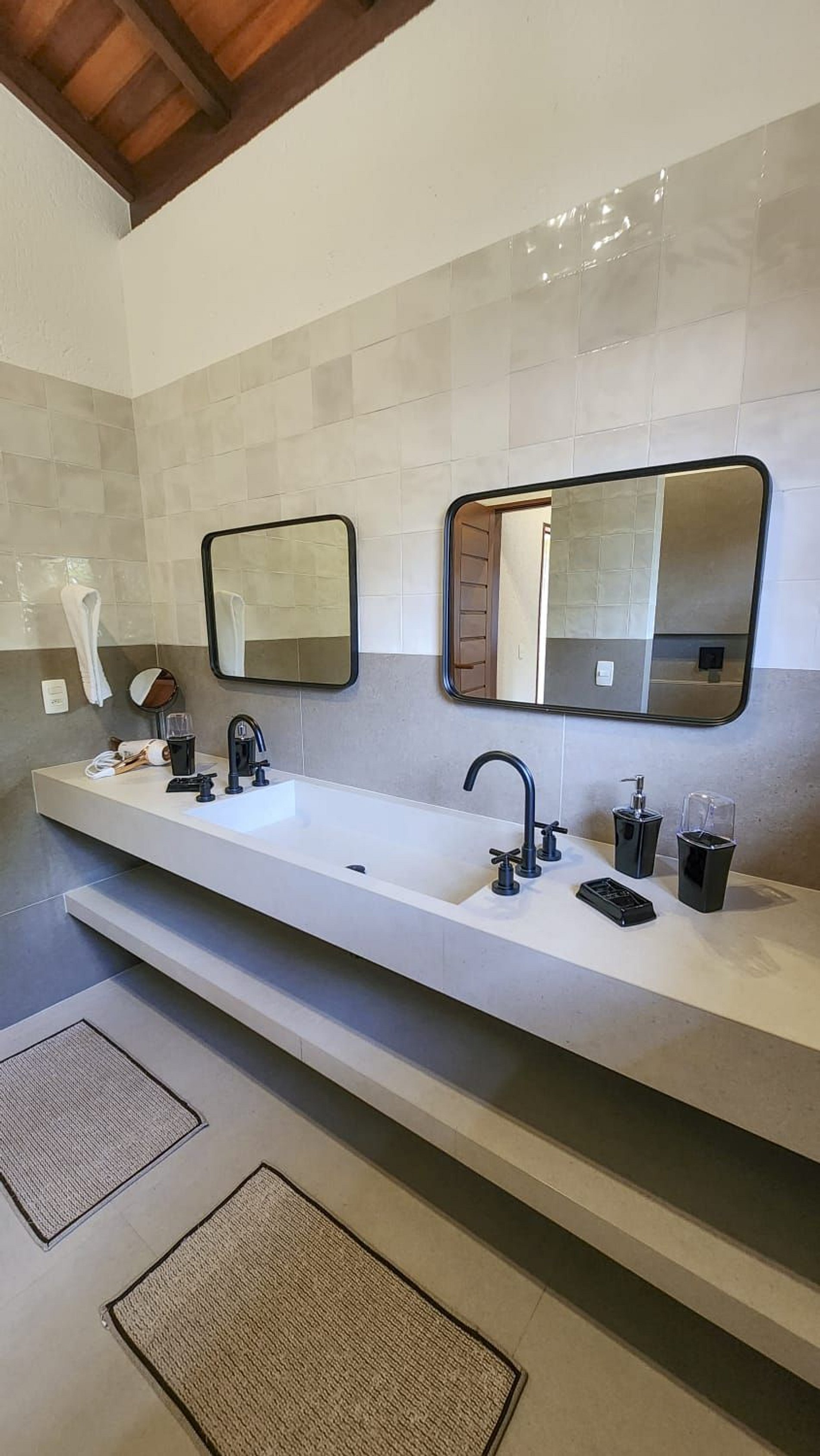 No térreo, os ambientes são integrados em um estilo moderno e acolhedor, com sala de estar e jantar amplas, lavabo e cozinha totalmente equipada. Todos os espaços são climatizados, garantindo máximo conforto para os hóspedes.
