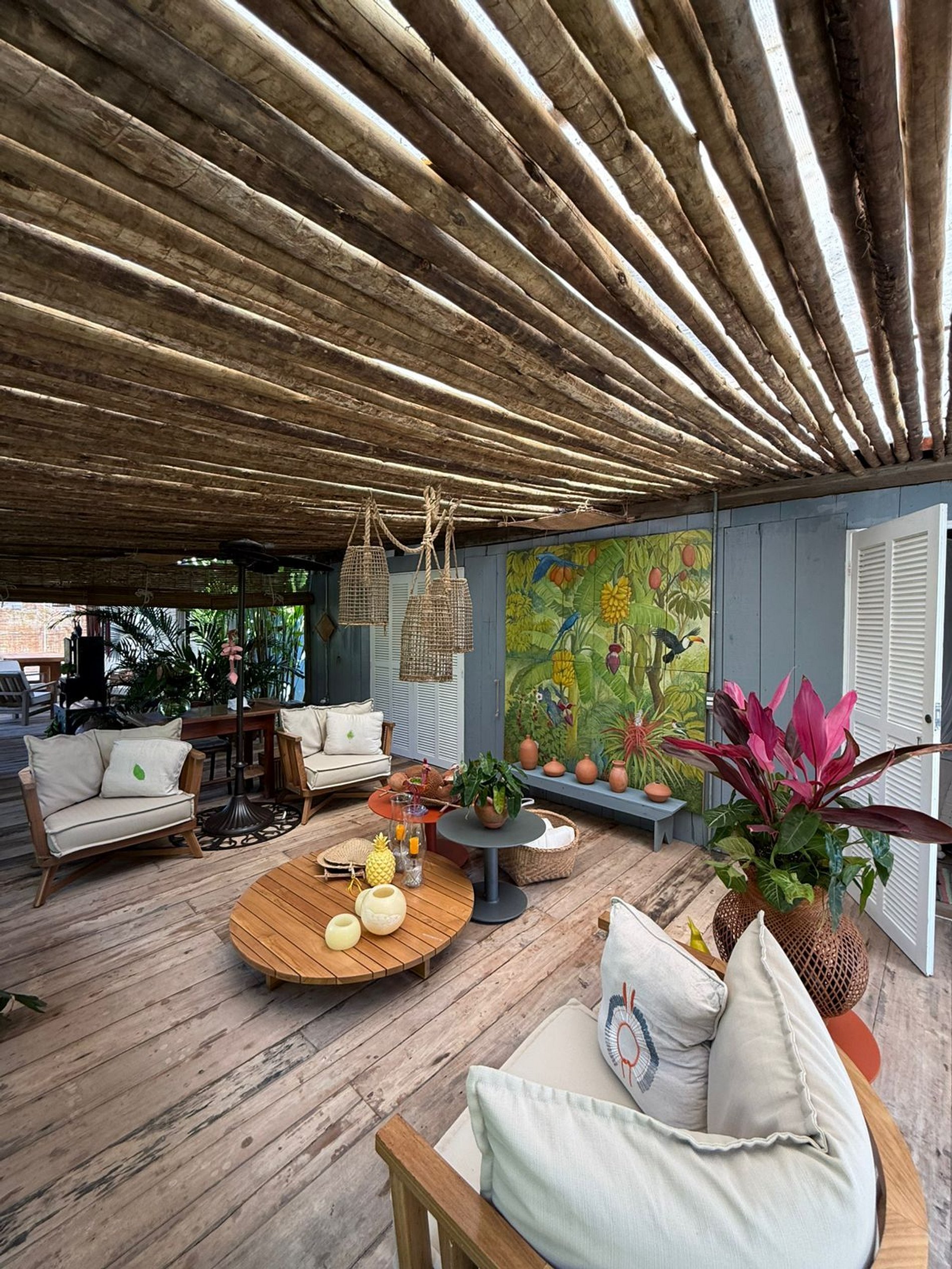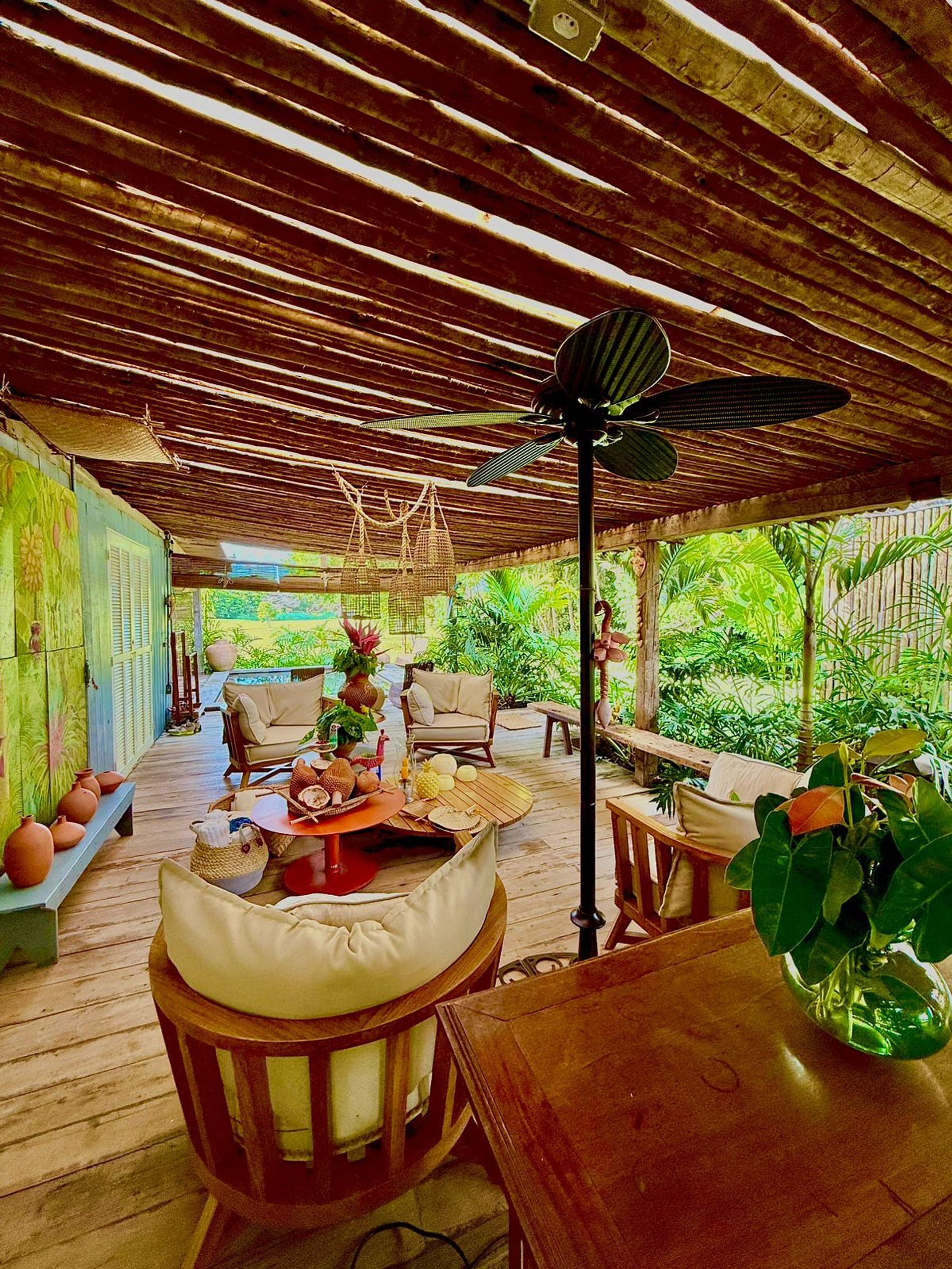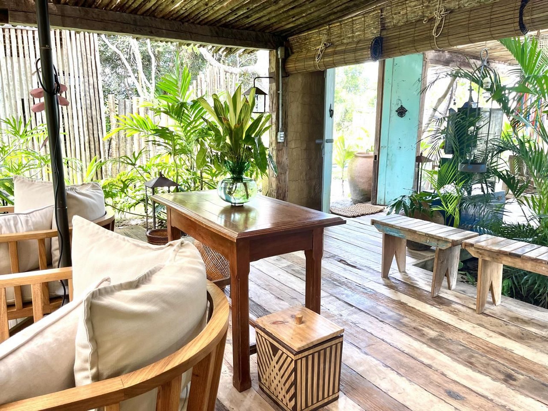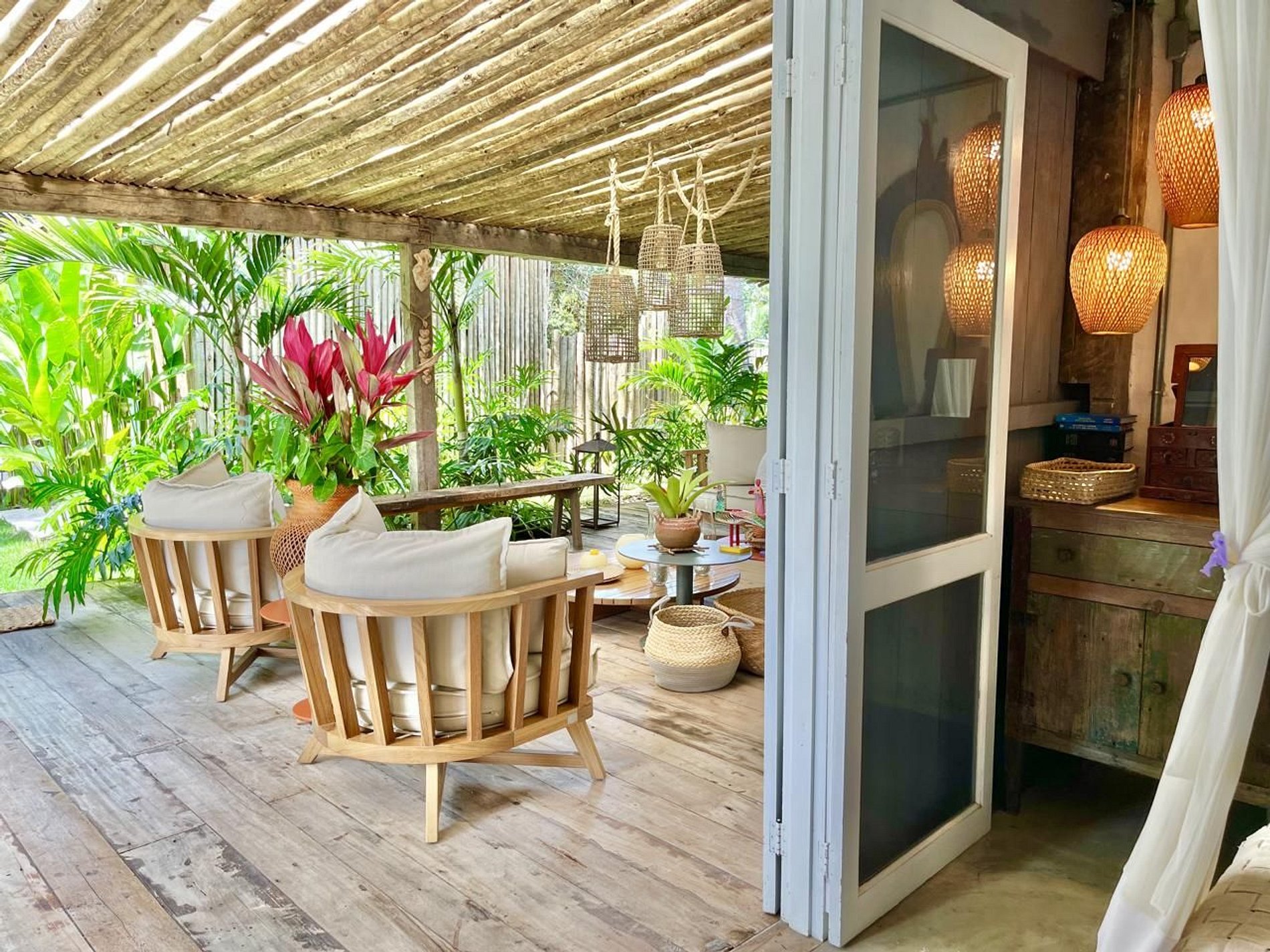 Os ambientes internos seguem o estilo rústico sofisticado, com integração total entre sala e varanda, além de uma decoração cheia de personalidade. A madeira, os elementos naturais e os detalhes tropicais criam uma atmosfera acolhedora e autêntica.