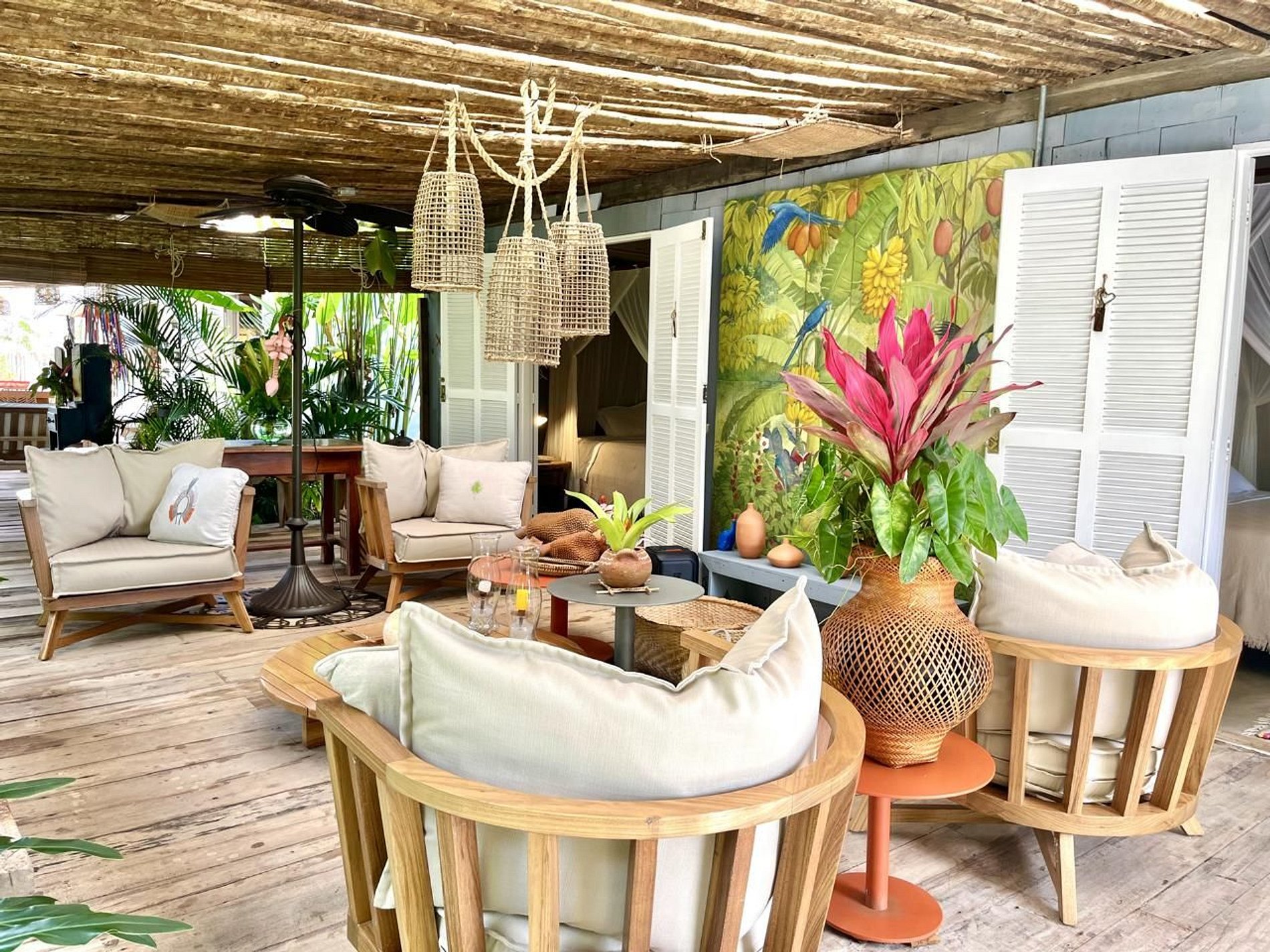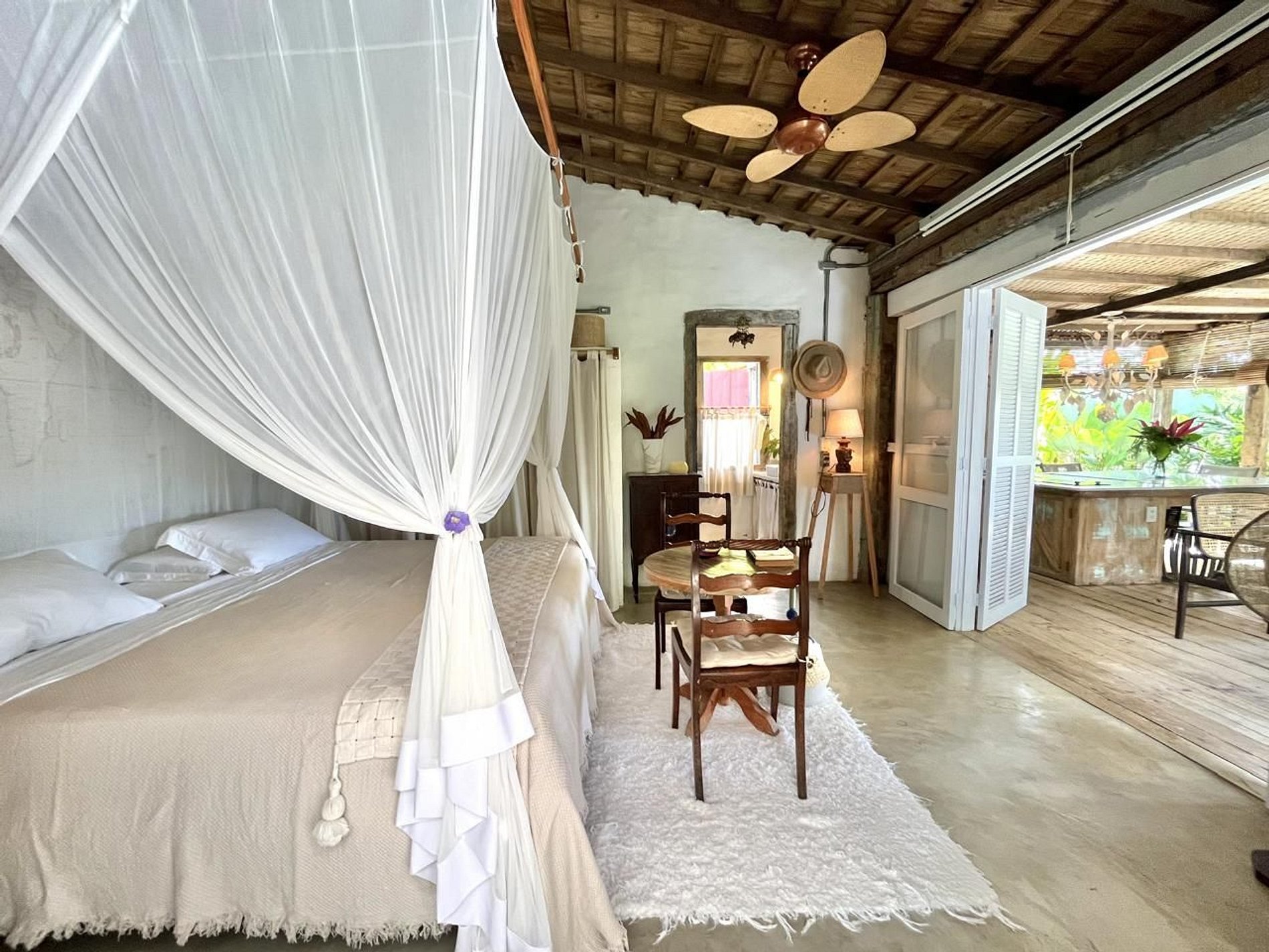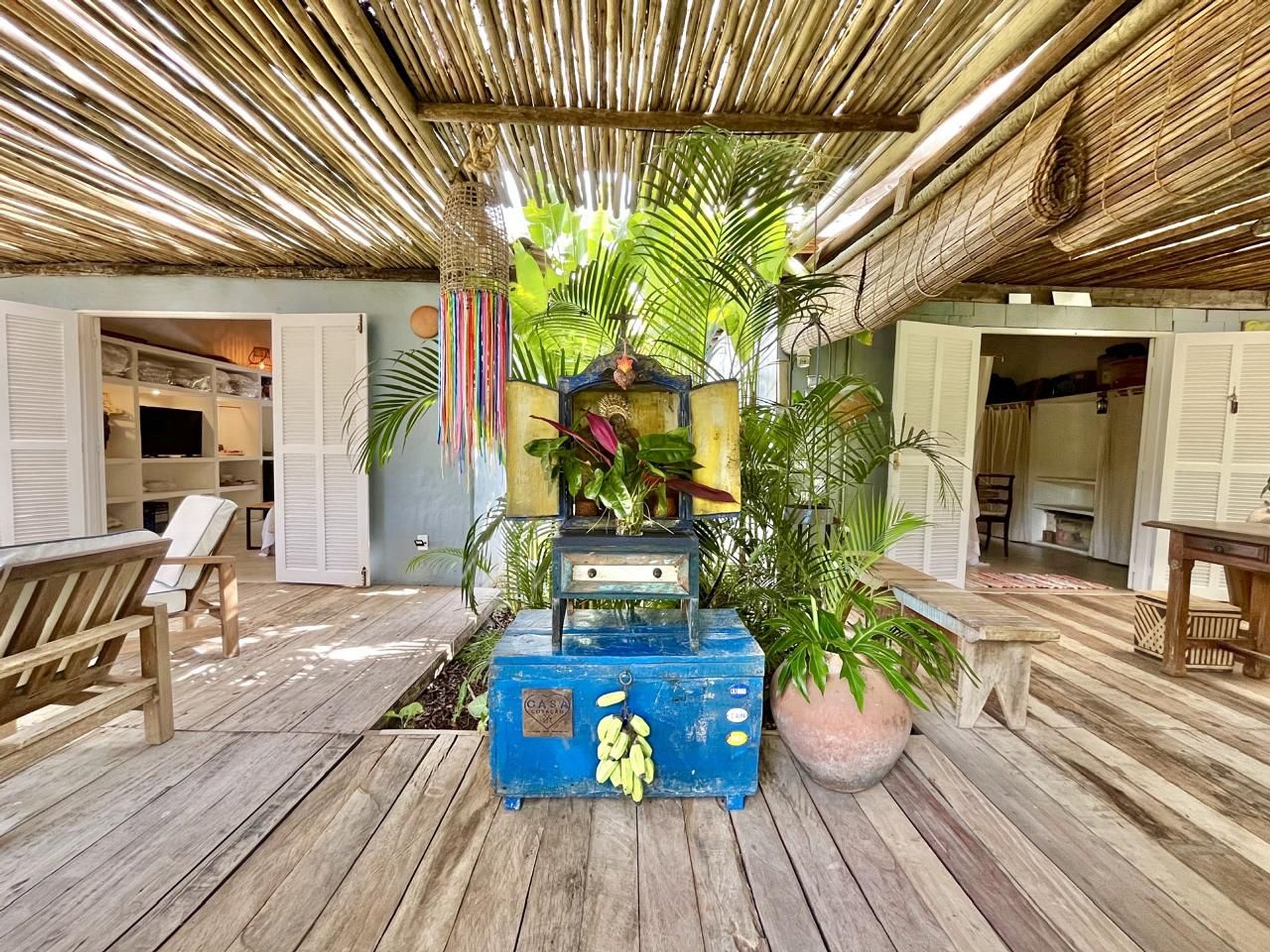 Os ambientes internos seguem o estilo rústico sofisticado, com integração total entre sala e varanda, além de uma decoração cheia de personalidade. A madeira, os elementos naturais e os detalhes tropicais criam uma atmosfera acolhedora e autêntica.