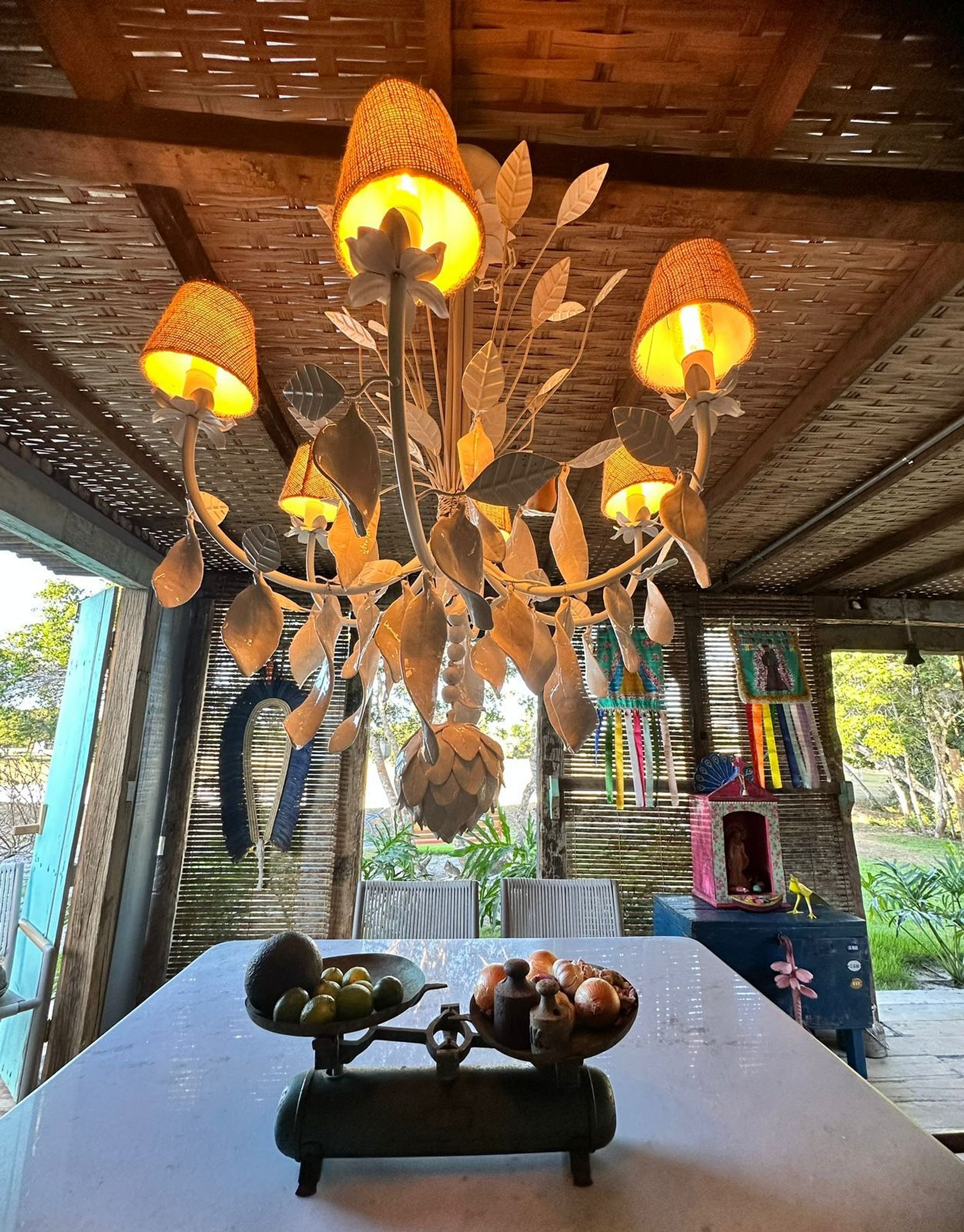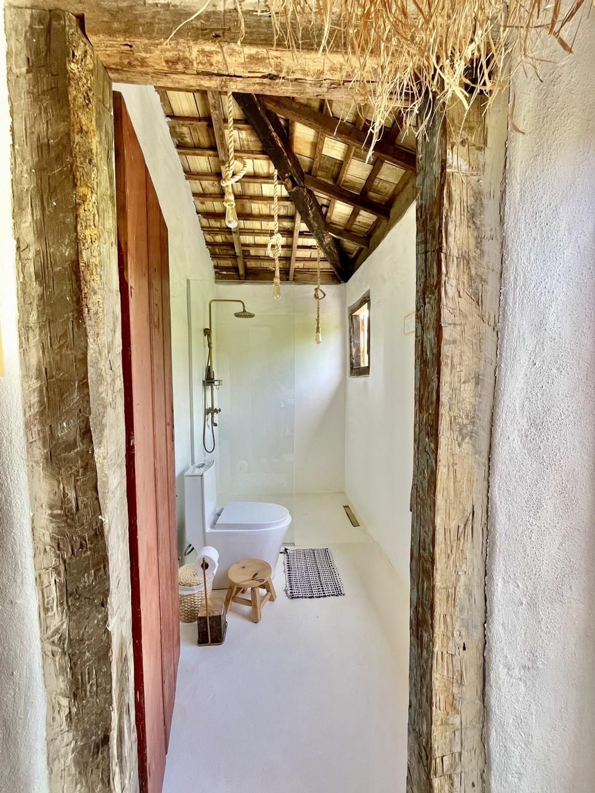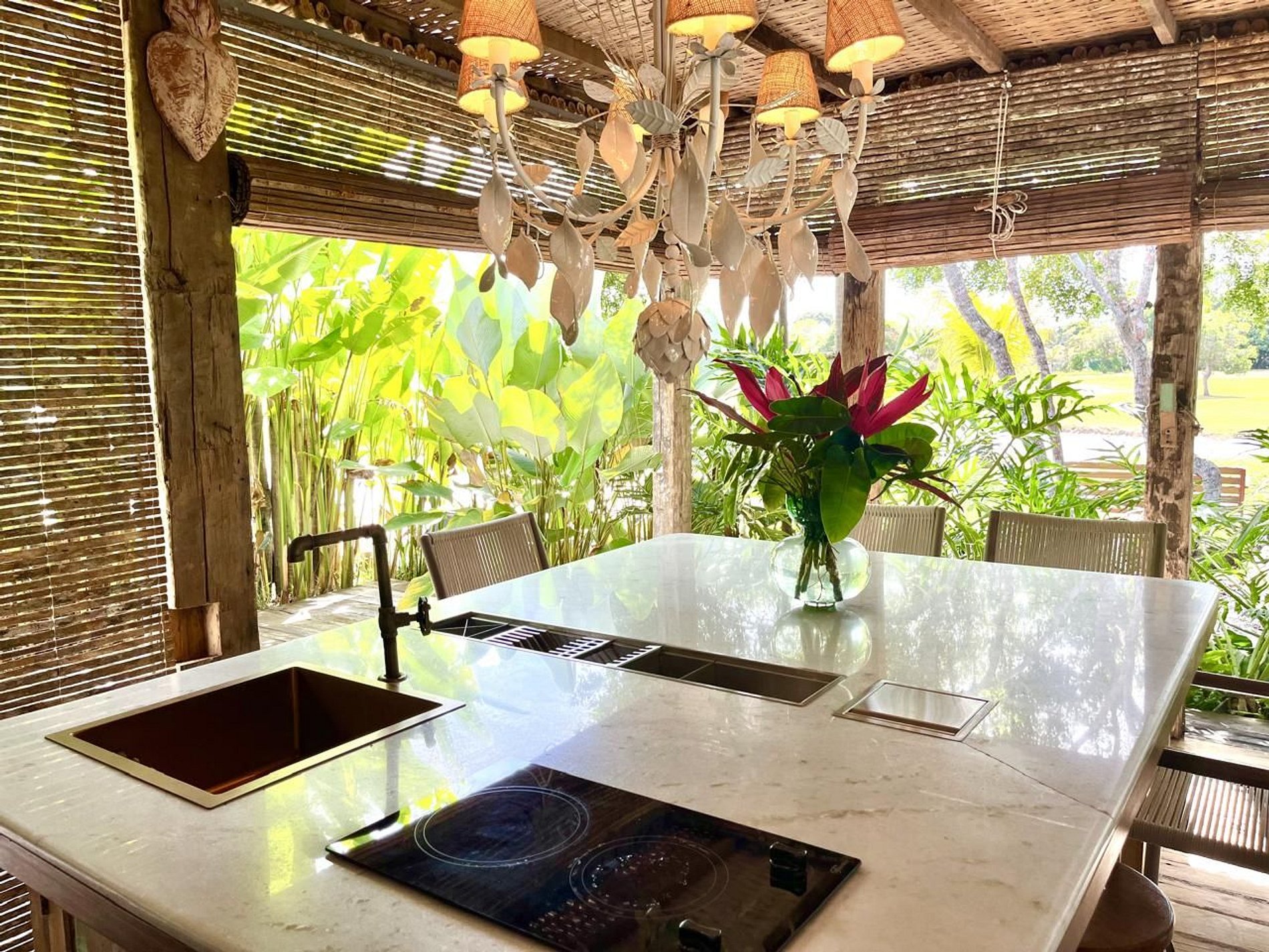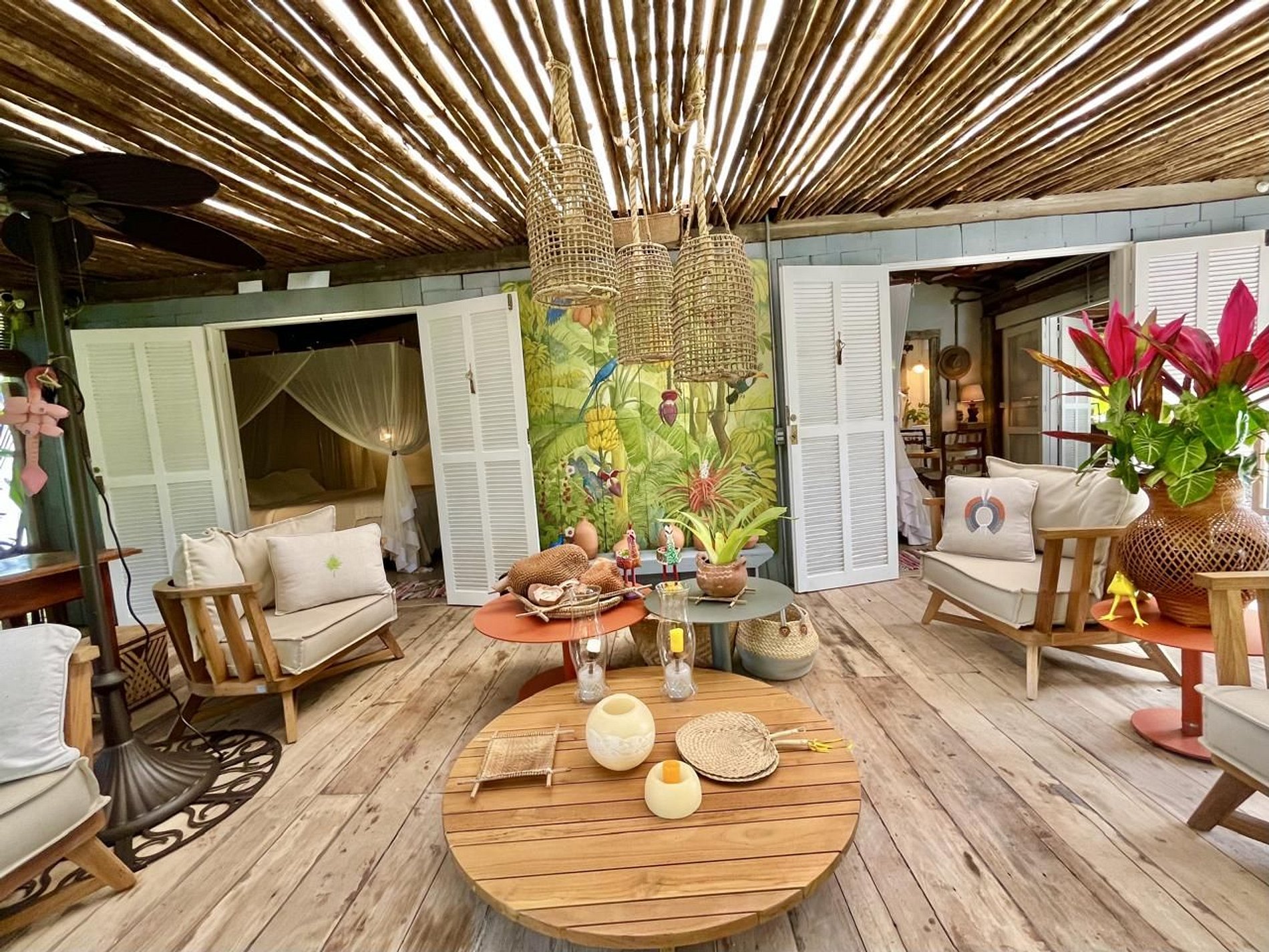 Os ambientes internos seguem o estilo rústico sofisticado, com integração total entre sala e varanda, além de uma decoração cheia de personalidade. A madeira, os elementos naturais e os detalhes tropicais criam uma atmosfera acolhedora e autêntica.