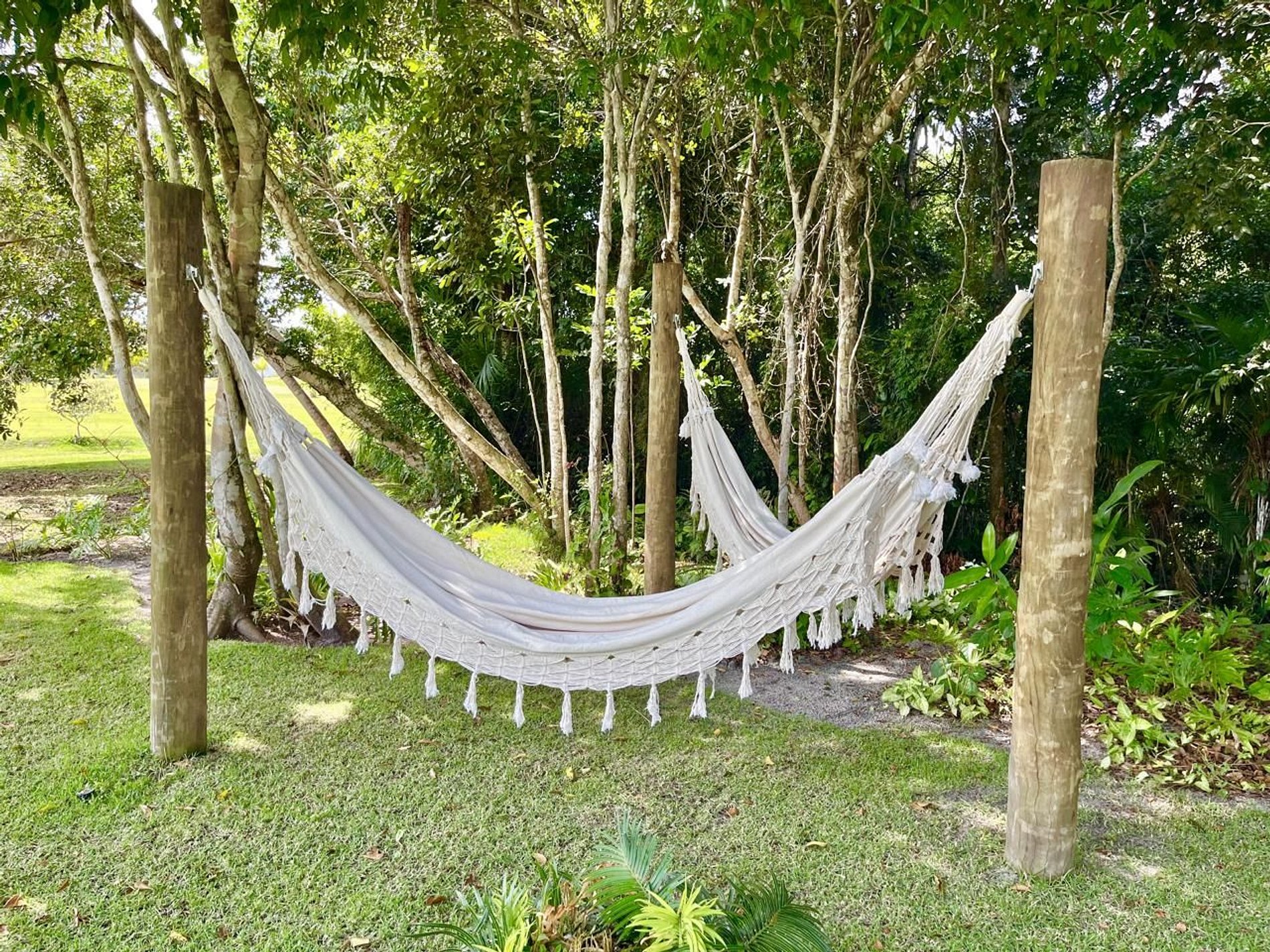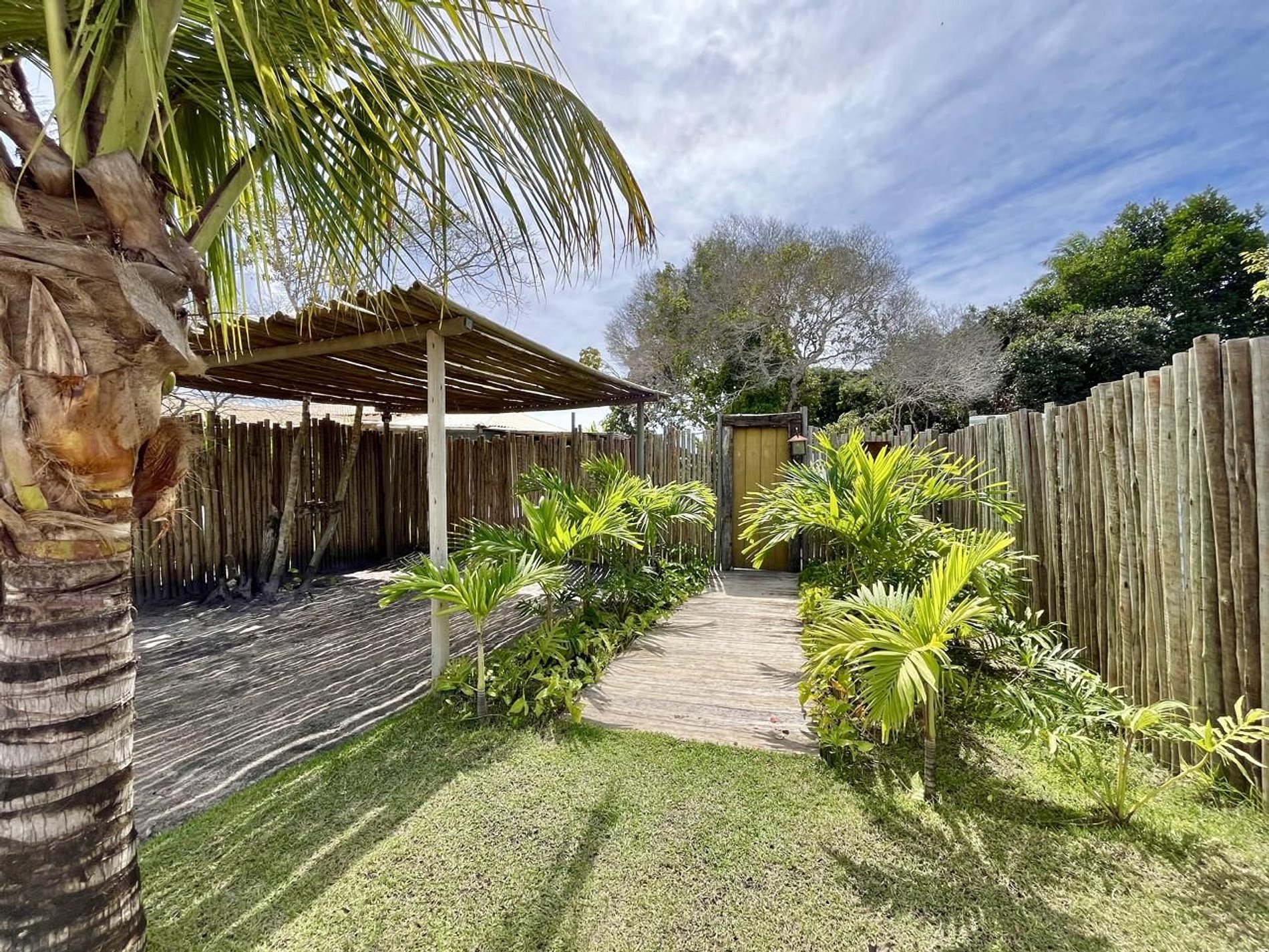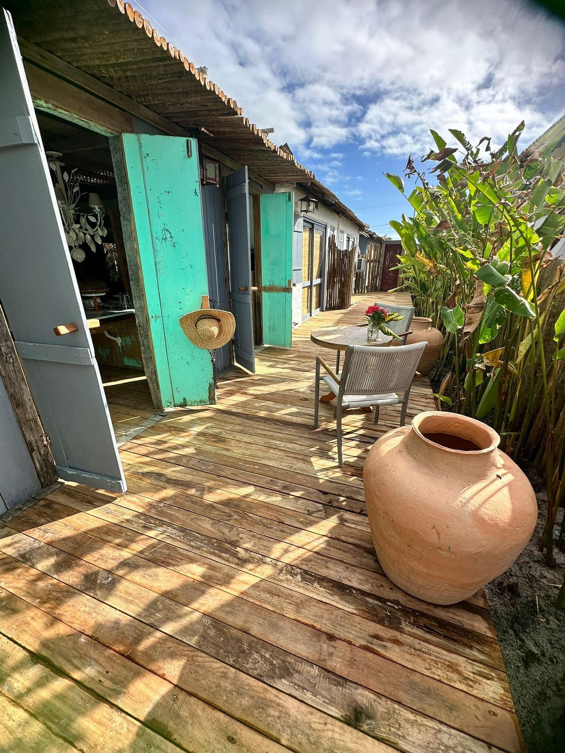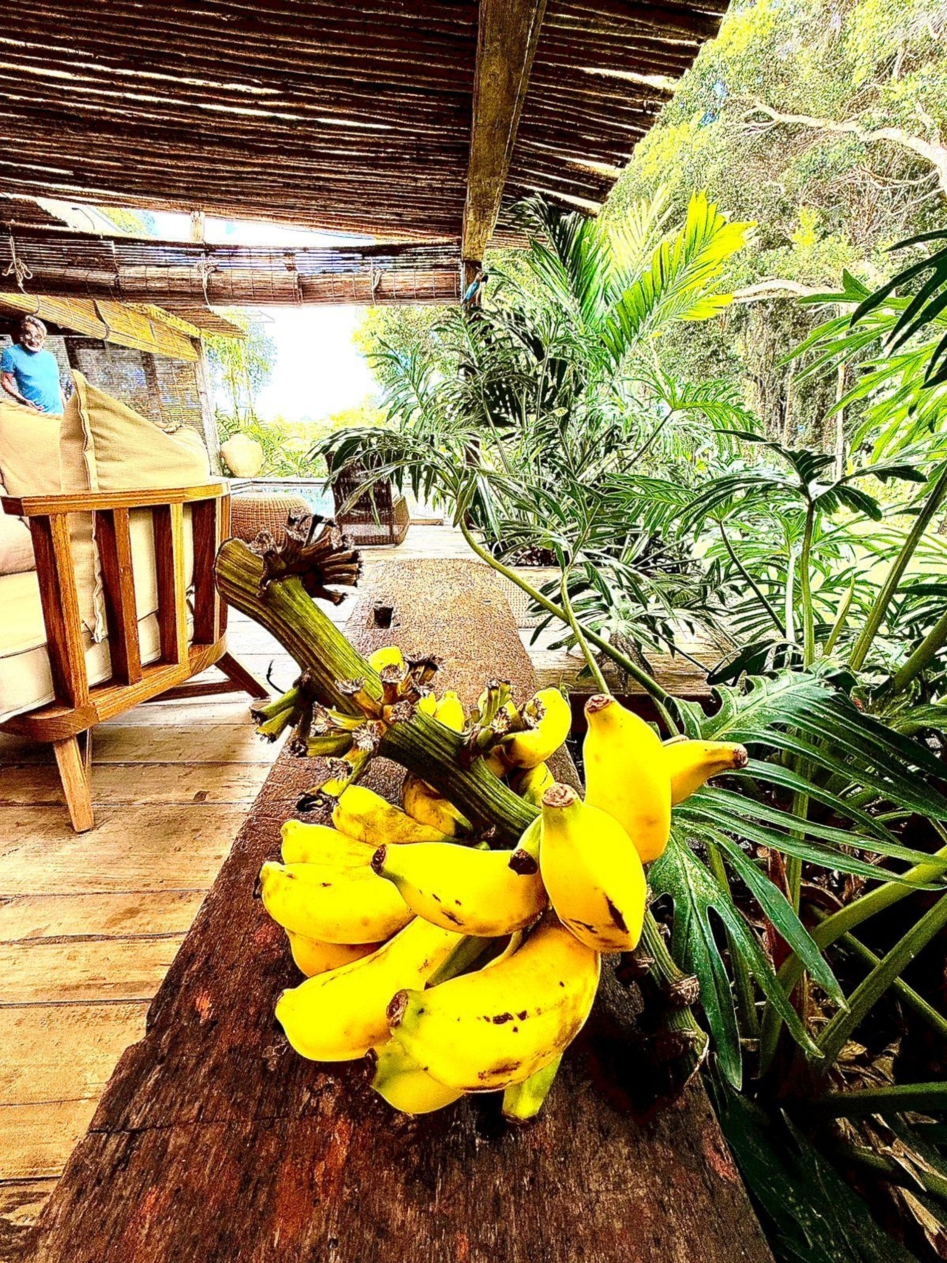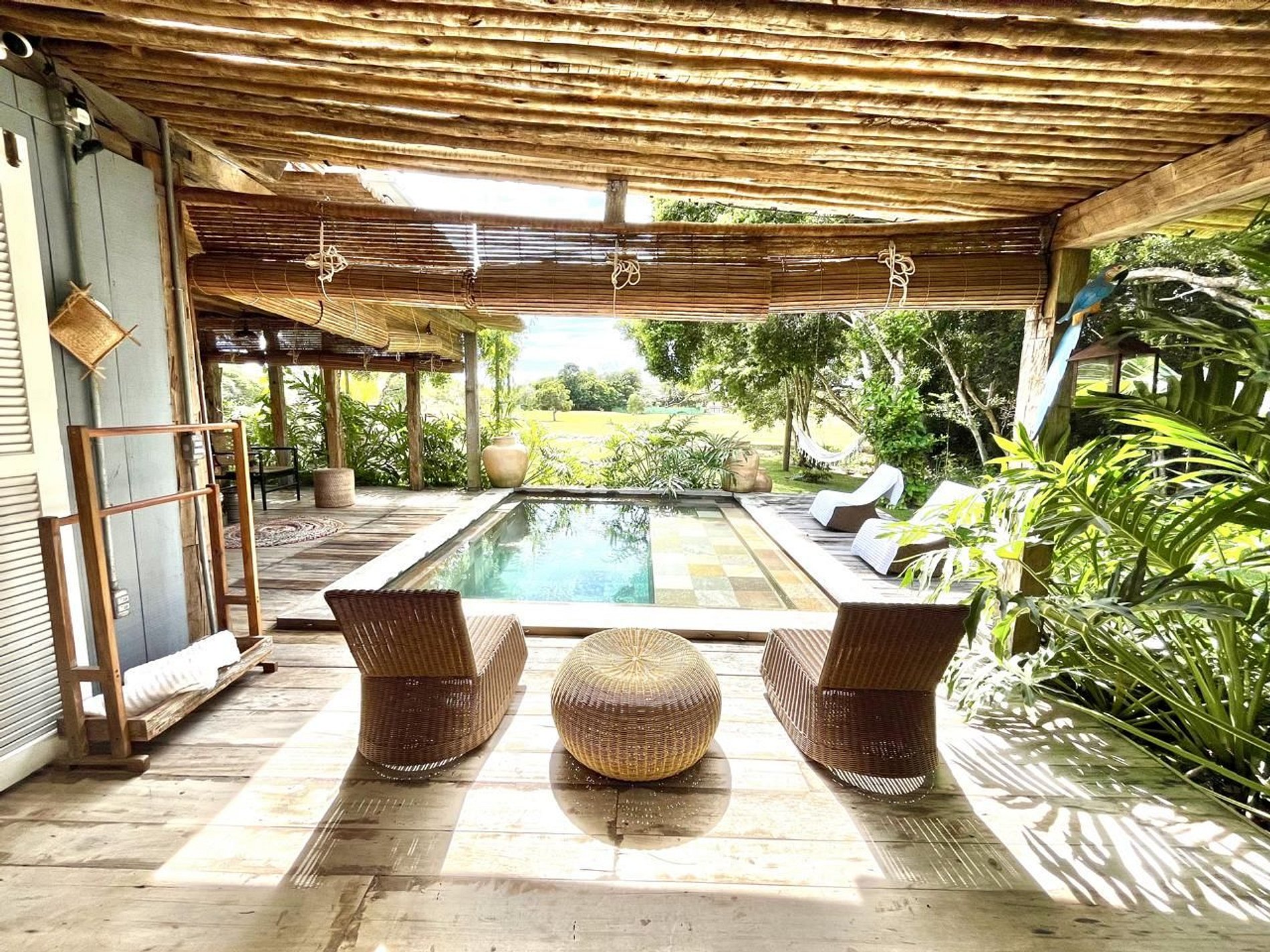 A varanda rústica com cobertura de madeira é um convite ao descanso, cercada por sofás confortáveis, redes e decoração que mistura estilo tropical e artesanal. Um espaço perfeito para receber amigos ou simplesmente contemplar a tranquilidade da região.