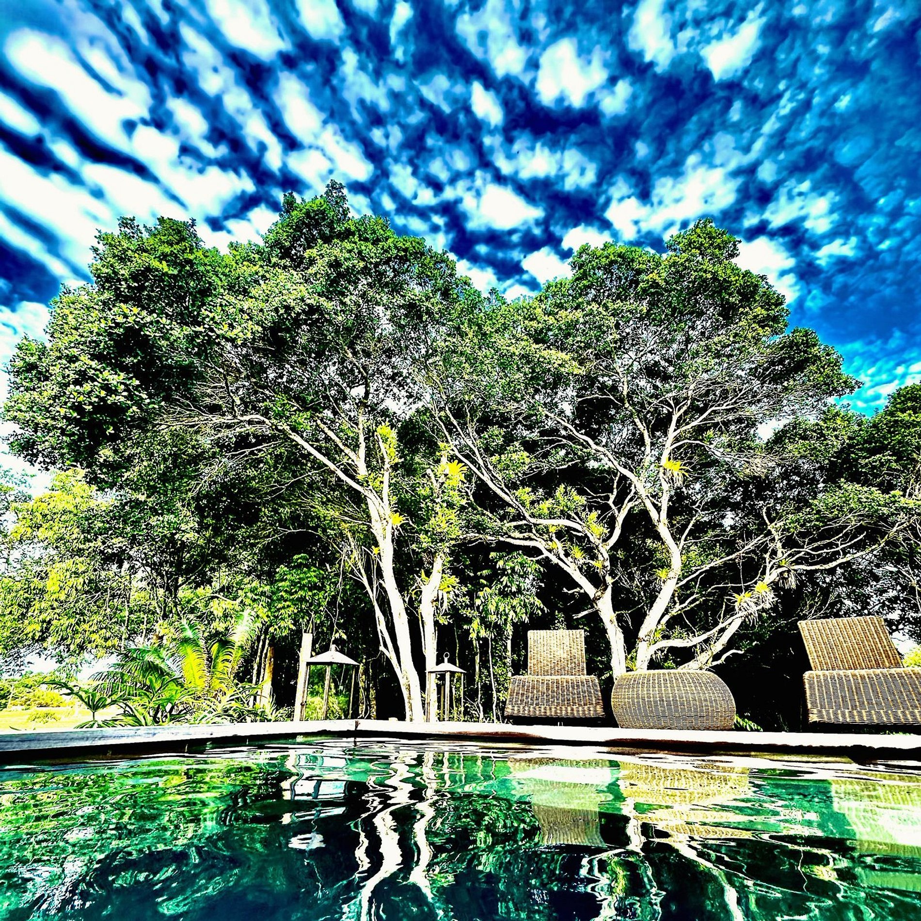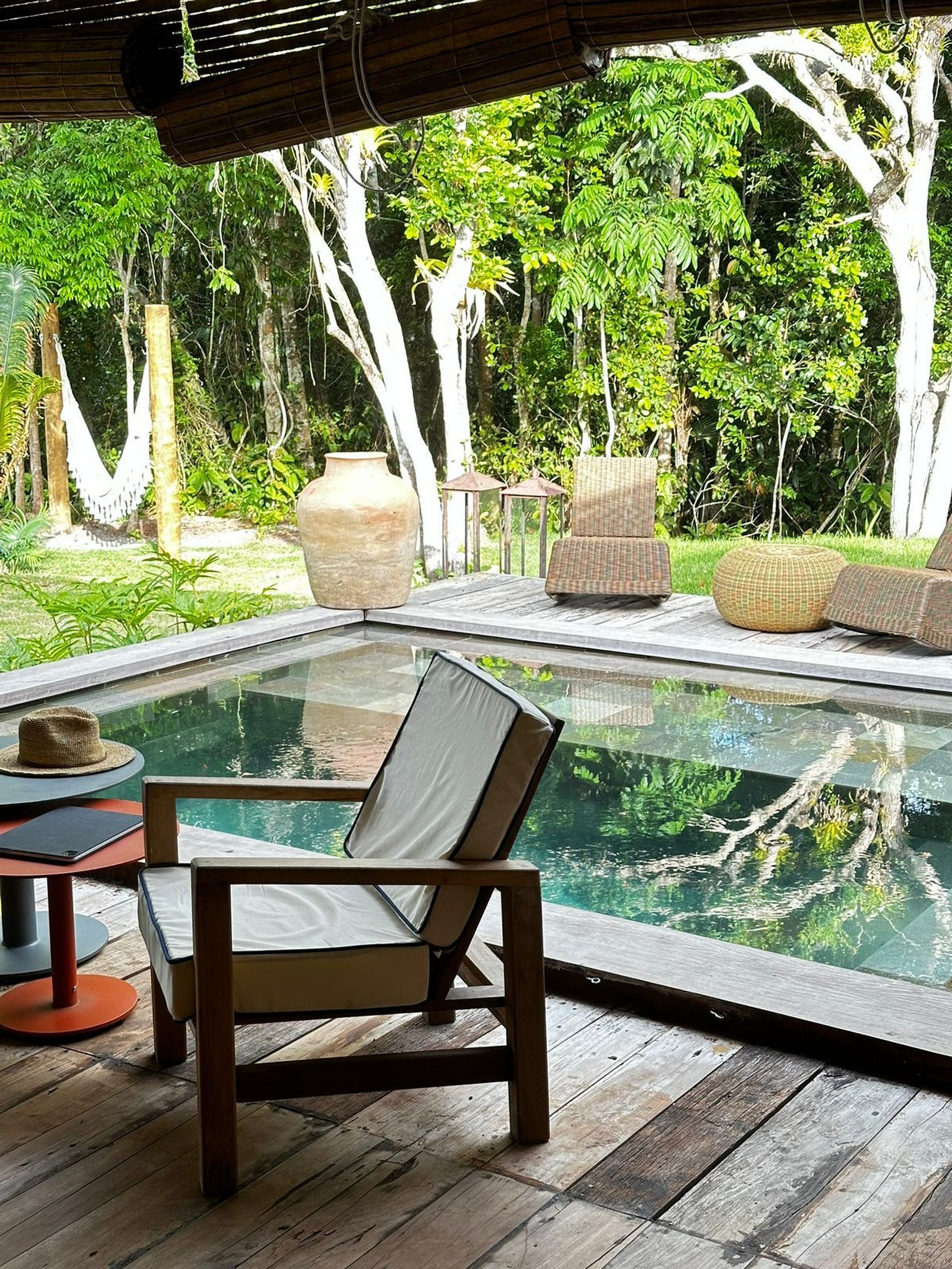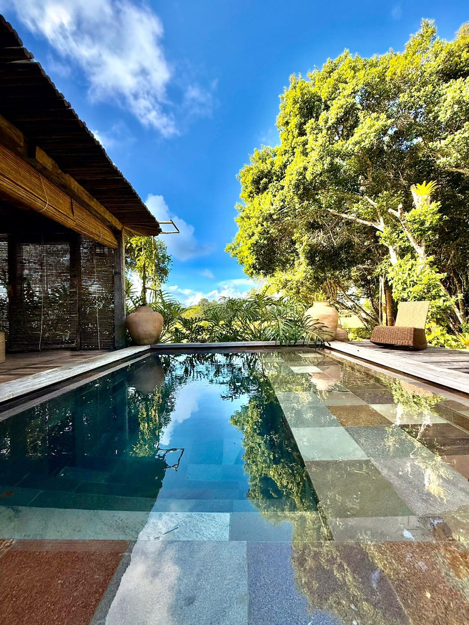 A piscina foi projetada para ser um refúgio de relaxamento, com acabamento único e cercada por muito verde, criando a sensação de estar em um verdadeiro paraíso natural.