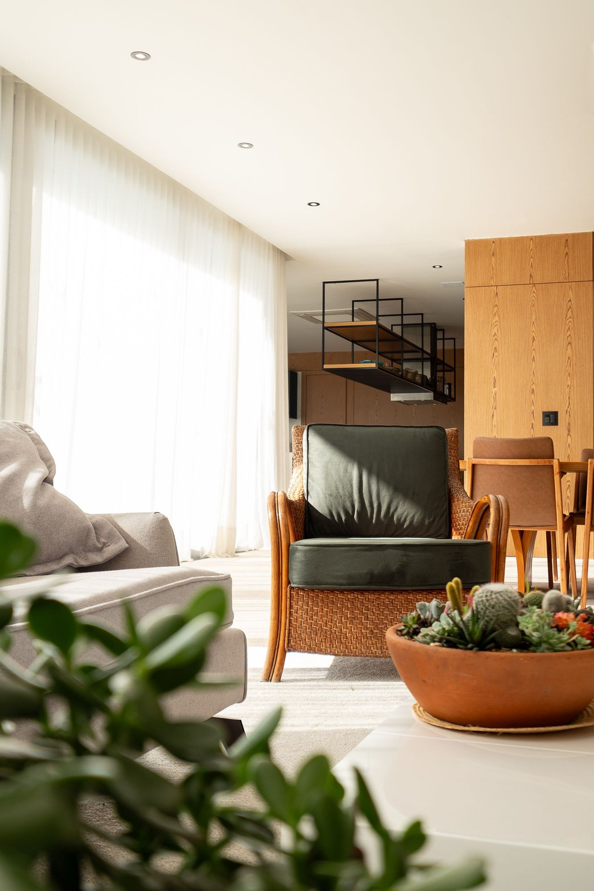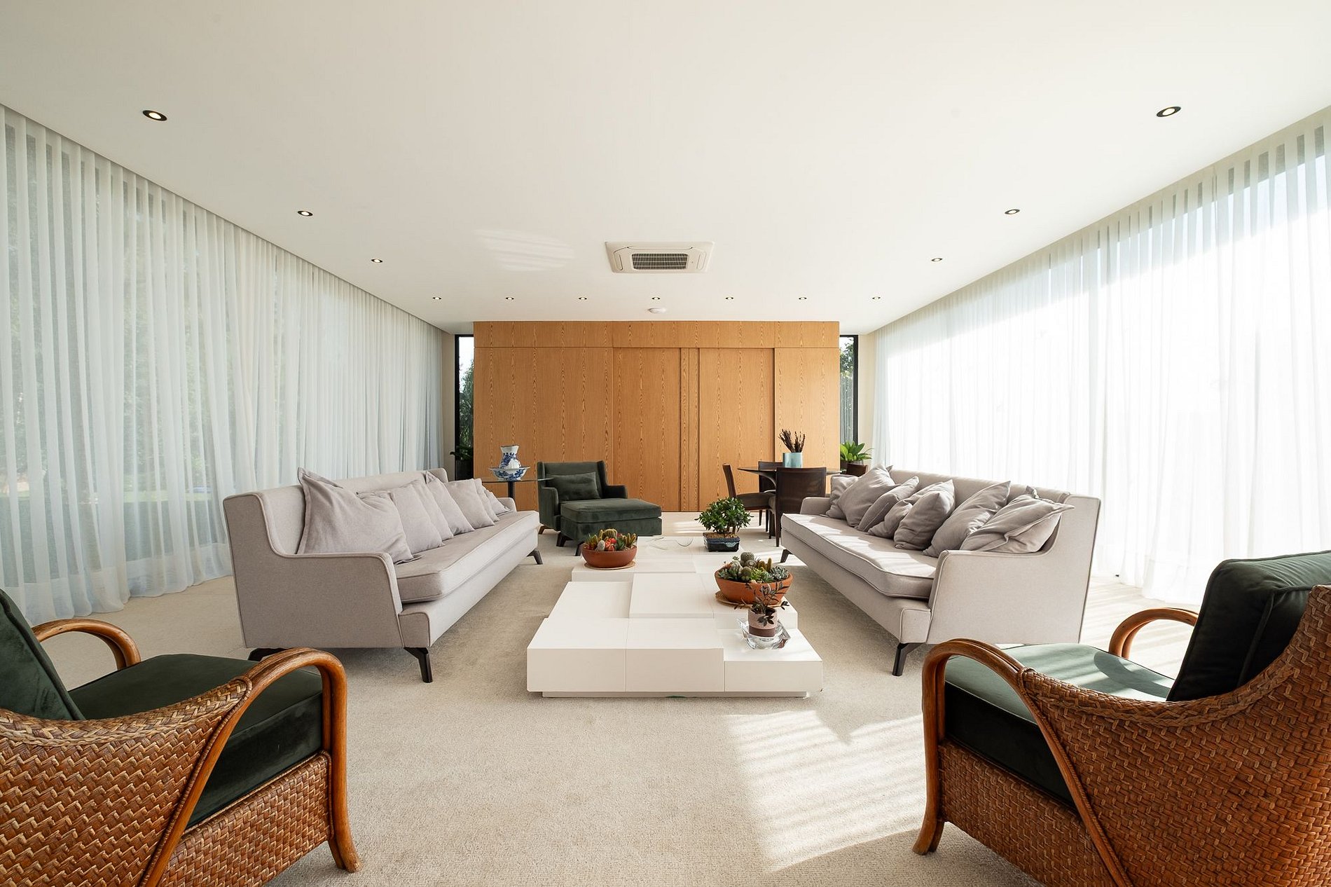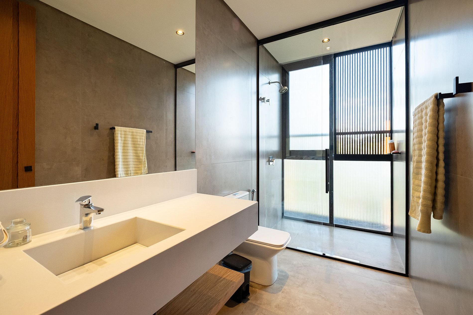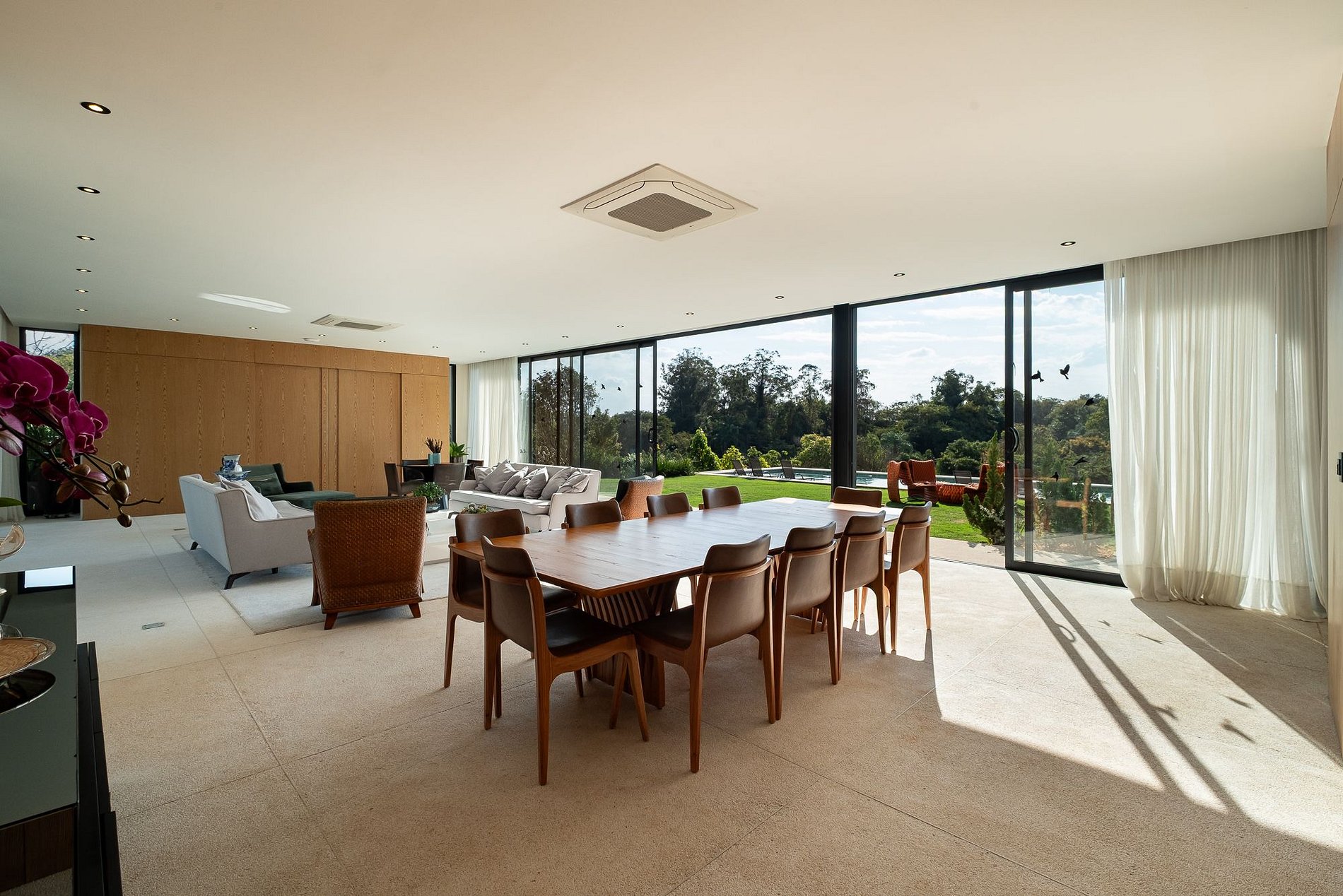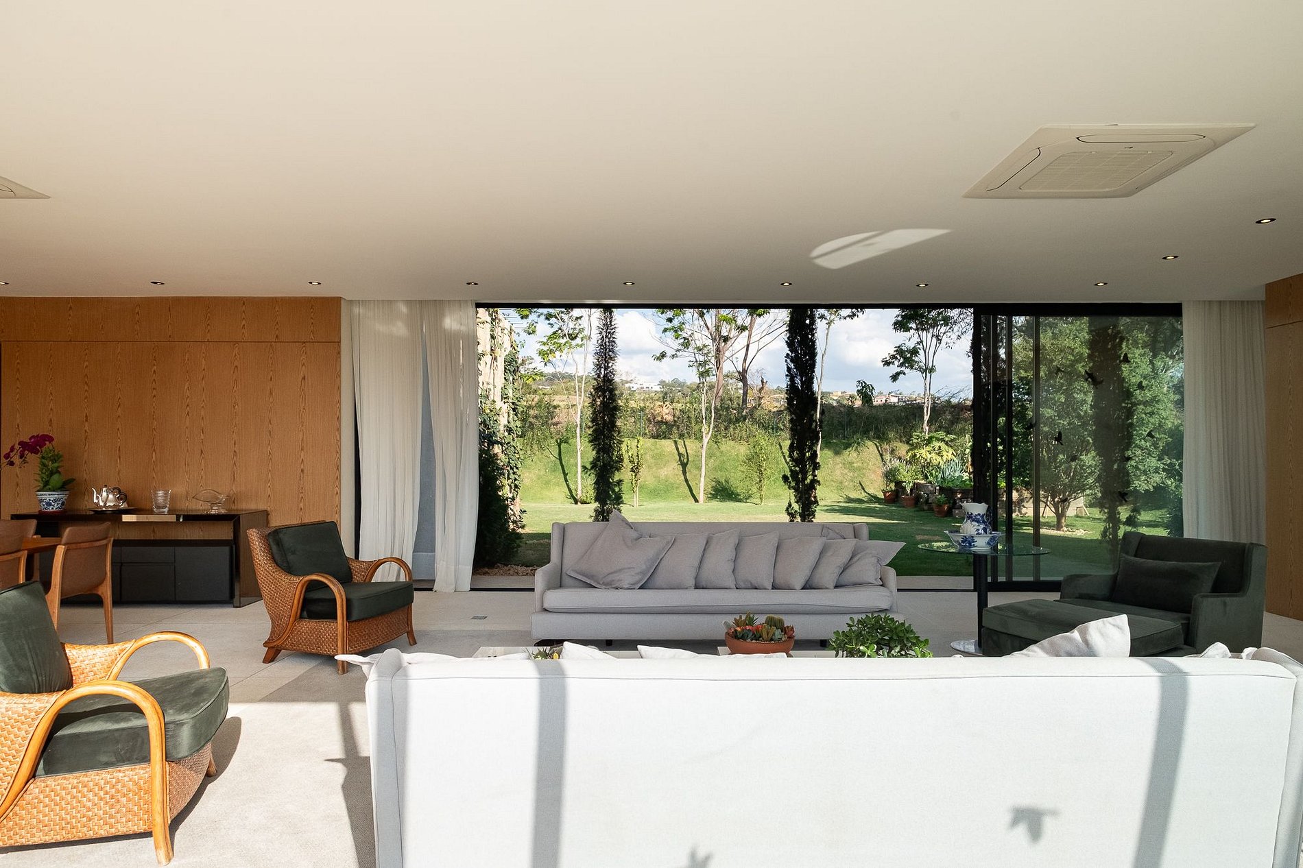 A sala ampla foi projetada para receber com estilo. Com pé-direito generoso e integração aos demais ambientes, oferece conforto e luminosidade natural, sendo o coração da casa para momentos de convívio.