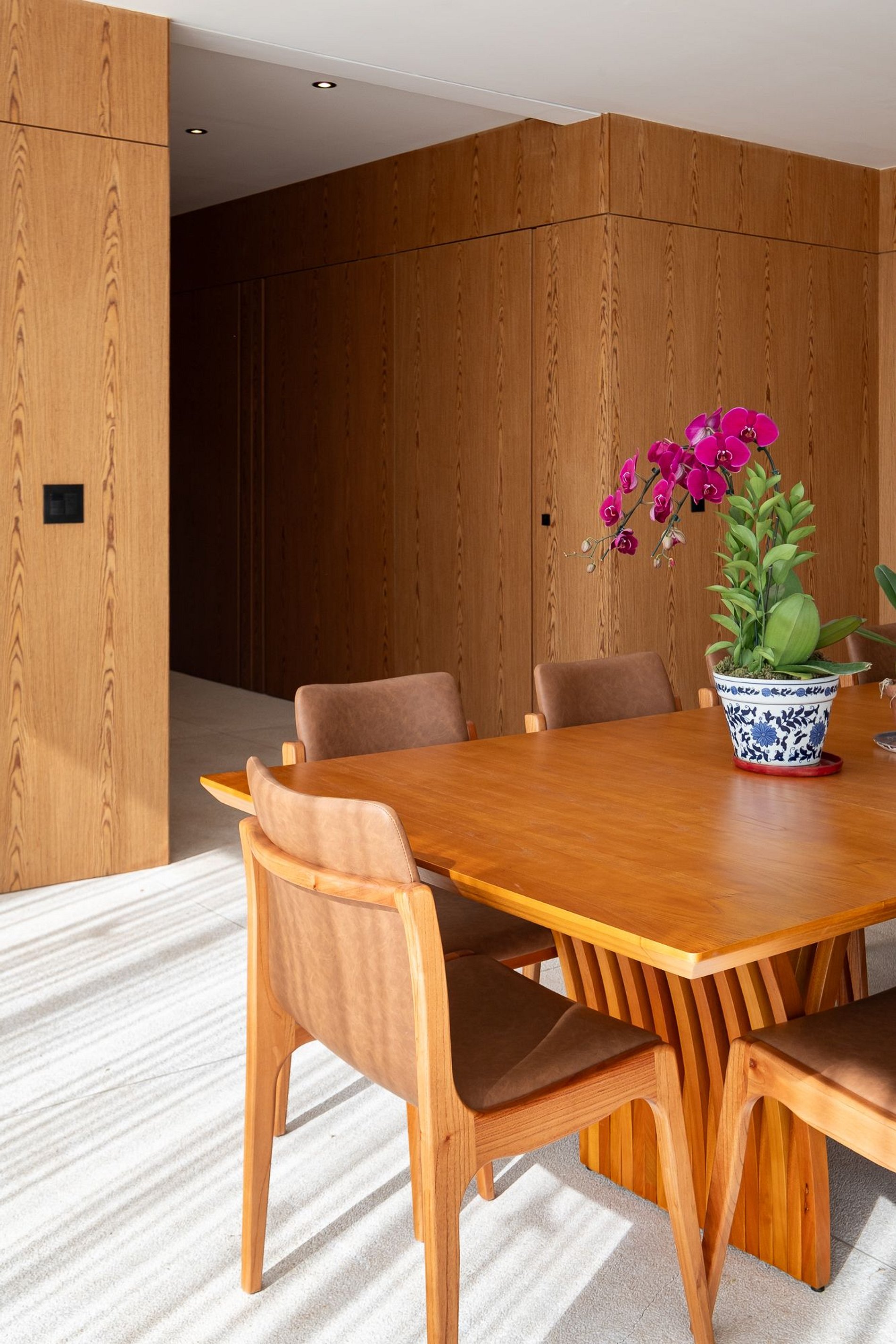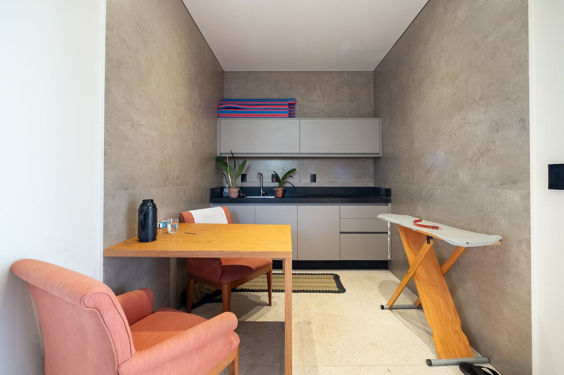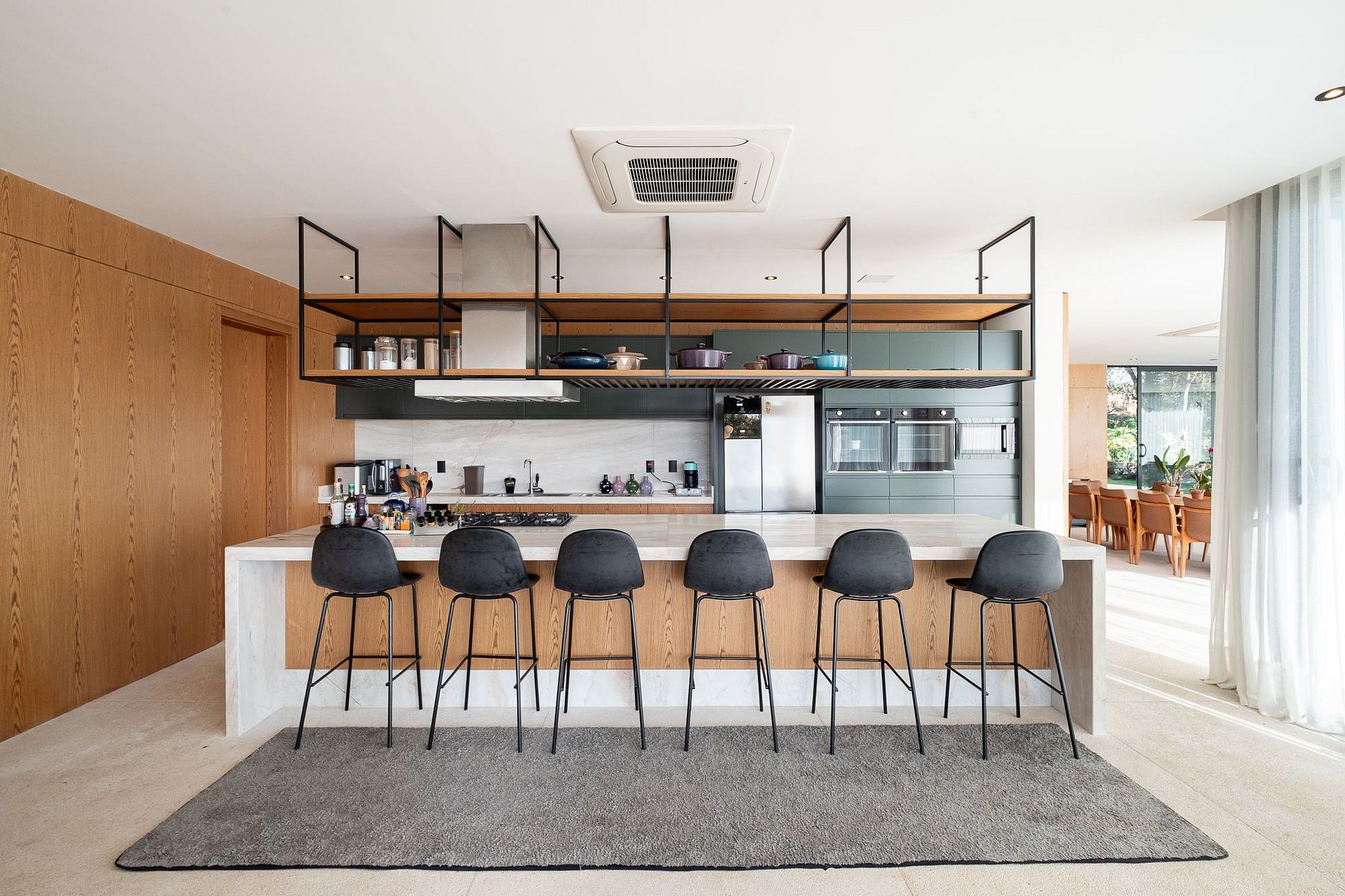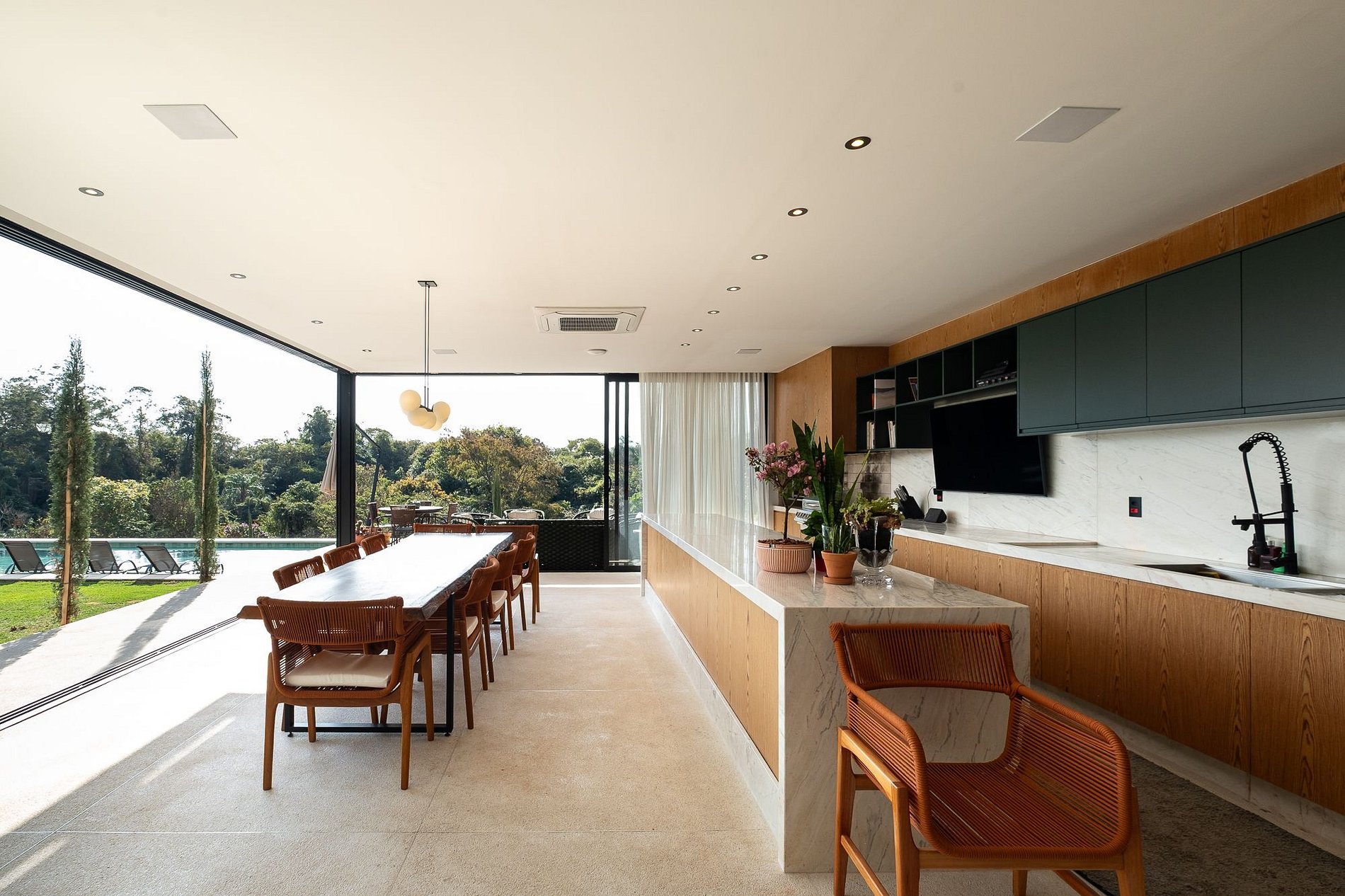 A cozinha está totalmente equipada e se conecta de forma fluida à sala de jantar e às áreas sociais, proporcionando praticidade para quem gosta de cozinhar e receber.