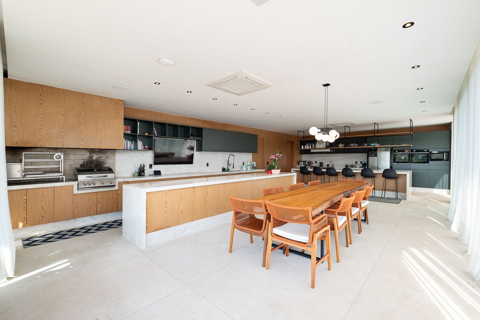 A cozinha está totalmente equipada e se conecta de forma fluida à sala de jantar e às áreas sociais, proporcionando praticidade para quem gosta de cozinhar e receber.