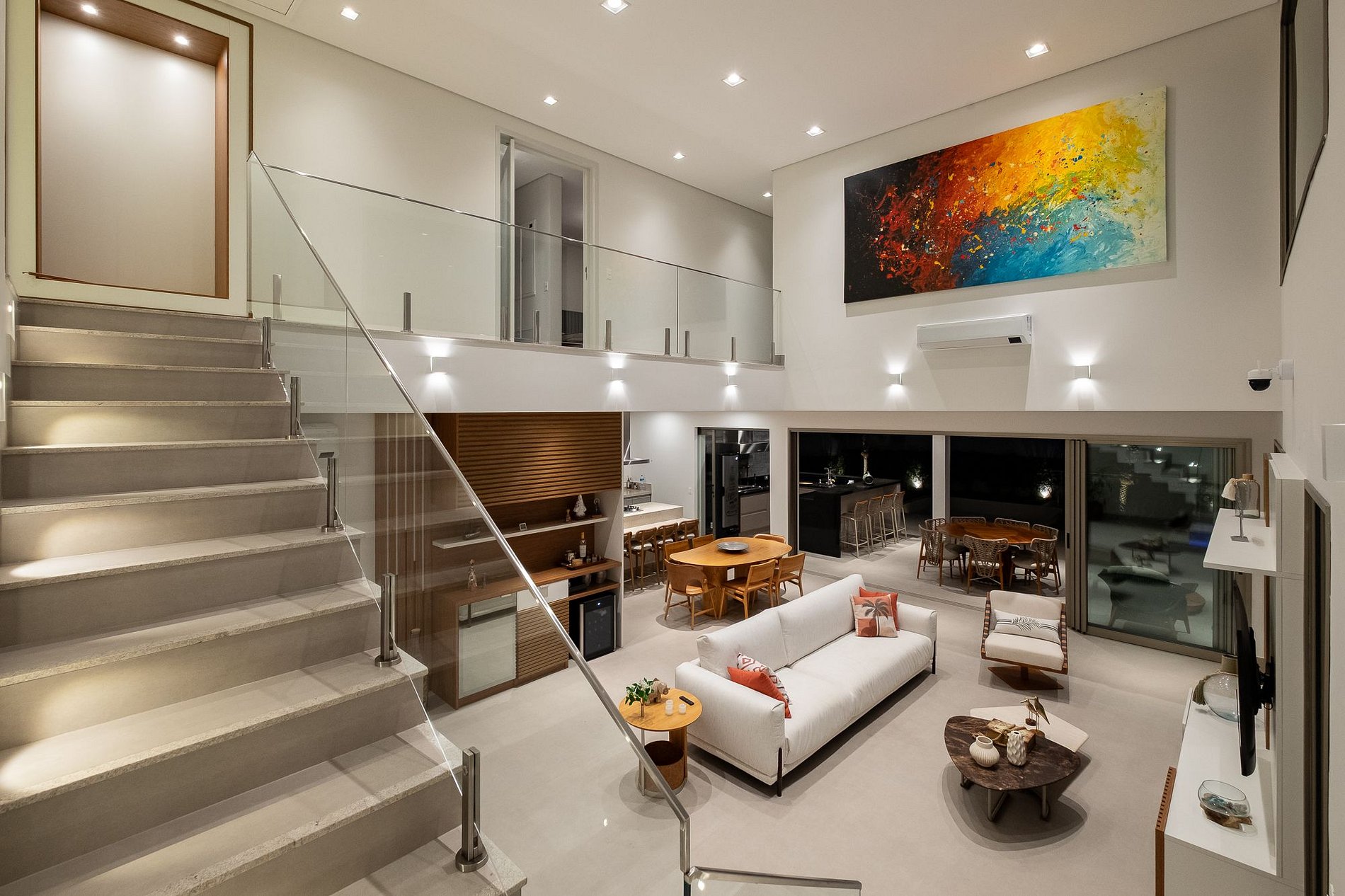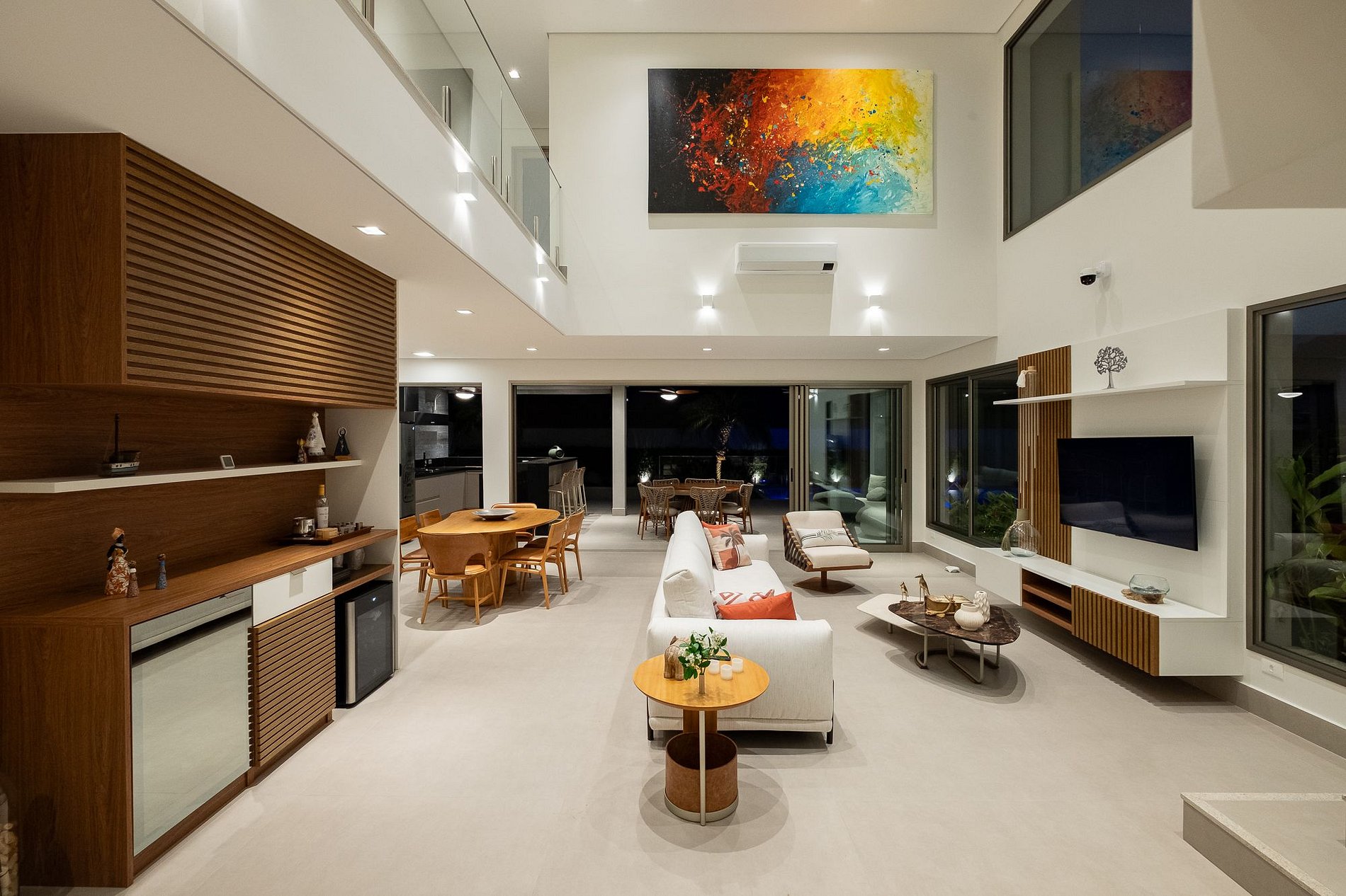 Ambientes amplos, bem iluminados e com pé-direito duplo que transmite imponência. A sala de estar é moderna e confortável, integrada à área de jantar, proporcionando fluidez e sofisticação.