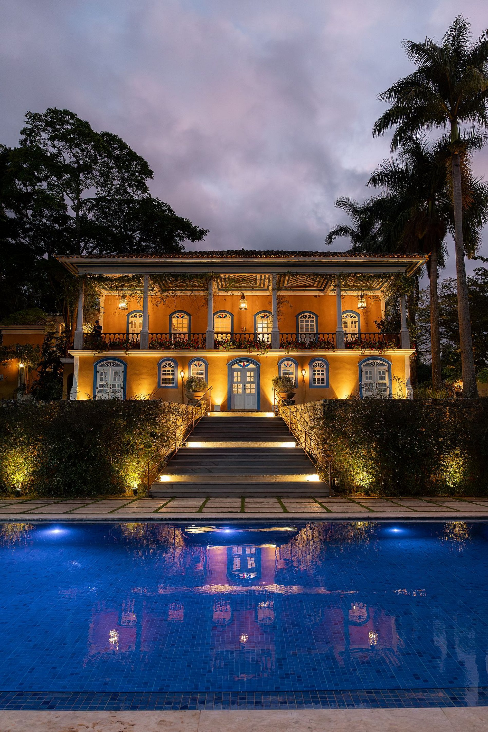 A espaçosa varanda convida a momentos de contemplação, com vista privilegiada para os jardins impecavelmente cuidados, realçados por iluminação noturna. A piscina, emoldurada pelo paisagismo, proporciona um cenário deslumbrante de lazer e relaxamento. A área gourmet, totalmente equipada com churrasqueira e amplas mesas, é perfeita para confraternizações em família ou entre amigos.