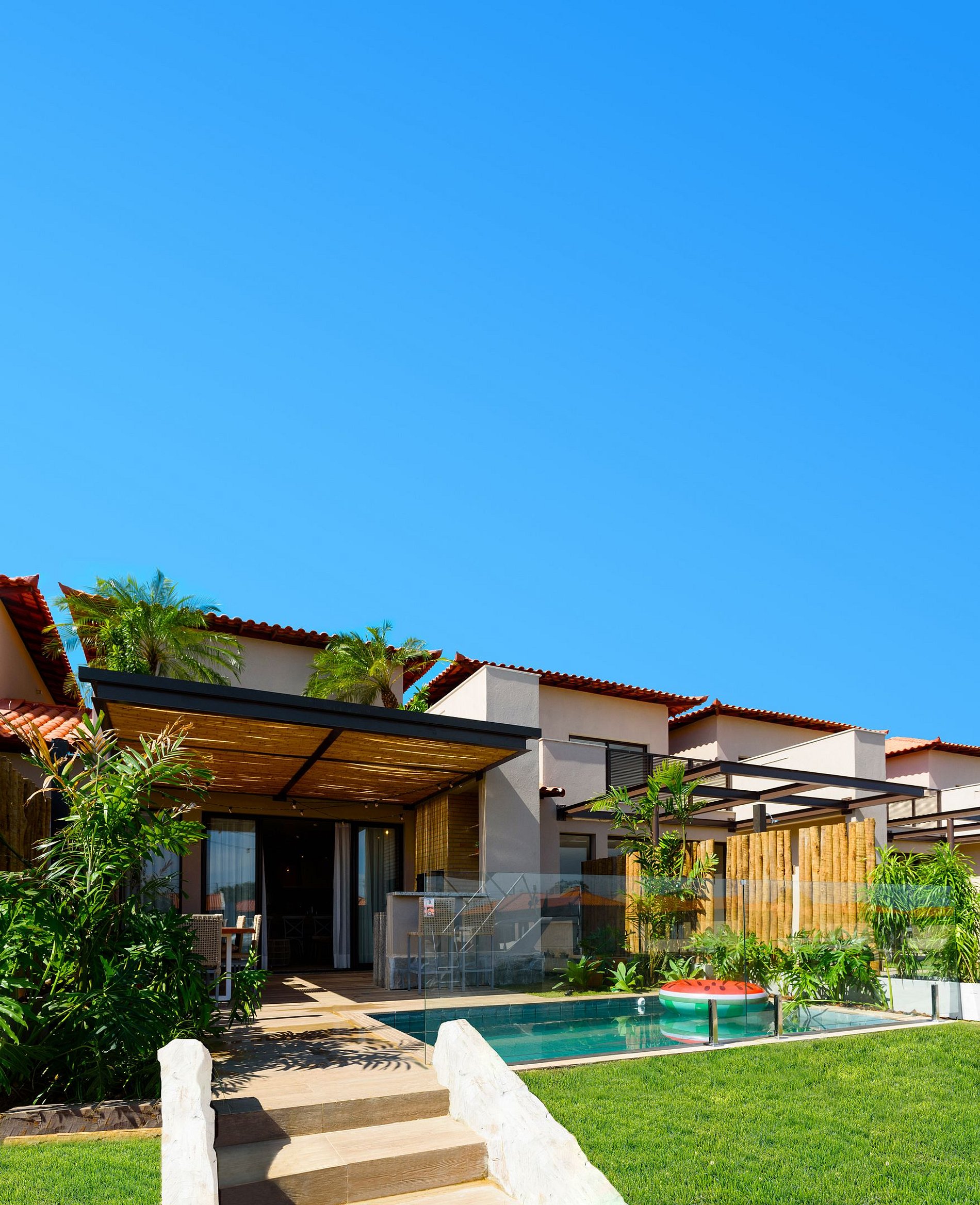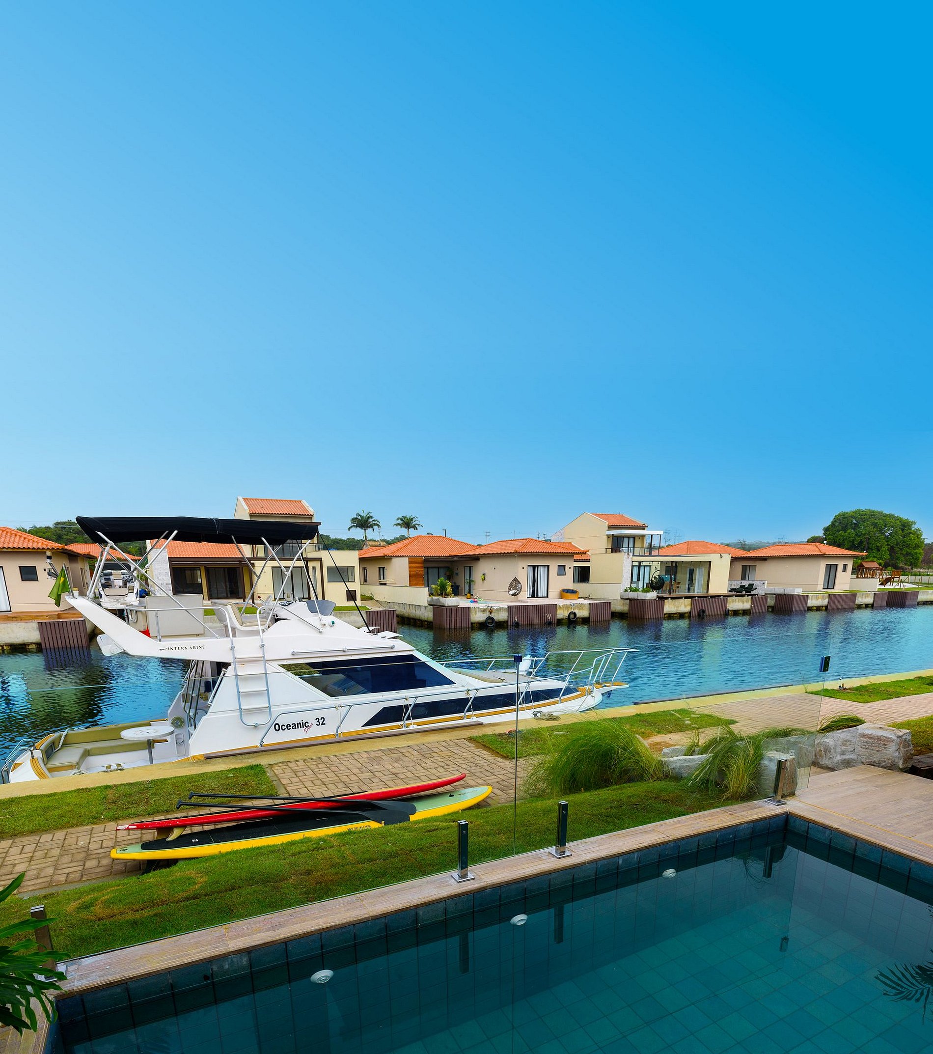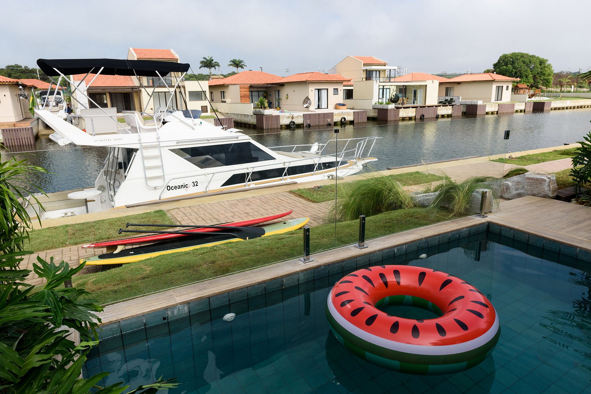 O projeto contempla casas de 165 m² a 285 m² privativos, com até 5 suítes, ambientes integrados, piscina privativa, varanda gourmet com churrasqueira, jardim gramado, amplo living, cozinha planejada, dependência completa para funcionários e 2 a 4 vagas de garagem. Destaque para a vista principal para o canal e infraestrutura para ar-condicionado e automação.