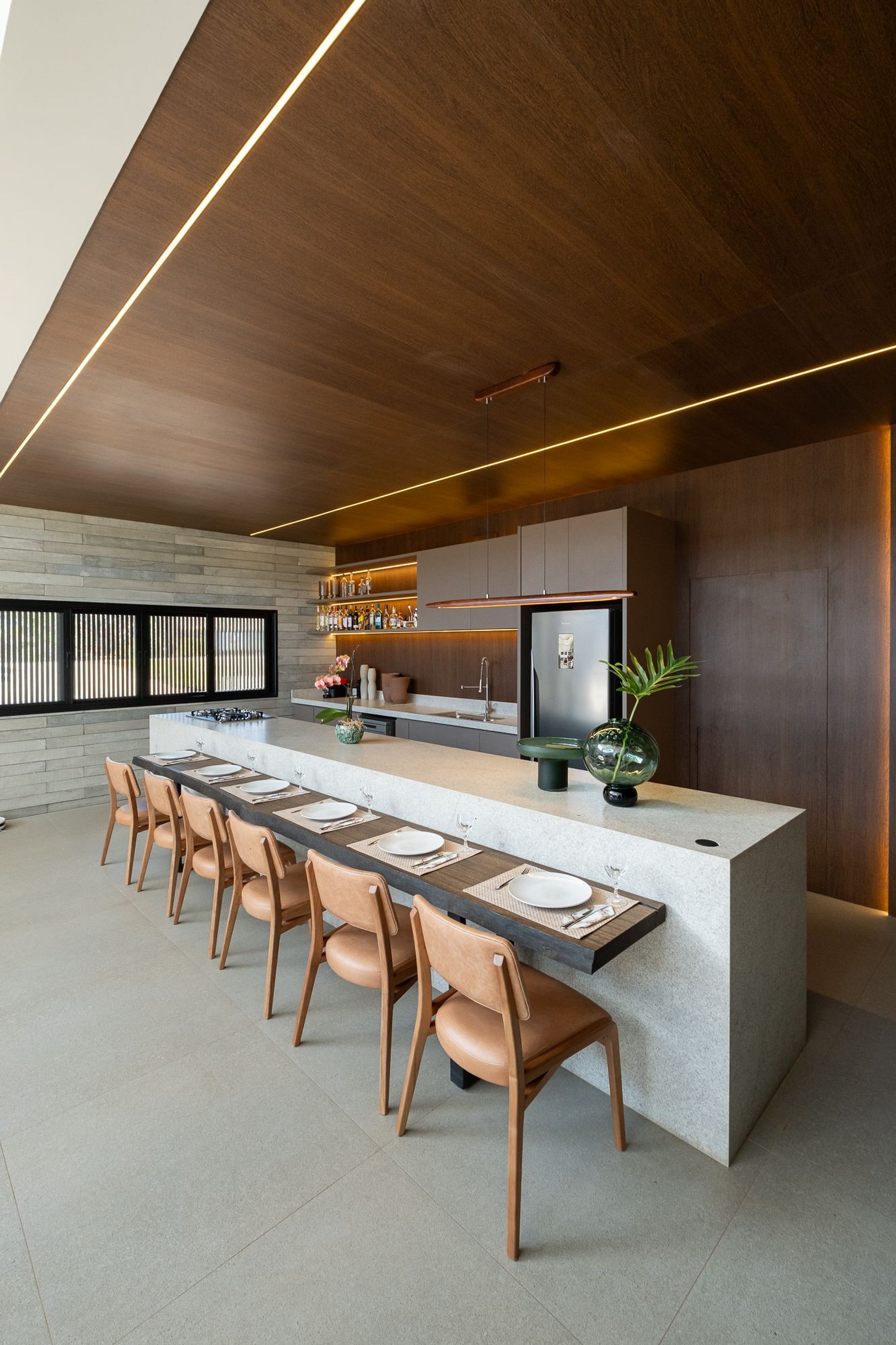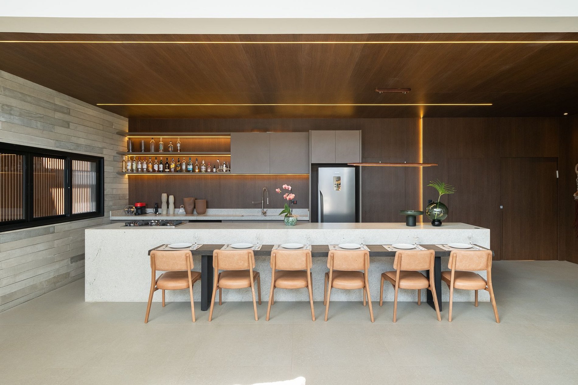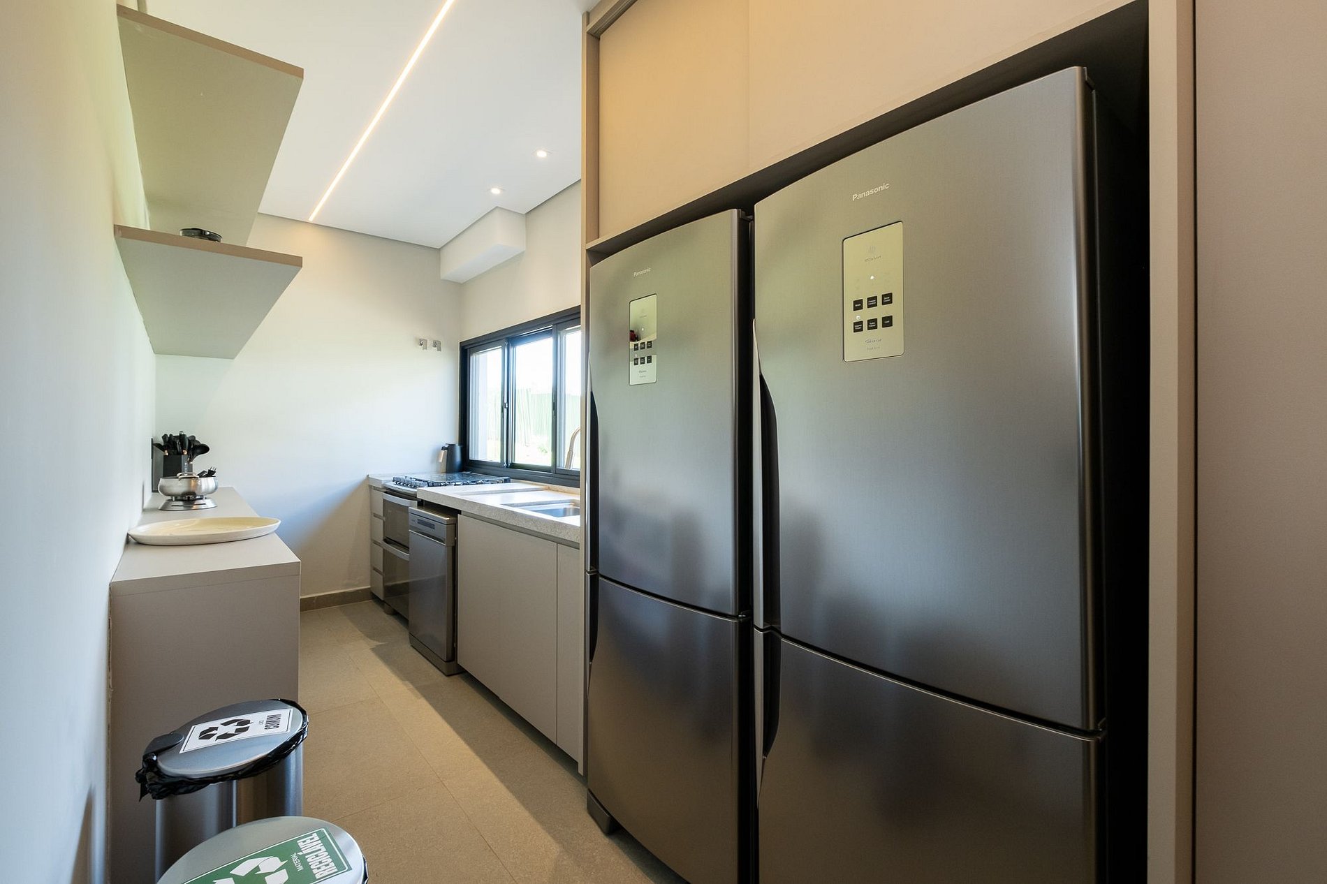 A cozinha é equipada com tudo o que se espera de uma residência de alto padrão: forno, fogão, micro-ondas, lava-louças, máquina de café expresso, Nespresso, Dolce Gusto e coador, torradeira, máquina de gelo, máquina de pão, chaleira elétrica, além de 3 geladeiras de 500L, 1 cervejeira grande, 2 cervejeiras adicionais, freezer e adega climatizada. A área gourmet integrada ainda conta com forno de pizza, churrasqueira fixa a carvão, utensílios completos, louças, taças de vinho e todos os eletrodomésticos necessários para receber em grande estilo.