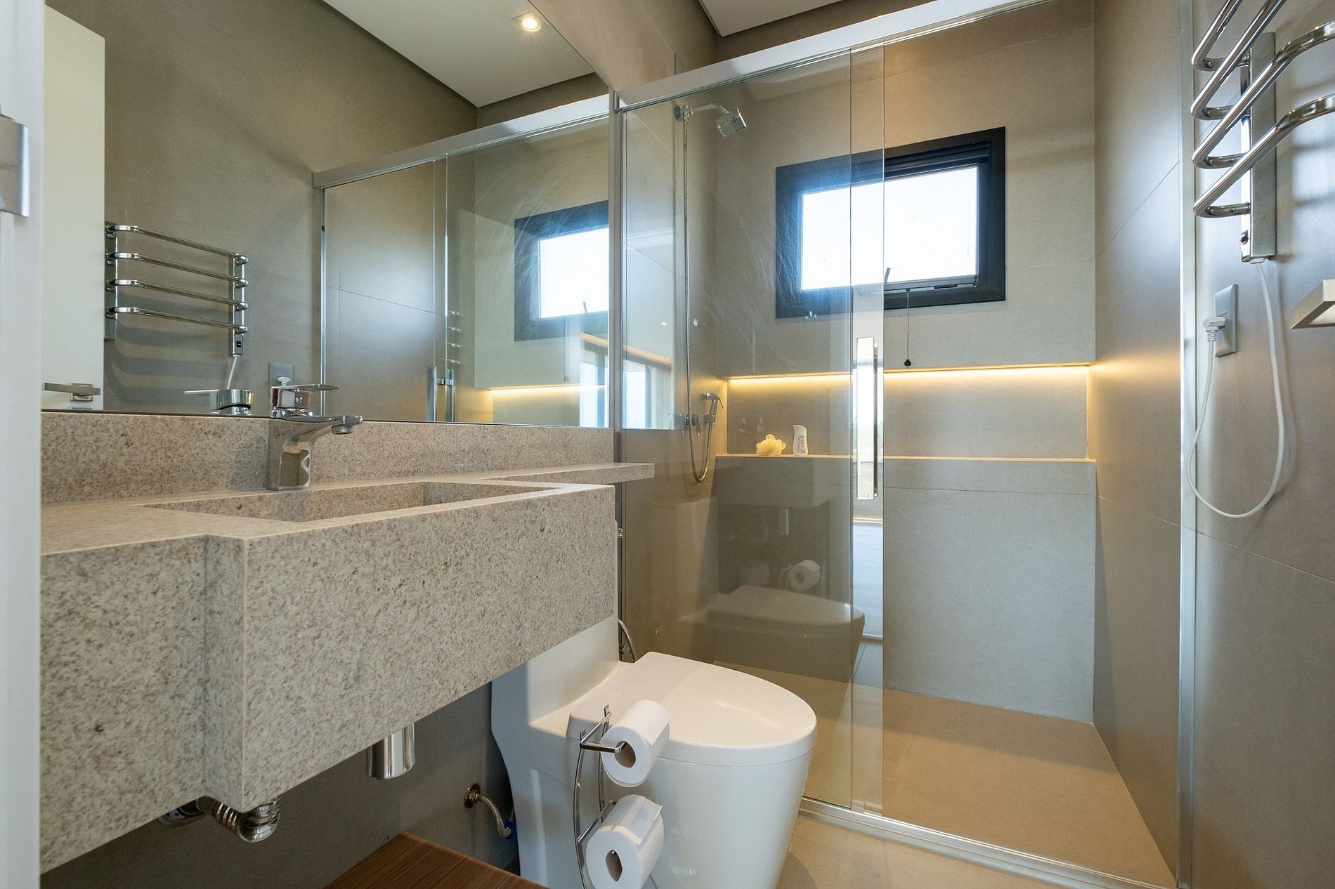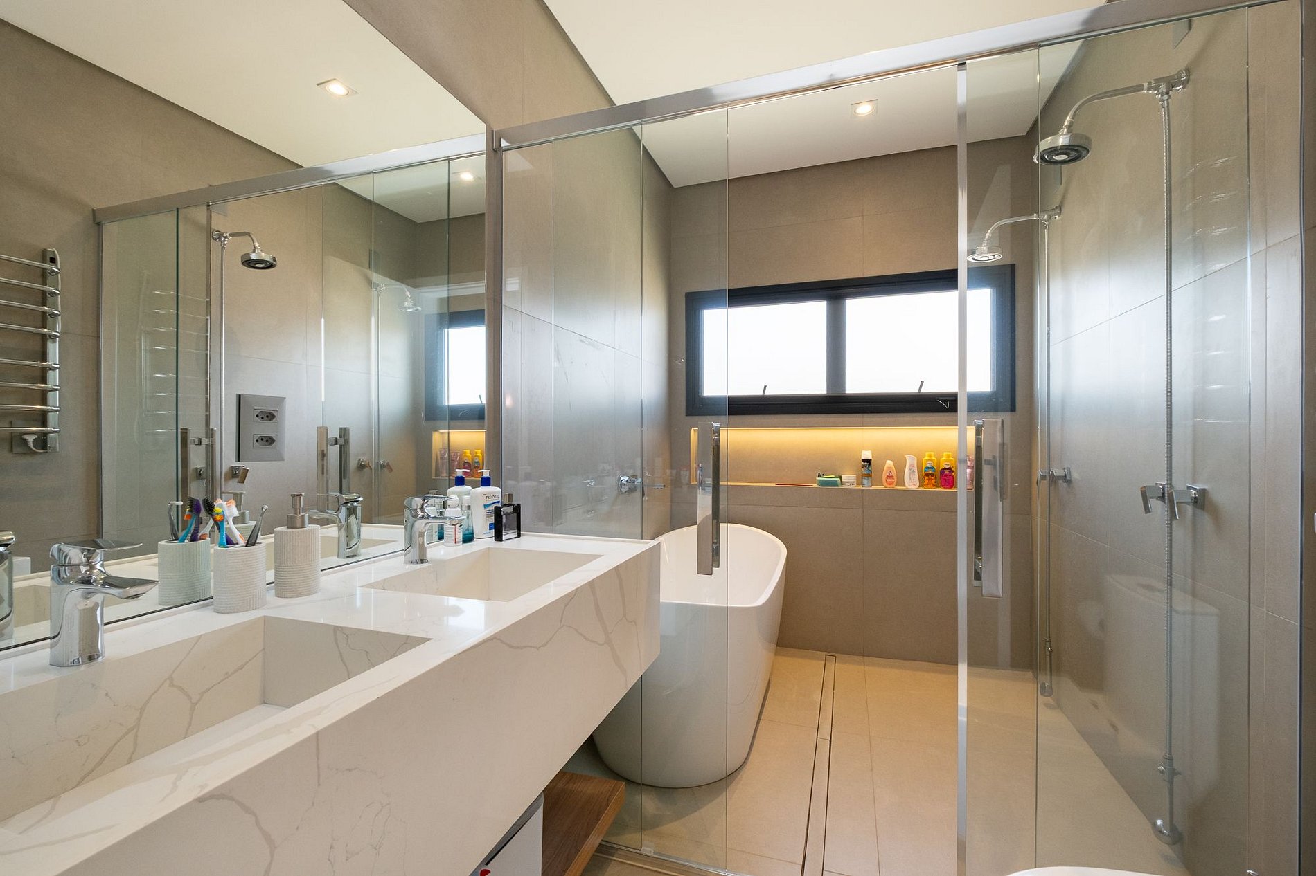 Suíte Master: cama king size, ar-condicionado/aquecedor, banheira e dois chuveiros