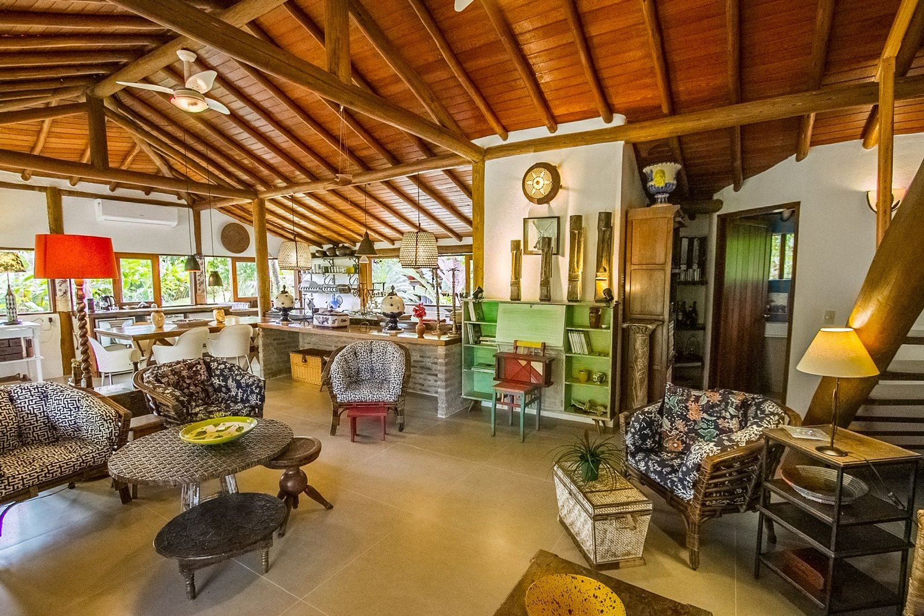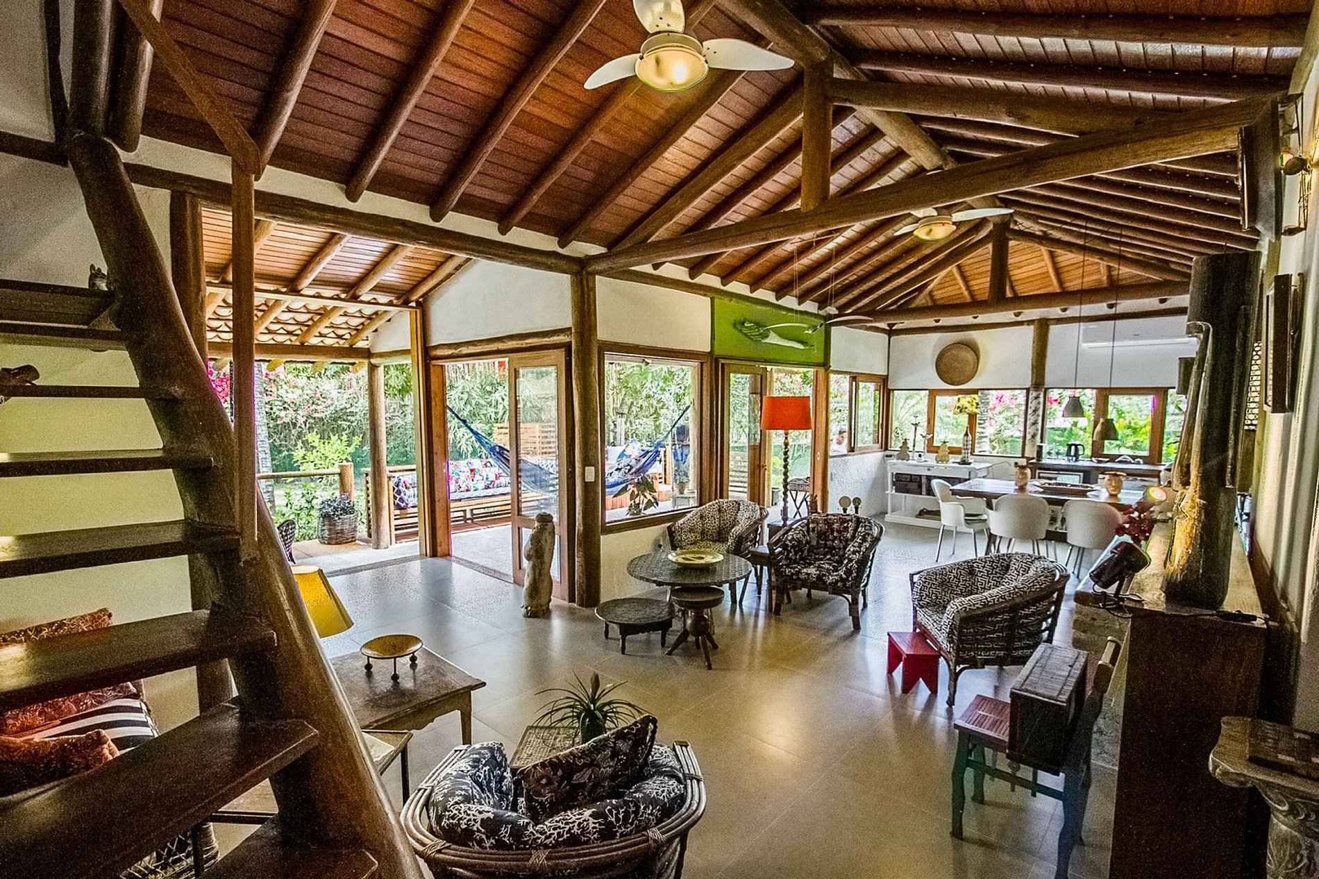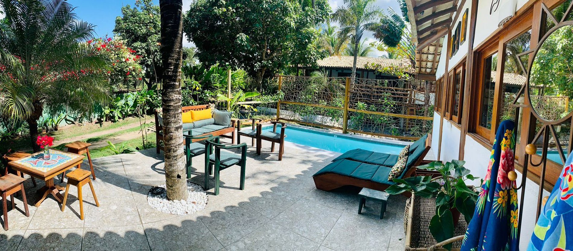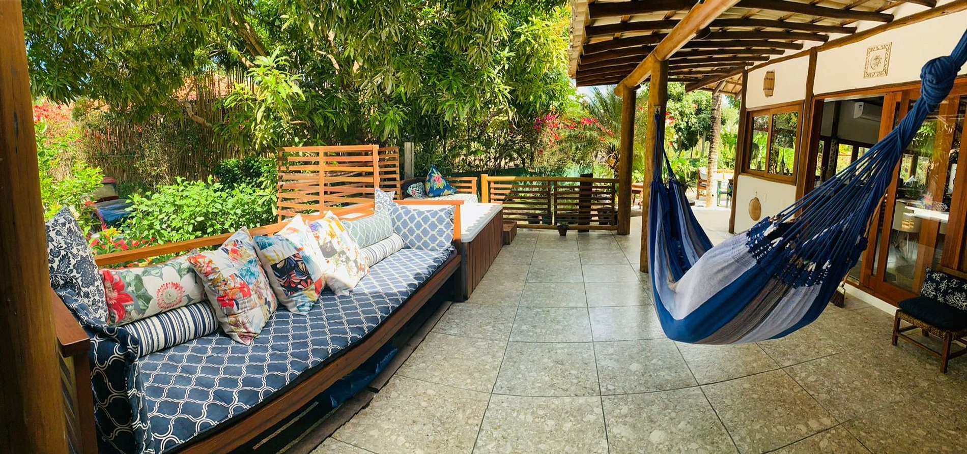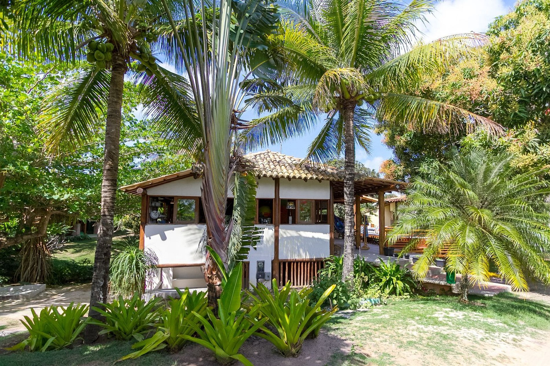 Os ambientes internos são espaçosos, bem iluminados e decorados com artefatos locais que refletem o estilo baiano. A casa conta com sala de TV climatizada, cozinha de apoio e amplas varandas integradas, ideais para descanso e convivência. A arquitetura assinada por Daniel Fromer valoriza a luz natural e o contato com o verde, proporcionando uma sensação constante de bem-estar e harmonia.