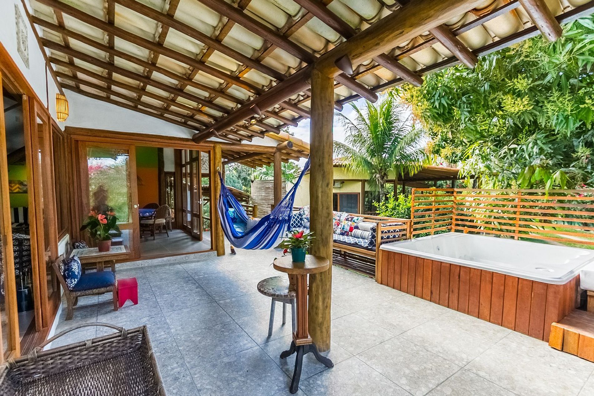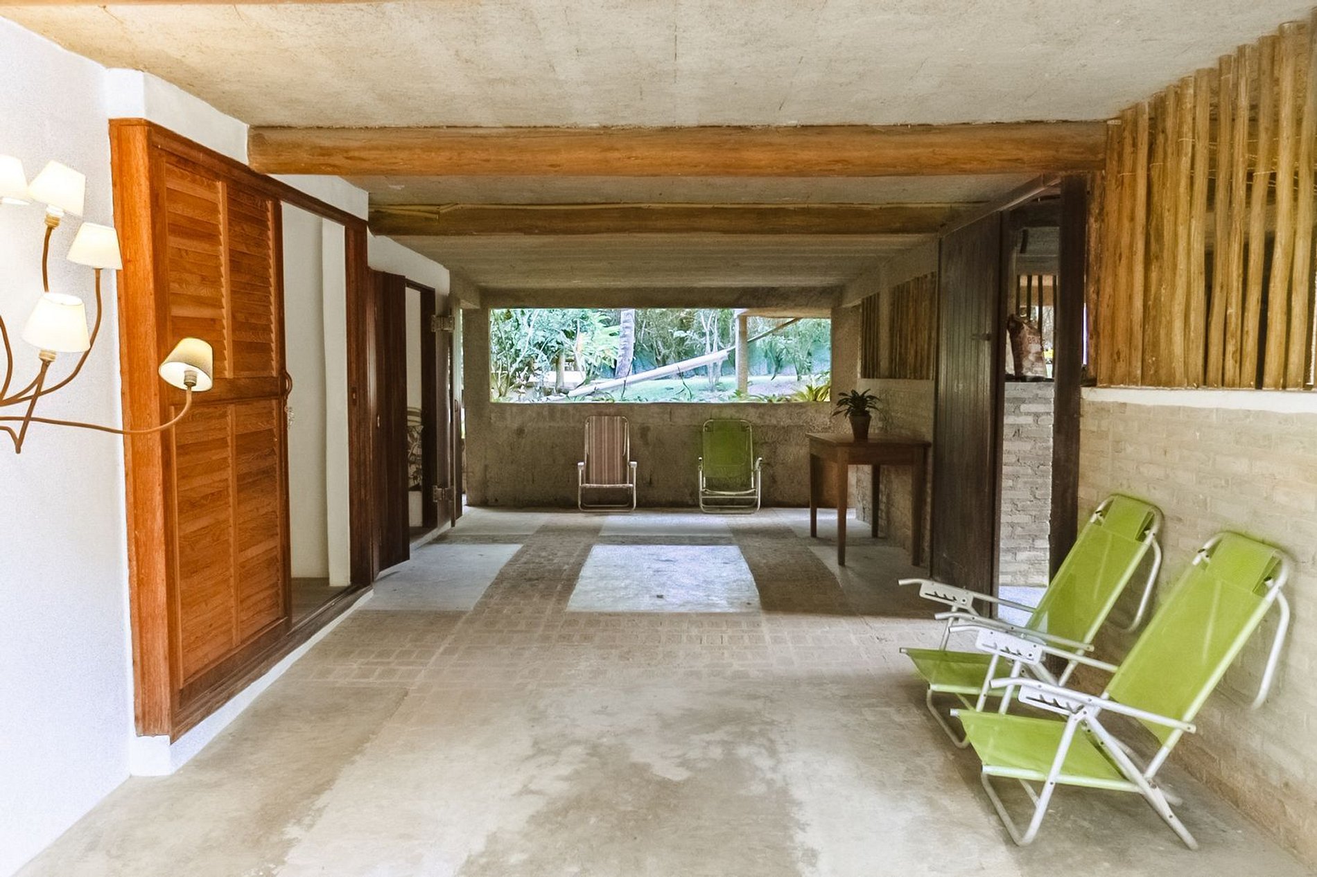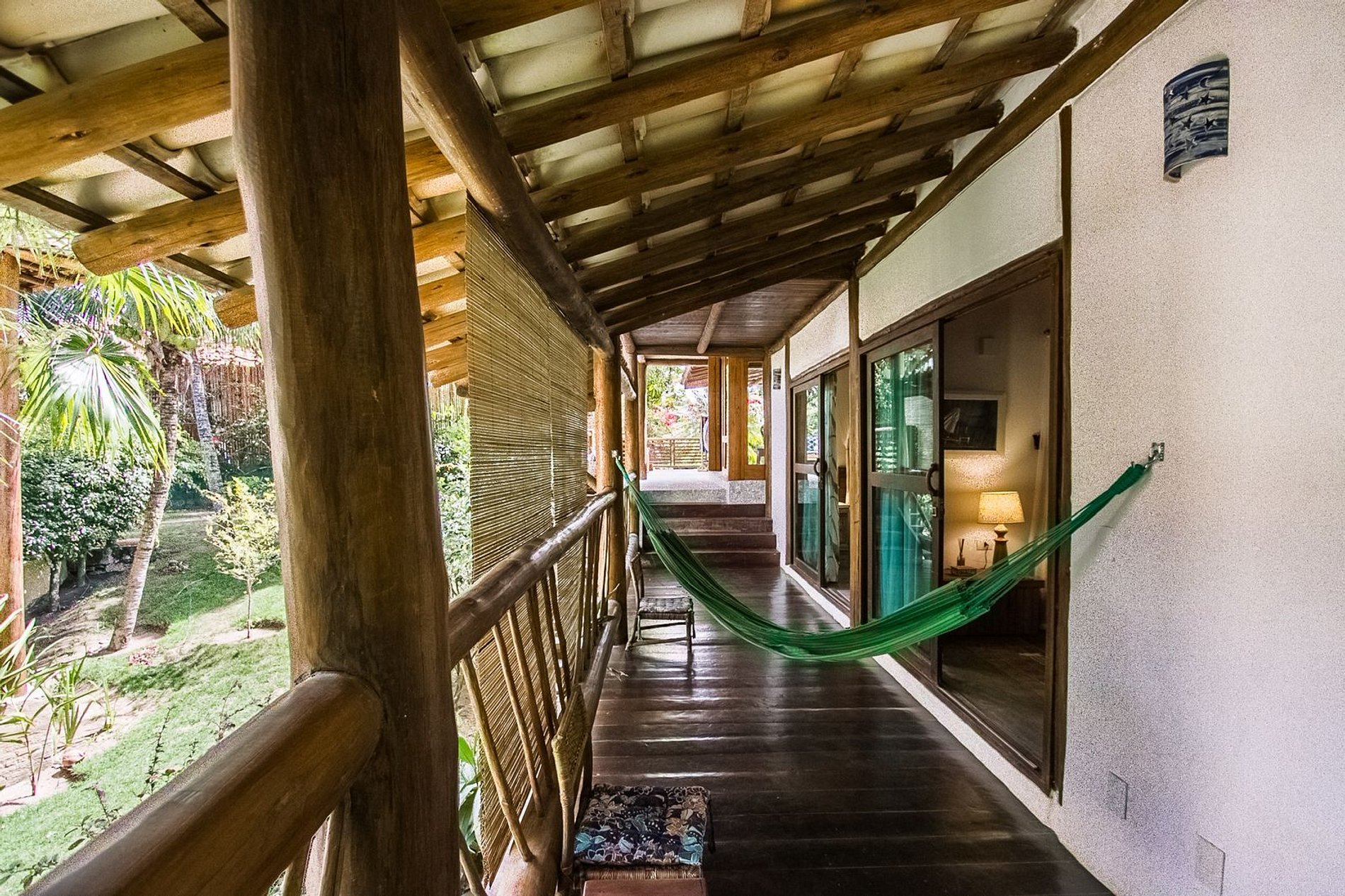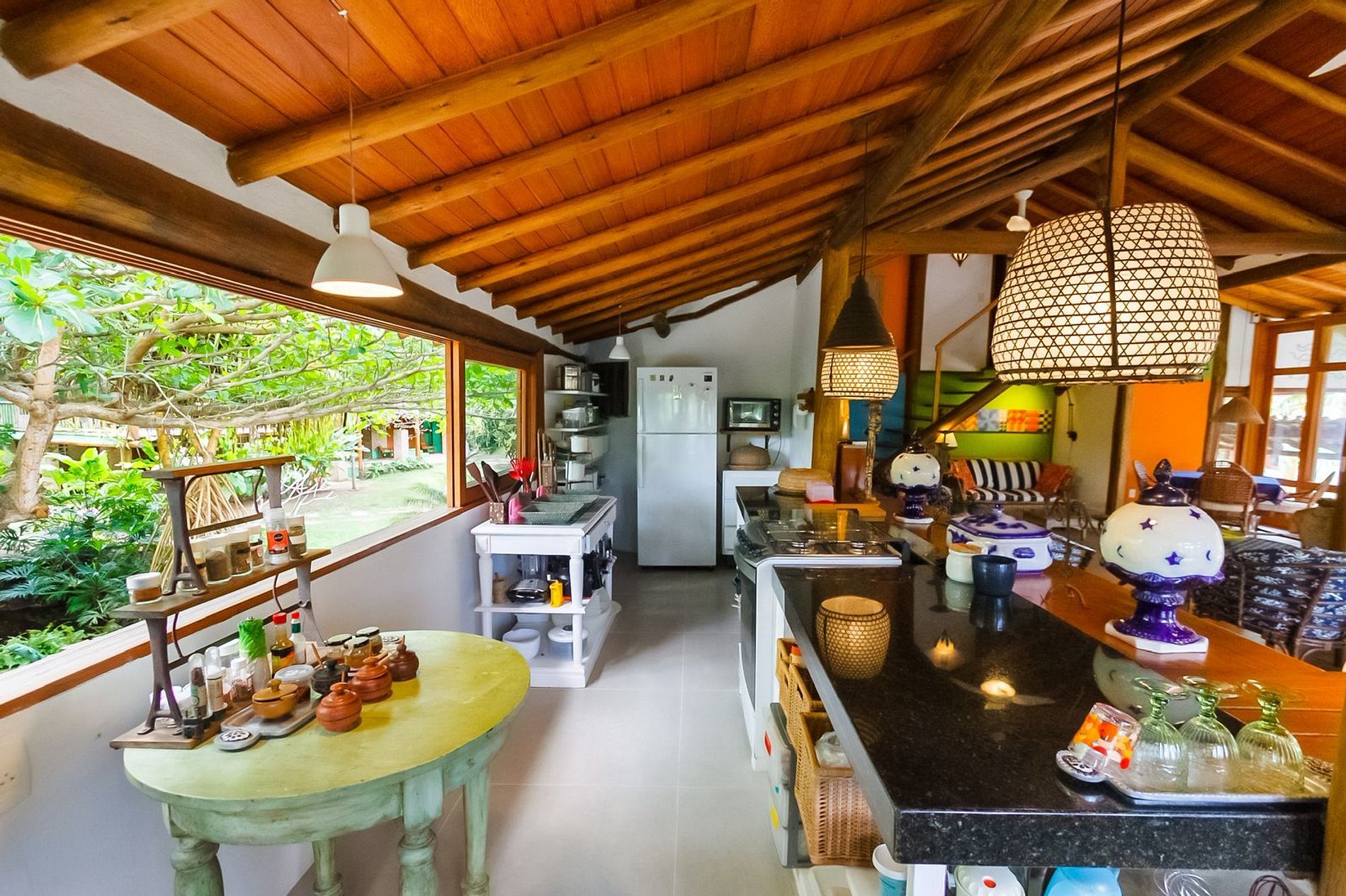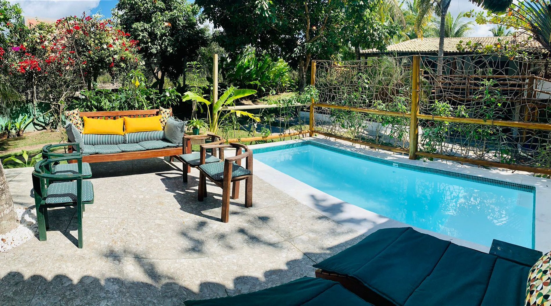 Os ambientes internos são espaçosos, bem iluminados e decorados com artefatos locais que refletem o estilo baiano. A casa conta com sala de TV climatizada, cozinha de apoio e amplas varandas integradas, ideais para descanso e convivência. A arquitetura assinada por Daniel Fromer valoriza a luz natural e o contato com o verde, proporcionando uma sensação constante de bem-estar e harmonia.