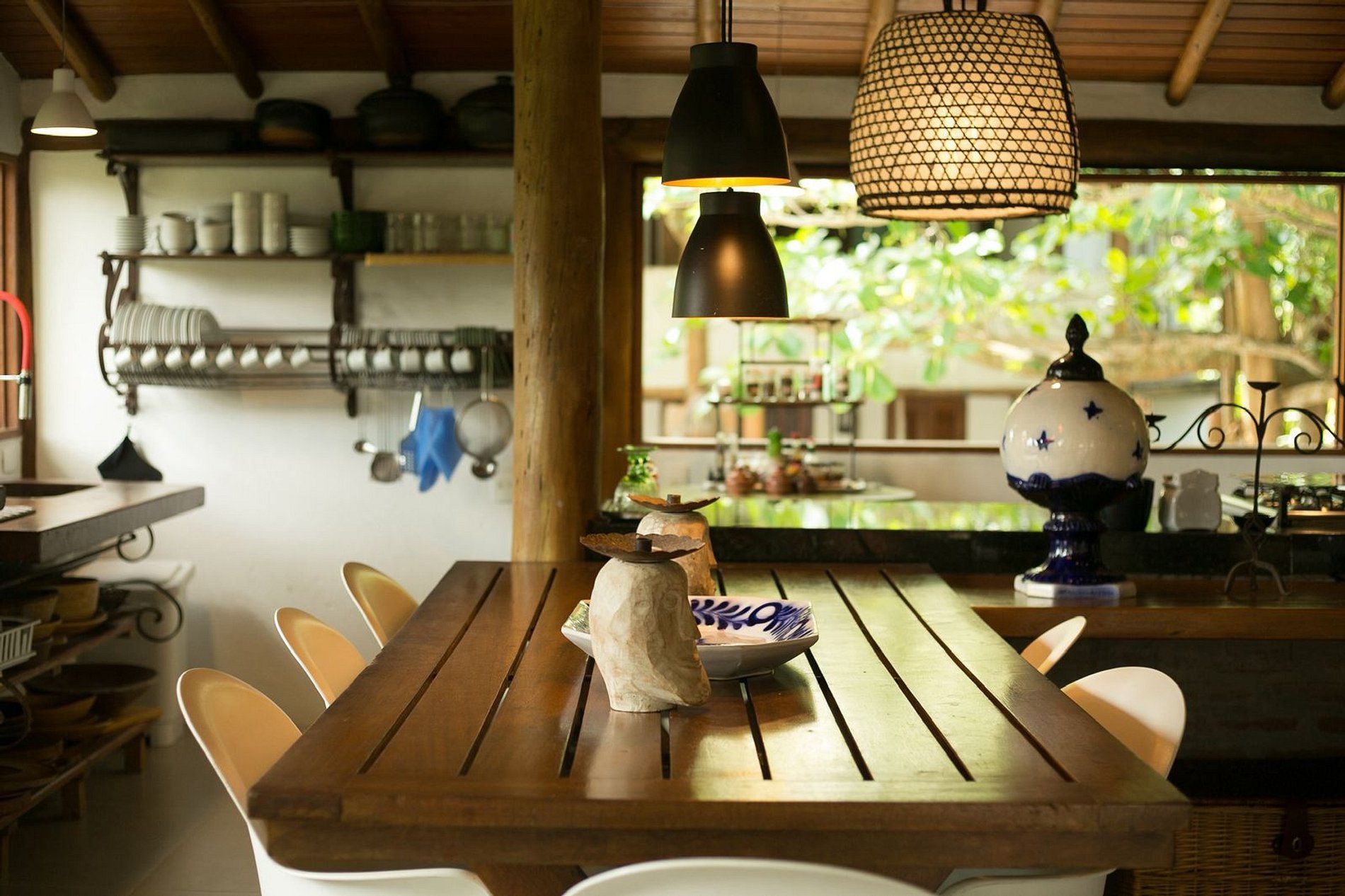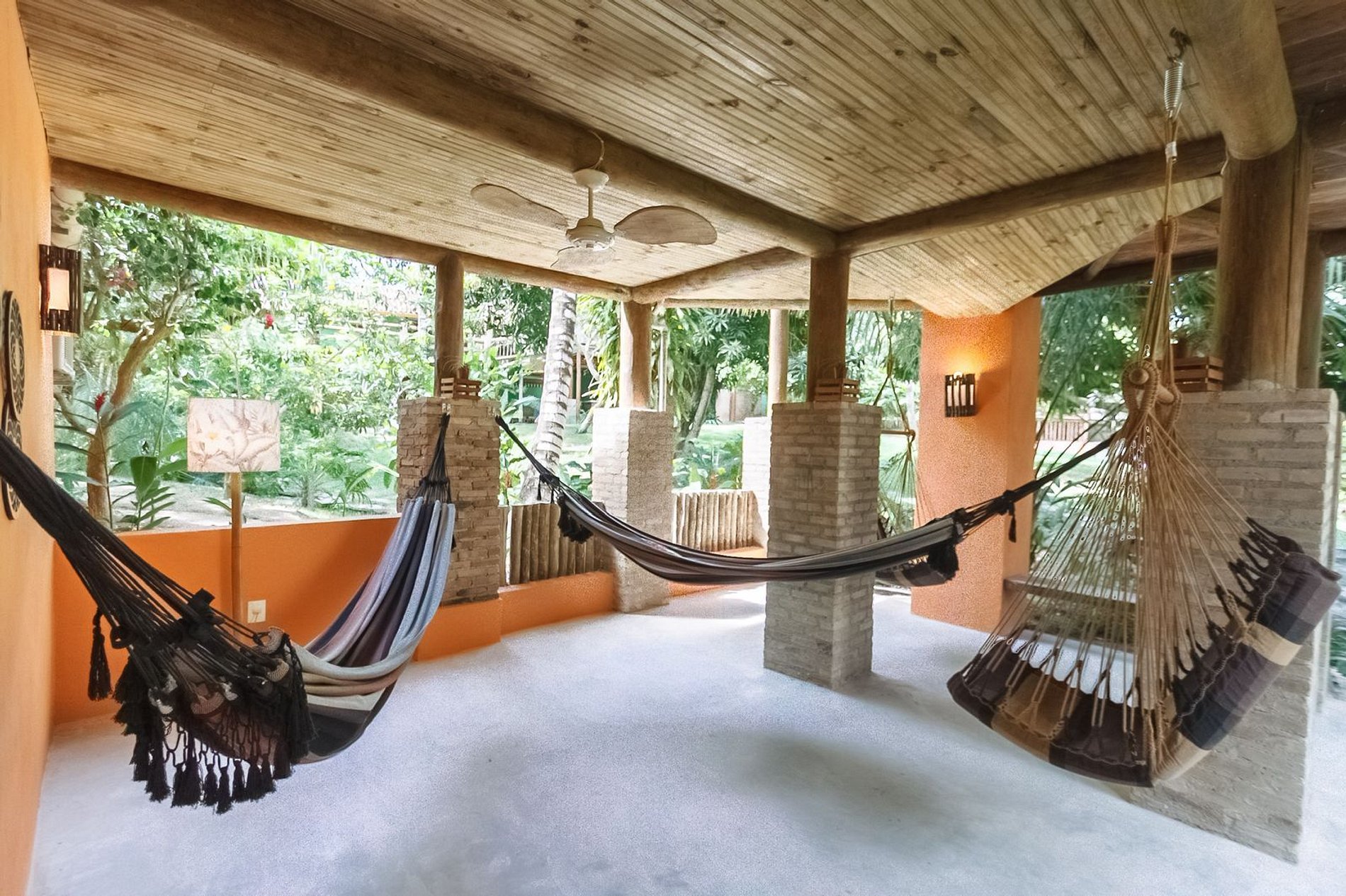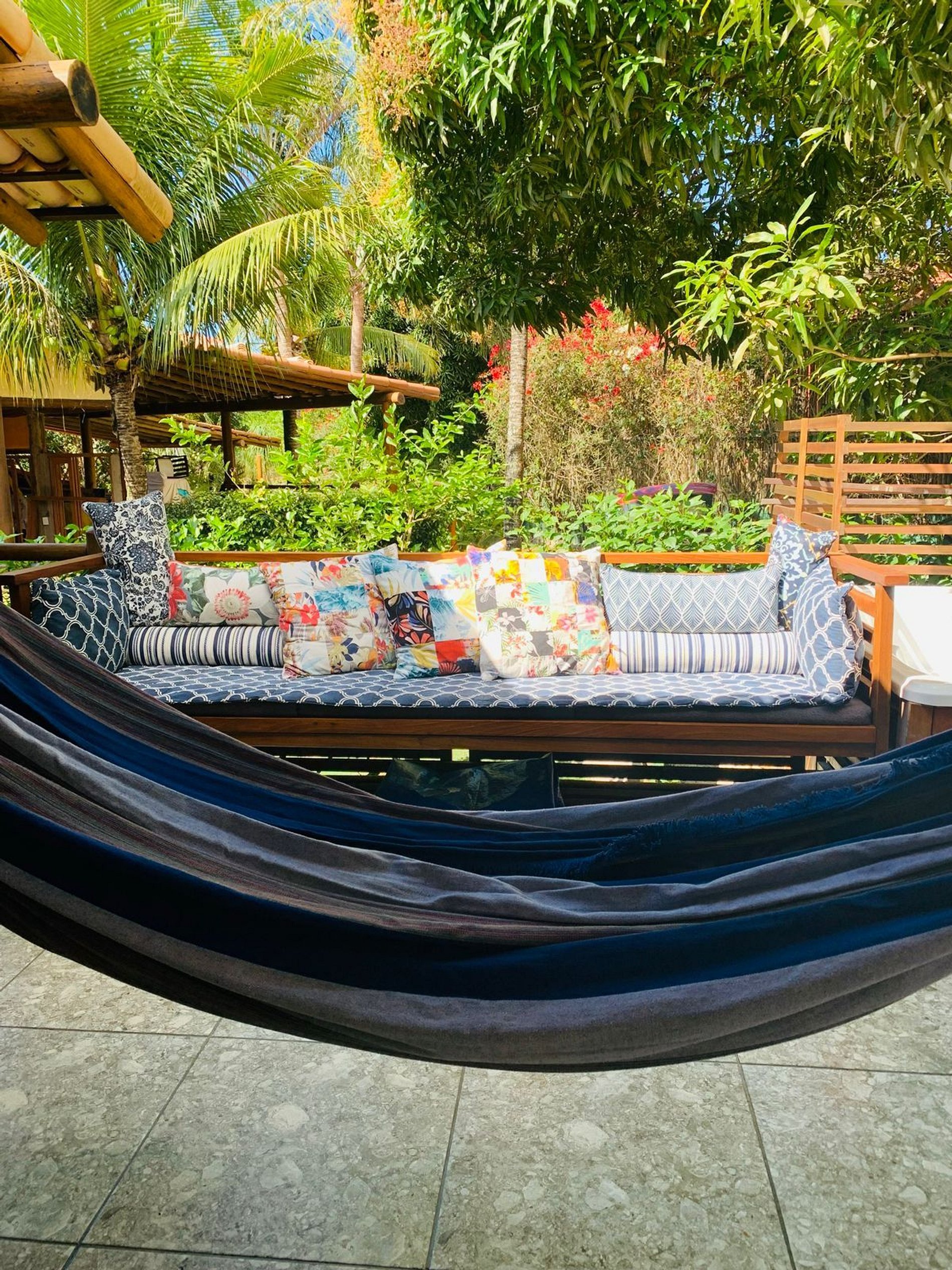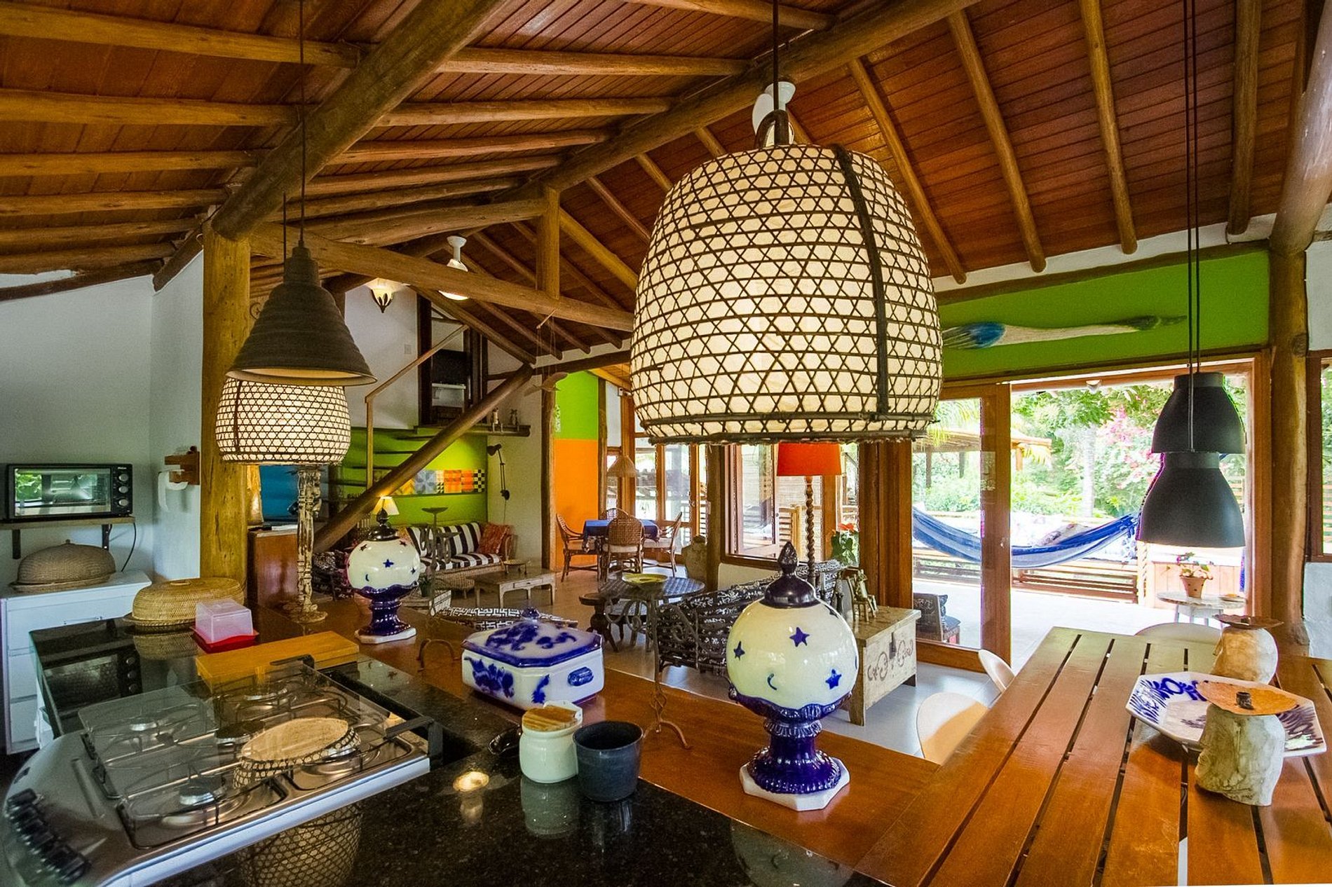 Os ambientes internos são espaçosos, bem iluminados e decorados com artefatos locais que refletem o estilo baiano. A casa conta com sala de TV climatizada, cozinha de apoio e amplas varandas integradas, ideais para descanso e convivência. A arquitetura assinada por Daniel Fromer valoriza a luz natural e o contato com o verde, proporcionando uma sensação constante de bem-estar e harmonia.