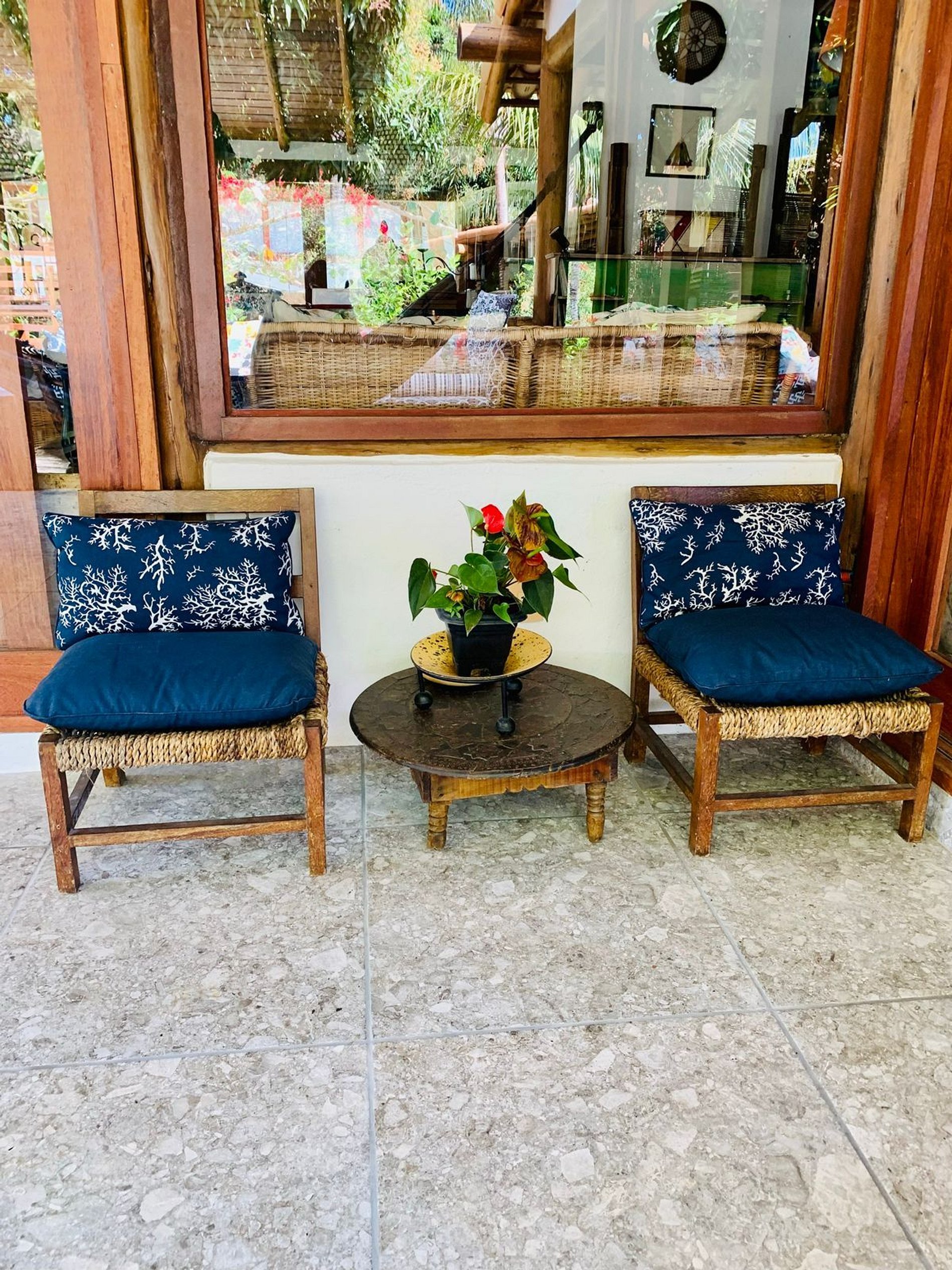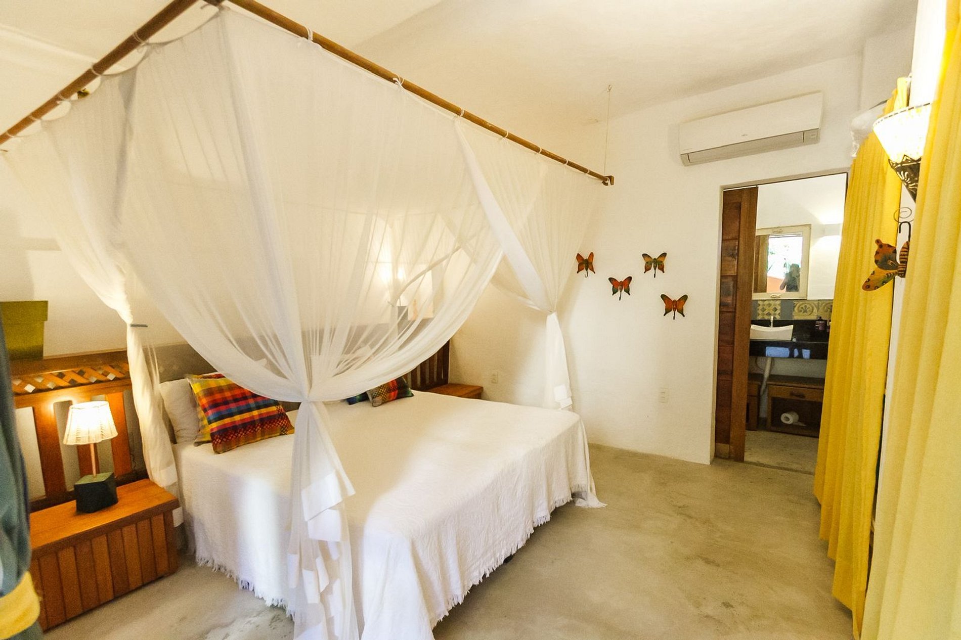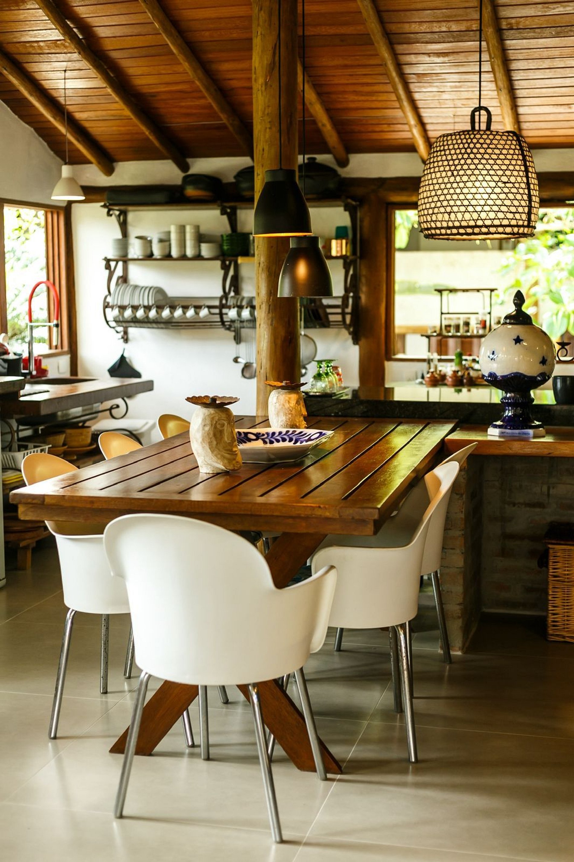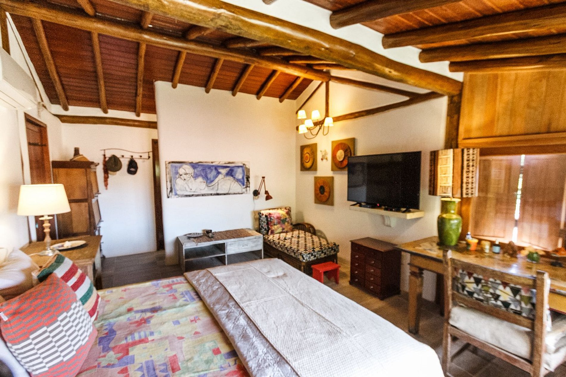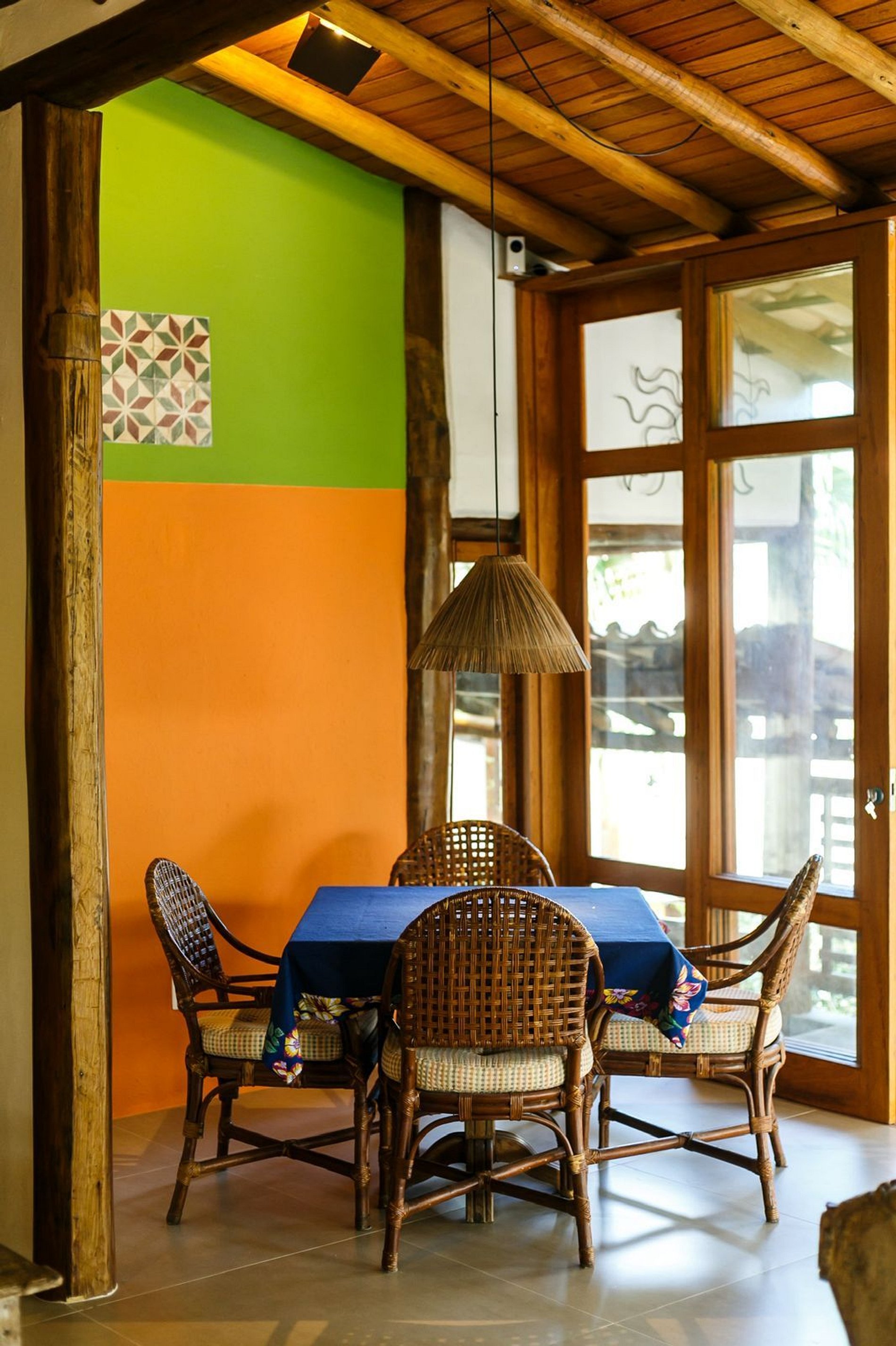 Os ambientes internos são espaçosos, bem iluminados e decorados com artefatos locais que refletem o estilo baiano. A casa conta com sala de TV climatizada, cozinha de apoio e amplas varandas integradas, ideais para descanso e convivência. A arquitetura assinada por Daniel Fromer valoriza a luz natural e o contato com o verde, proporcionando uma sensação constante de bem-estar e harmonia.
