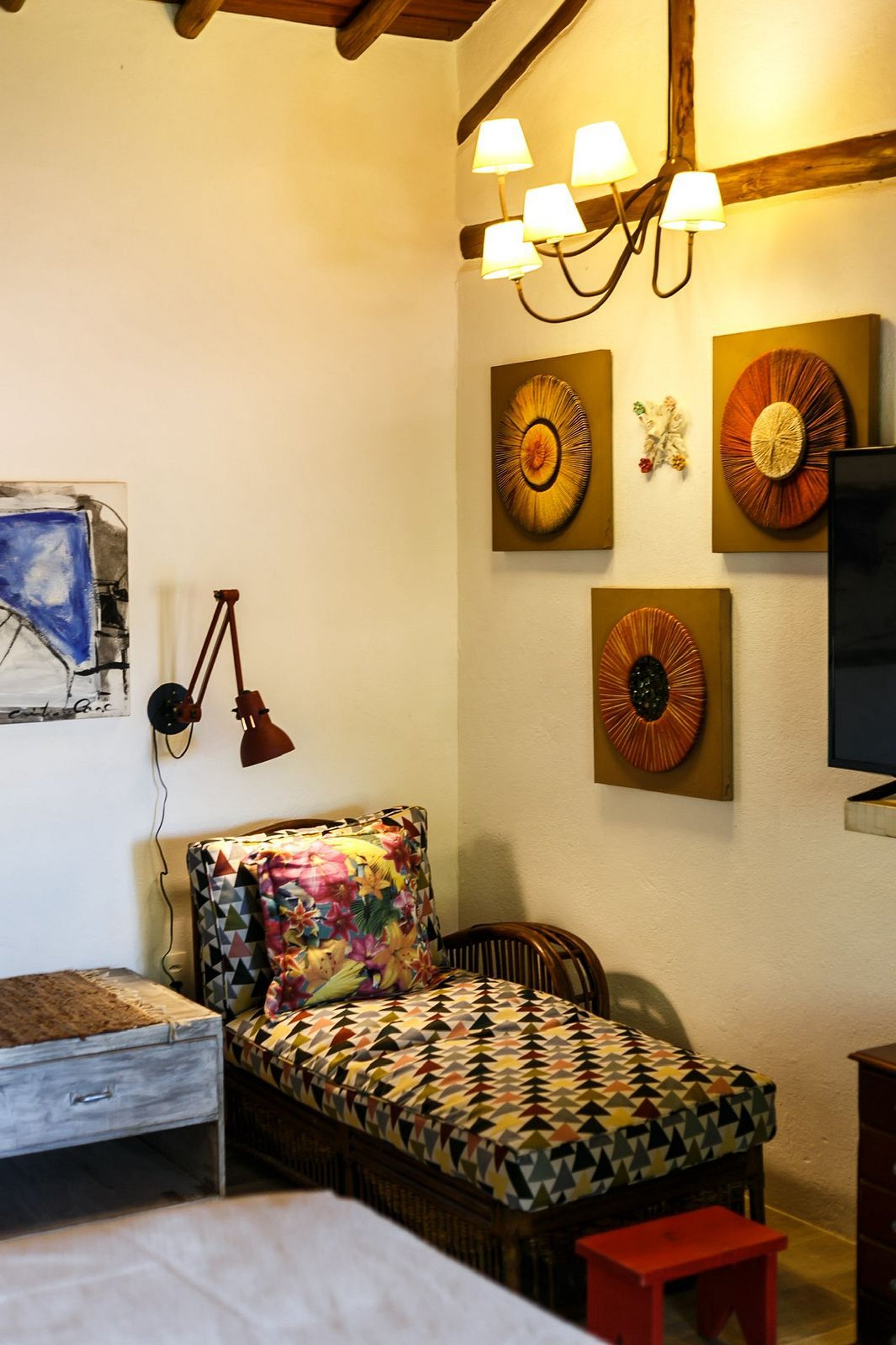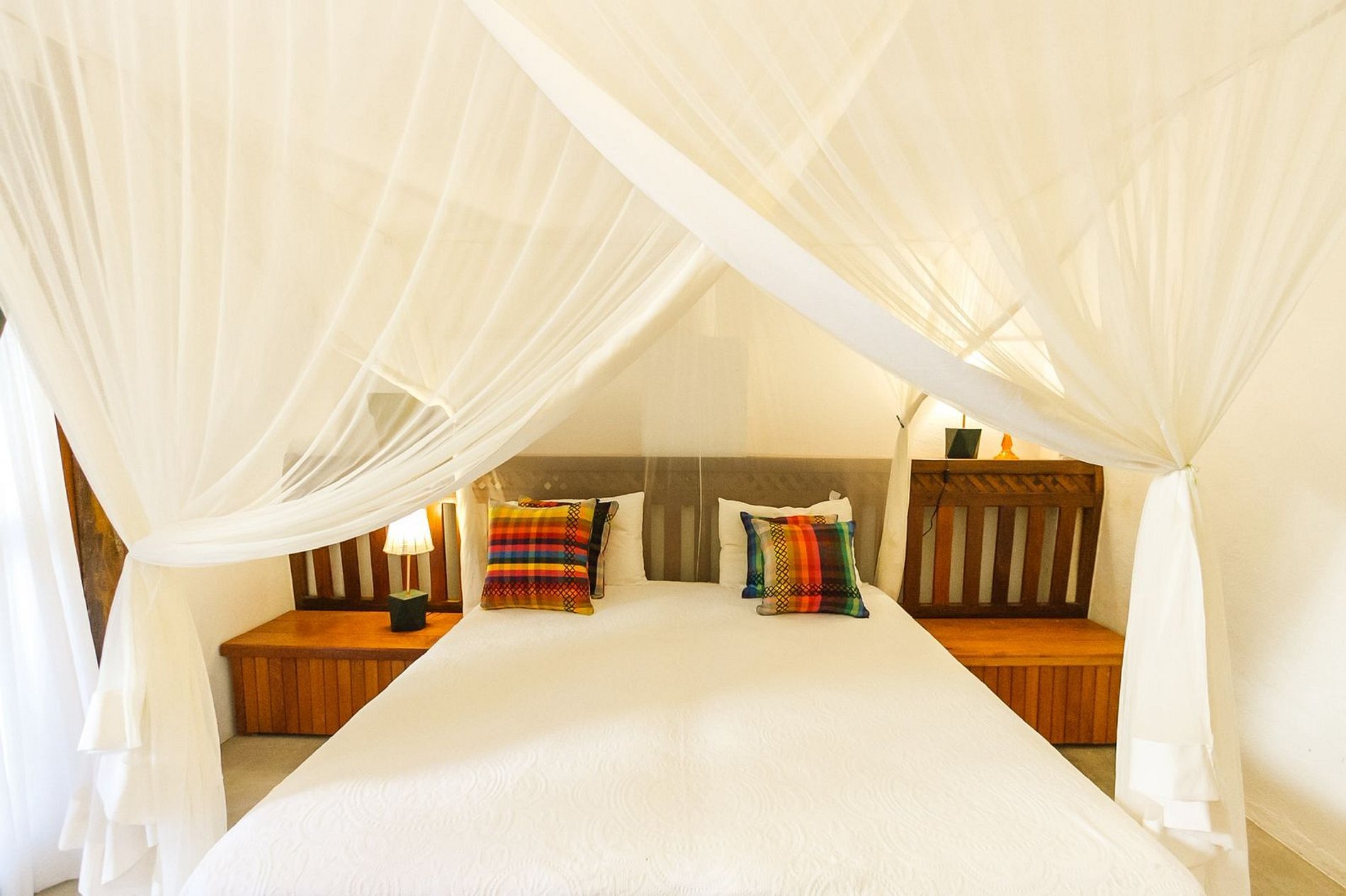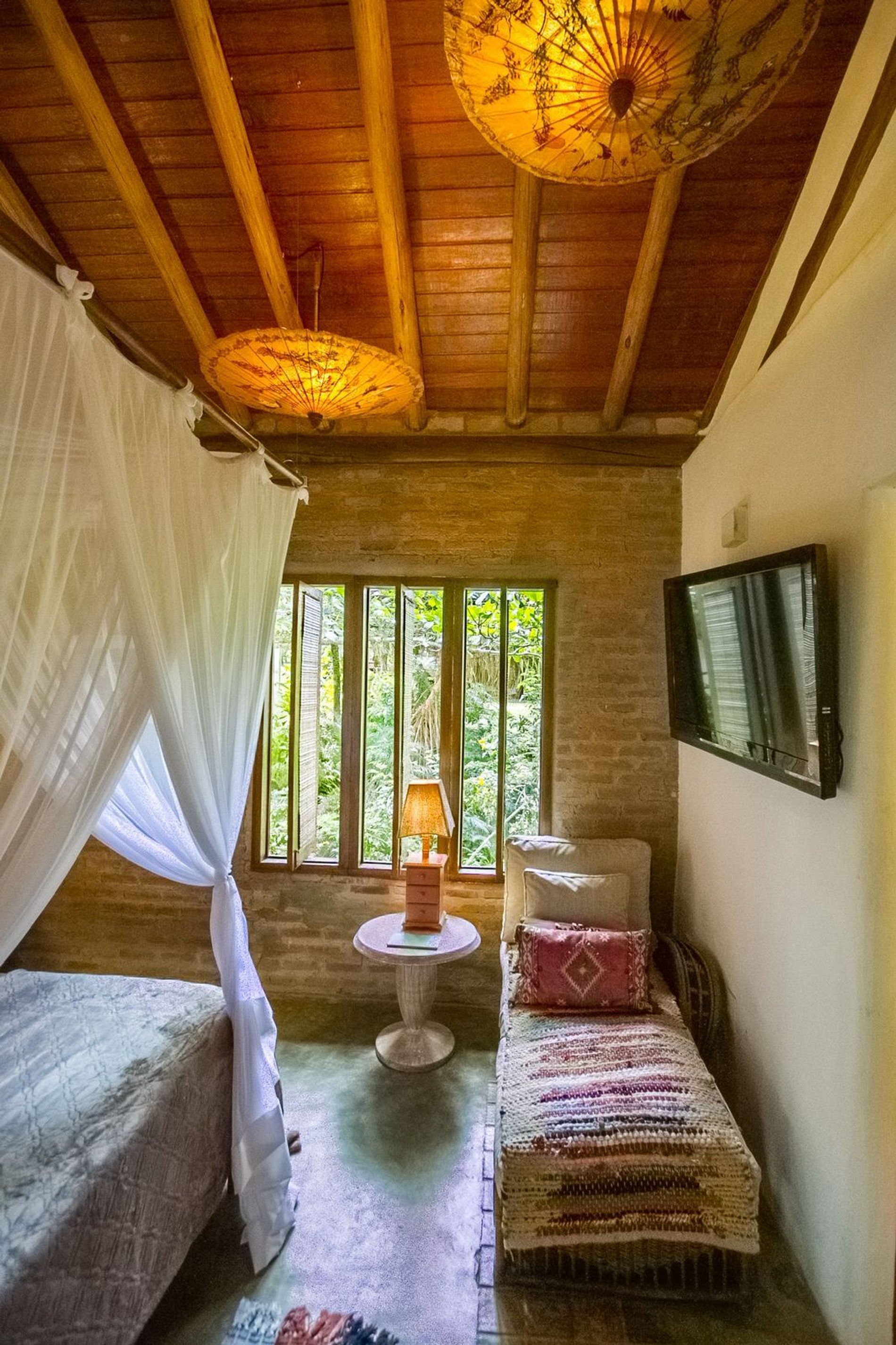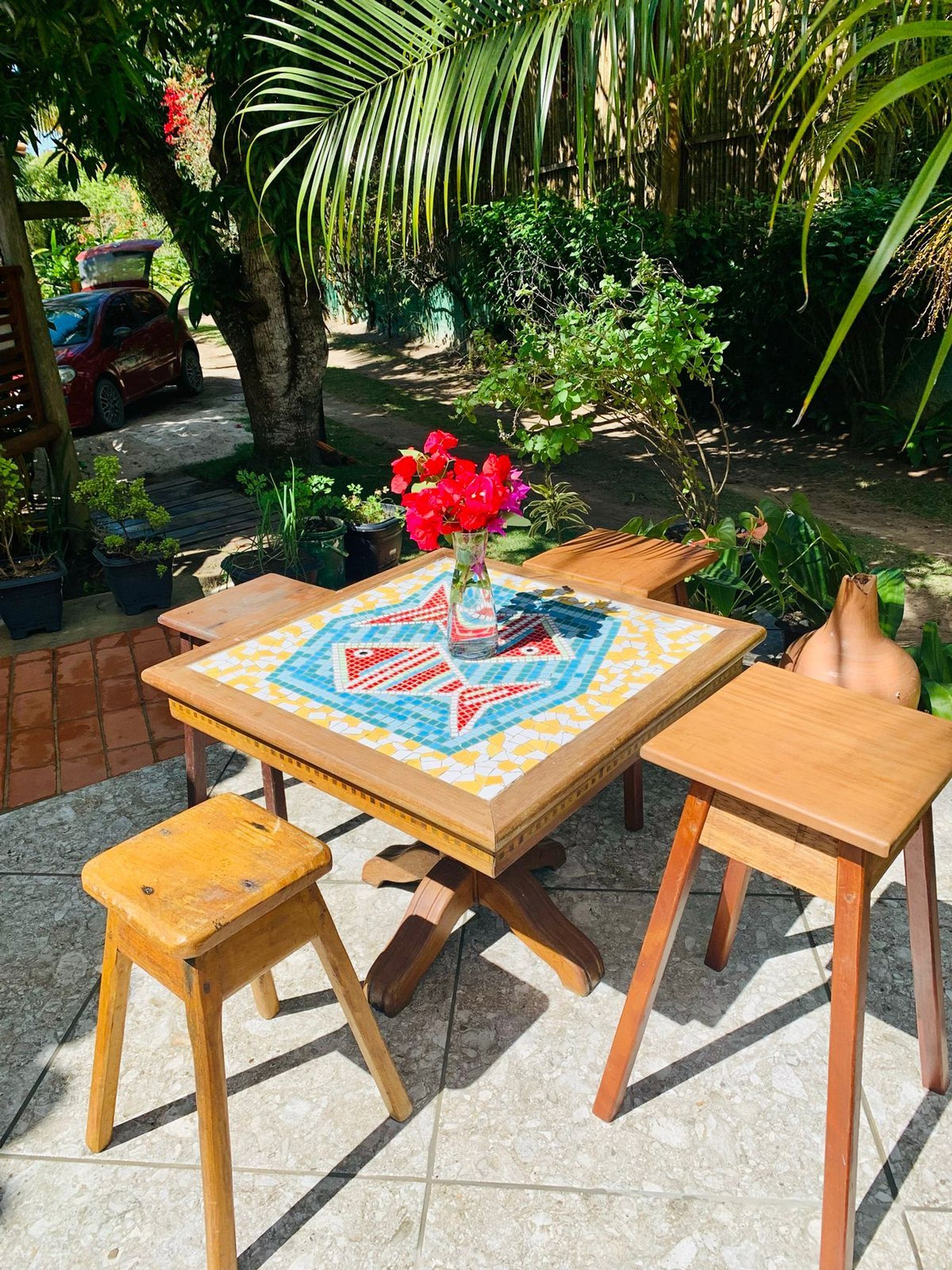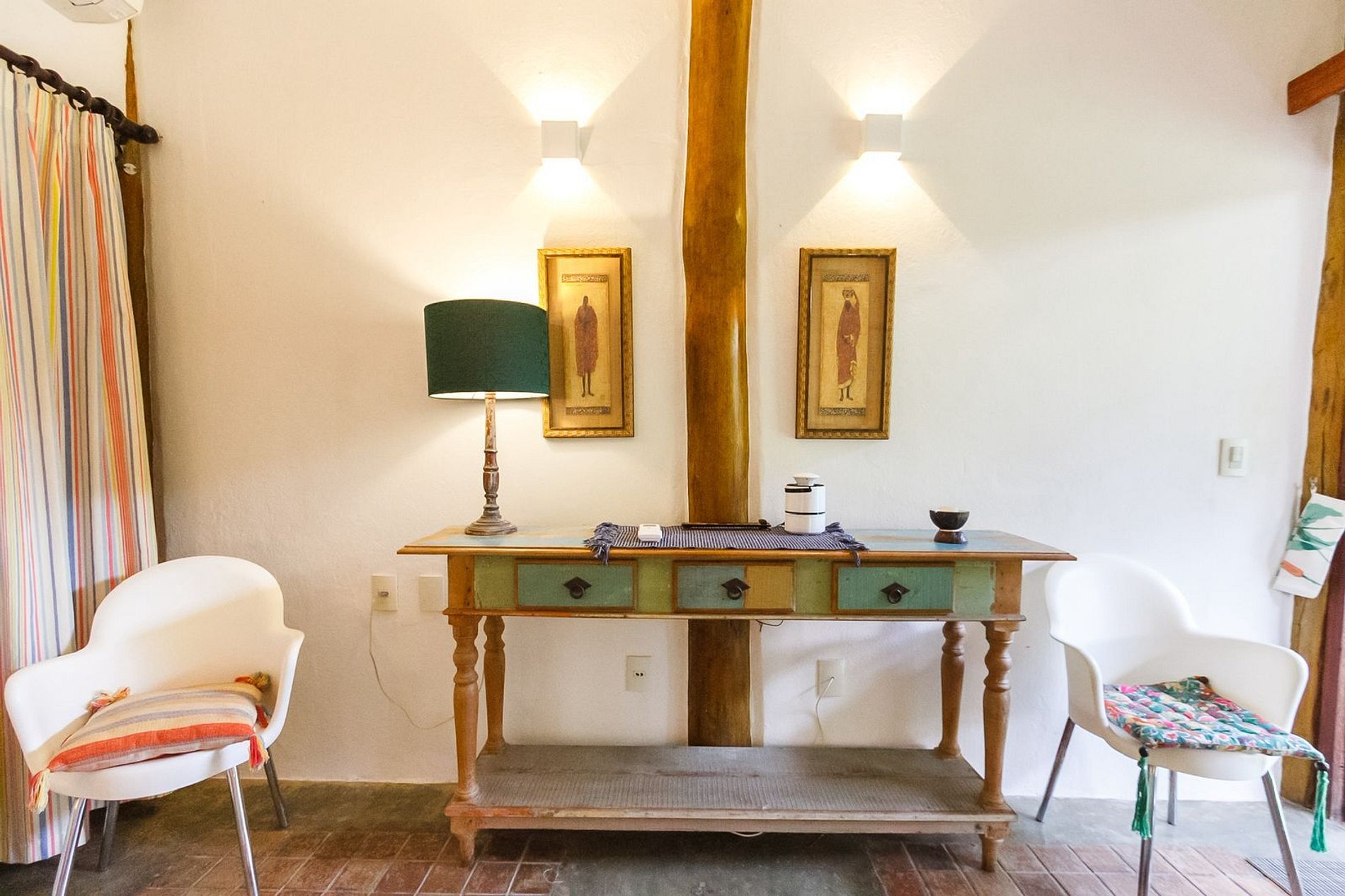 Os ambientes internos são espaçosos, bem iluminados e decorados com artefatos locais que refletem o estilo baiano. A casa conta com sala de TV climatizada, cozinha de apoio e amplas varandas integradas, ideais para descanso e convivência. A arquitetura assinada por Daniel Fromer valoriza a luz natural e o contato com o verde, proporcionando uma sensação constante de bem-estar e harmonia.