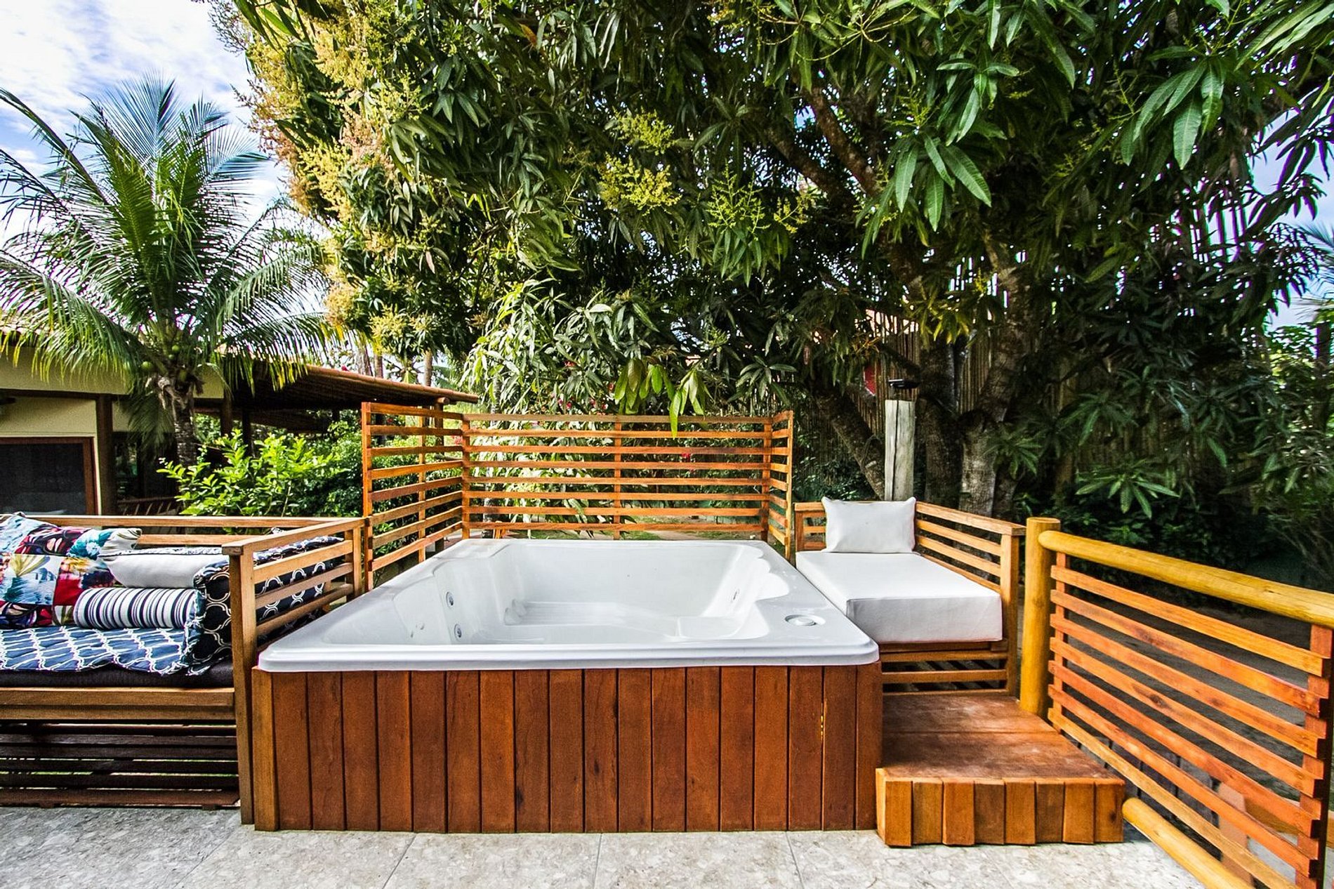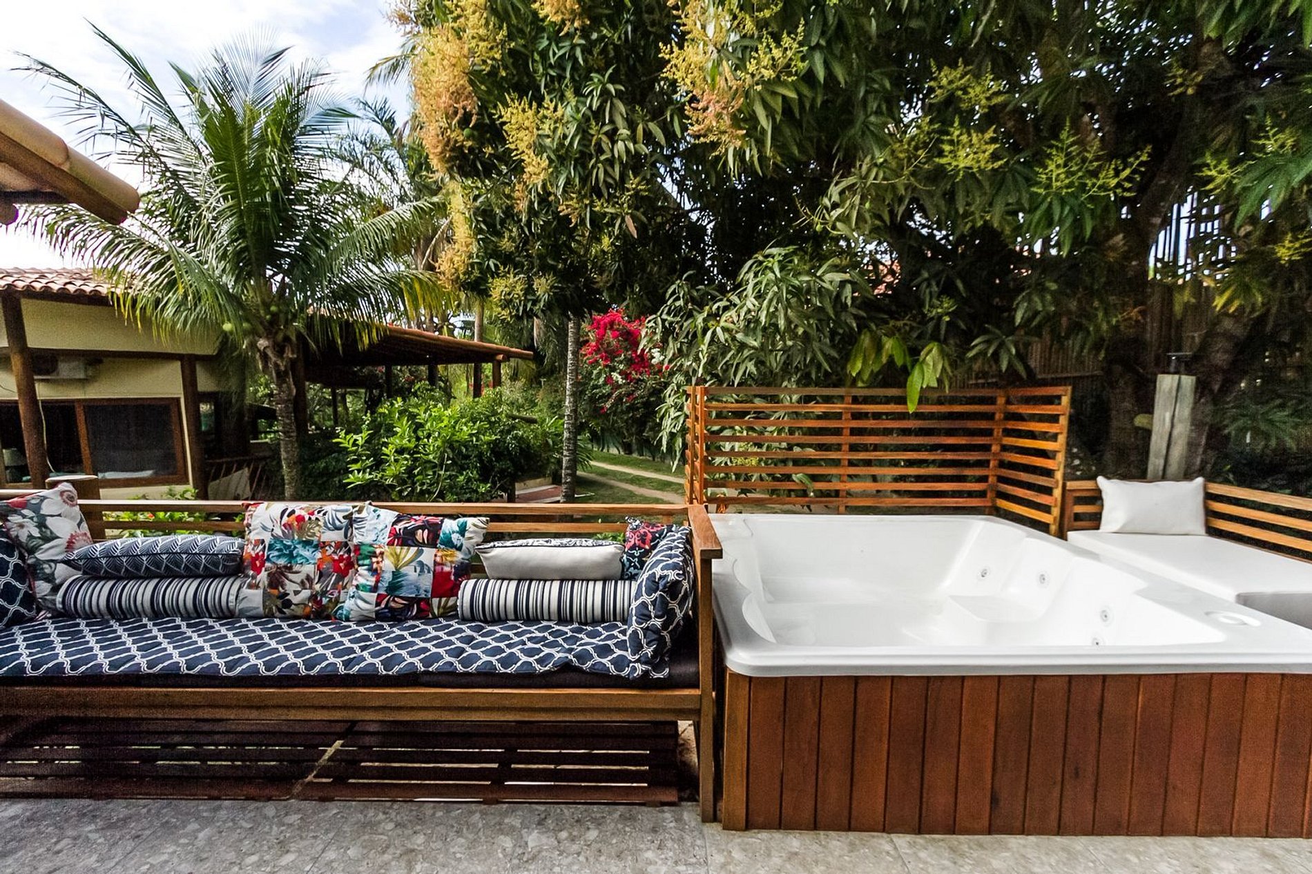 Cercada por um belíssimo jardim tropical de 5000 m², a casa proporciona total imersão na natureza. O amplo gramado é perfeito para relaxar, brincar com as crianças ou simplesmente curtir o som dos pássaros. A área gourmet completa com churrasqueira, forno de pizza e parrilha é o ponto de encontro perfeito para refeições ao ar livre. Há ainda piscina com vista para o vale, ducha externa, quadra de beach tênis privativa e aparelhos para exercícios básicos, além de acesso ao Clube de Praia do condomínio, a apenas 250 metros de distância.