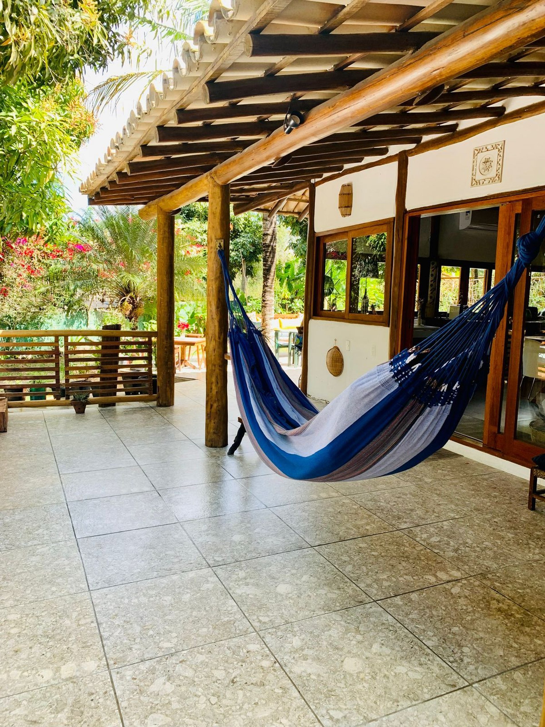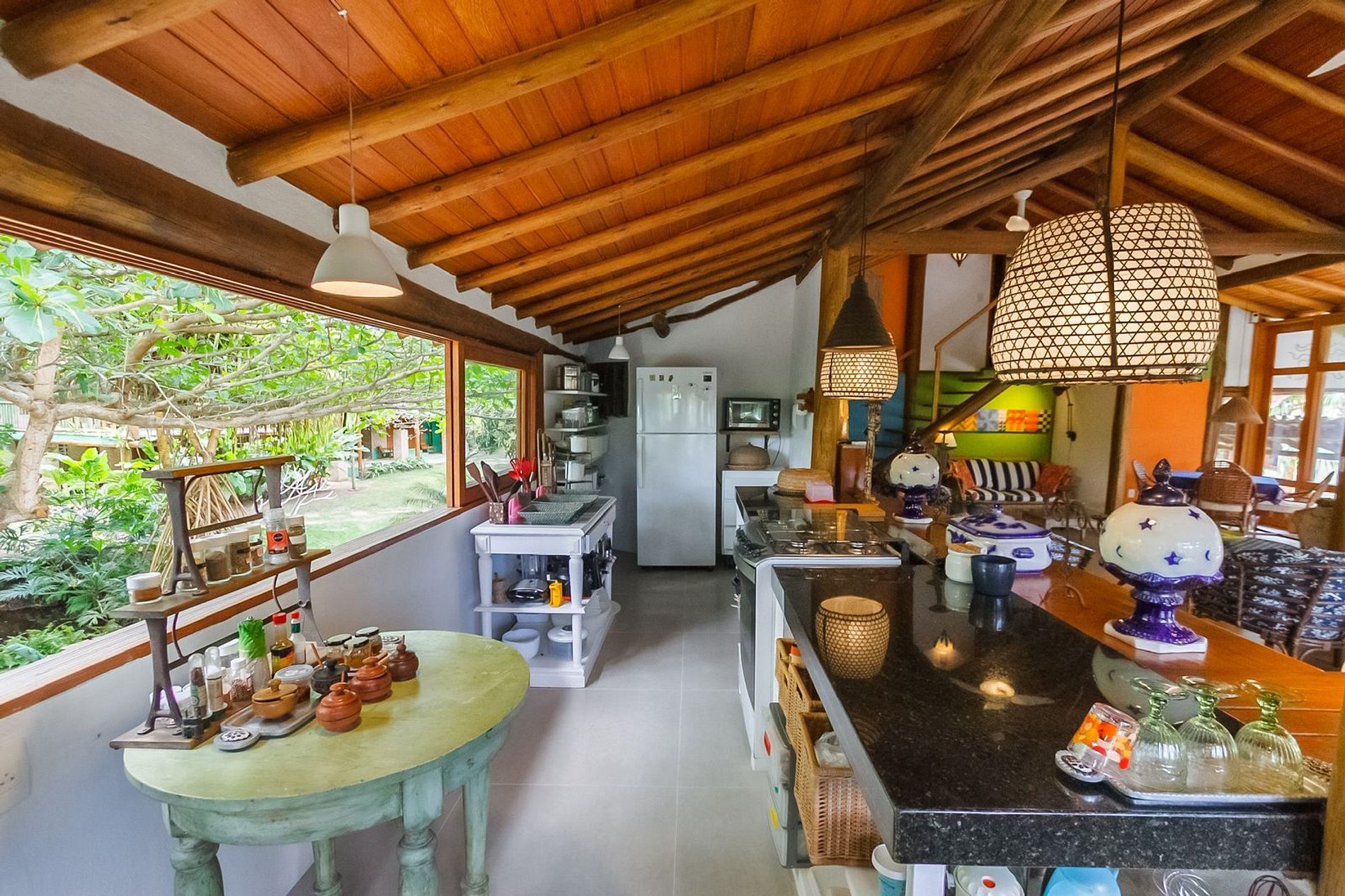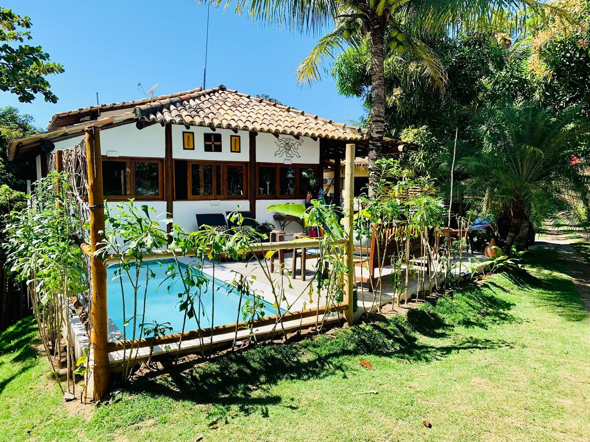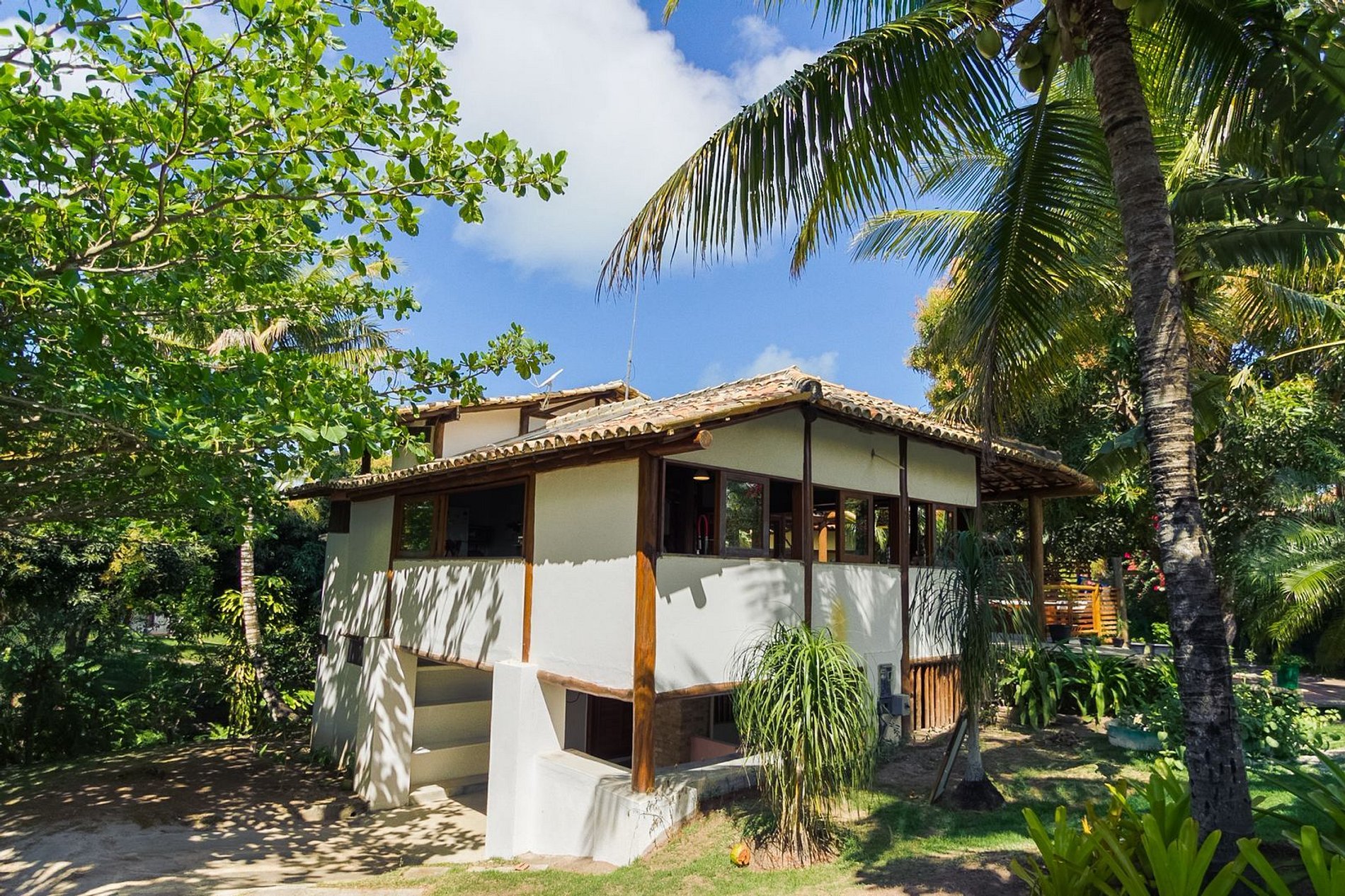 Os ambientes internos são espaçosos, bem iluminados e decorados com artefatos locais que refletem o estilo baiano. A casa conta com sala de TV climatizada, cozinha de apoio e amplas varandas integradas, ideais para descanso e convivência. A arquitetura assinada por Daniel Fromer valoriza a luz natural e o contato com o verde, proporcionando uma sensação constante de bem-estar e harmonia.