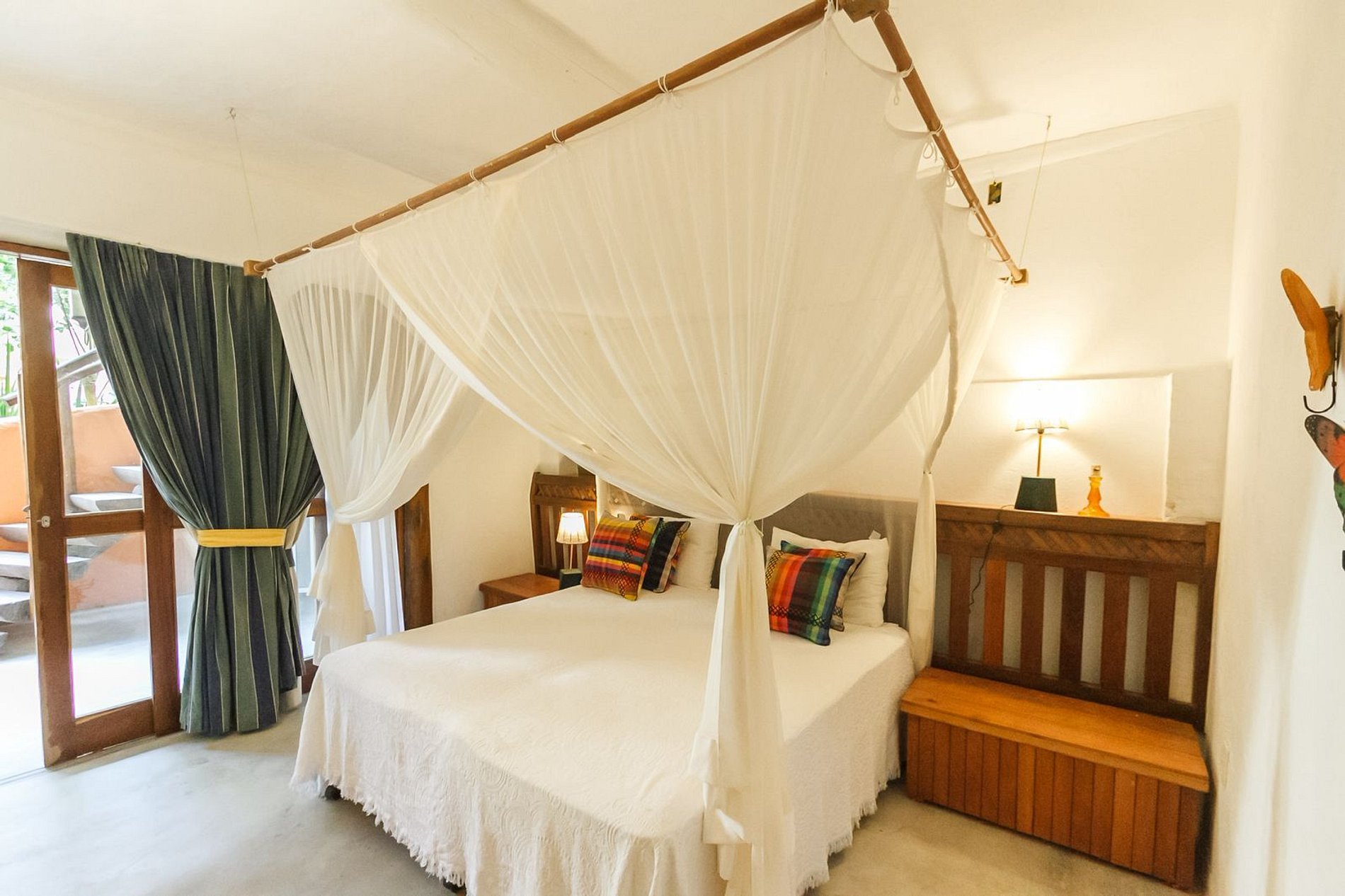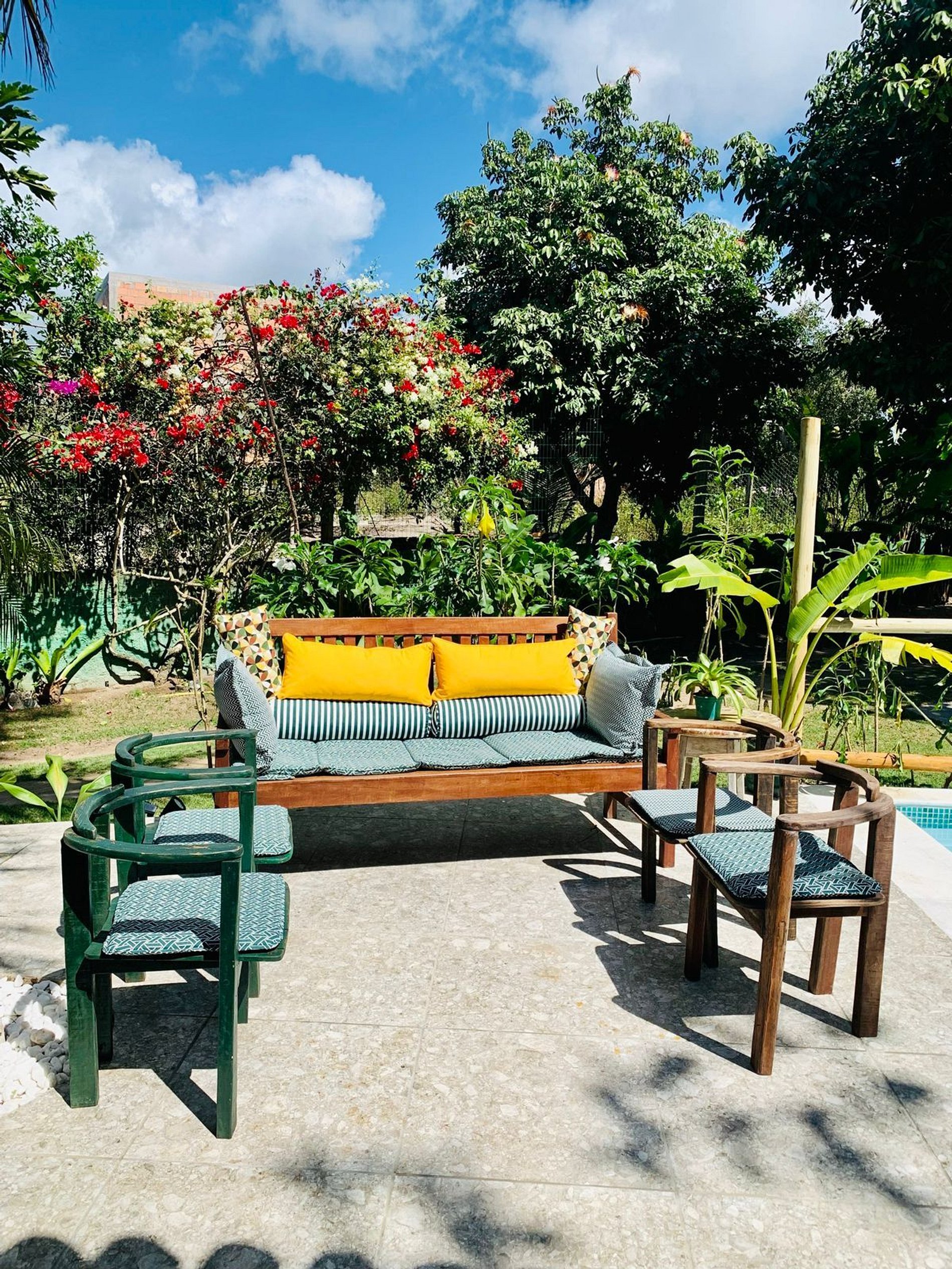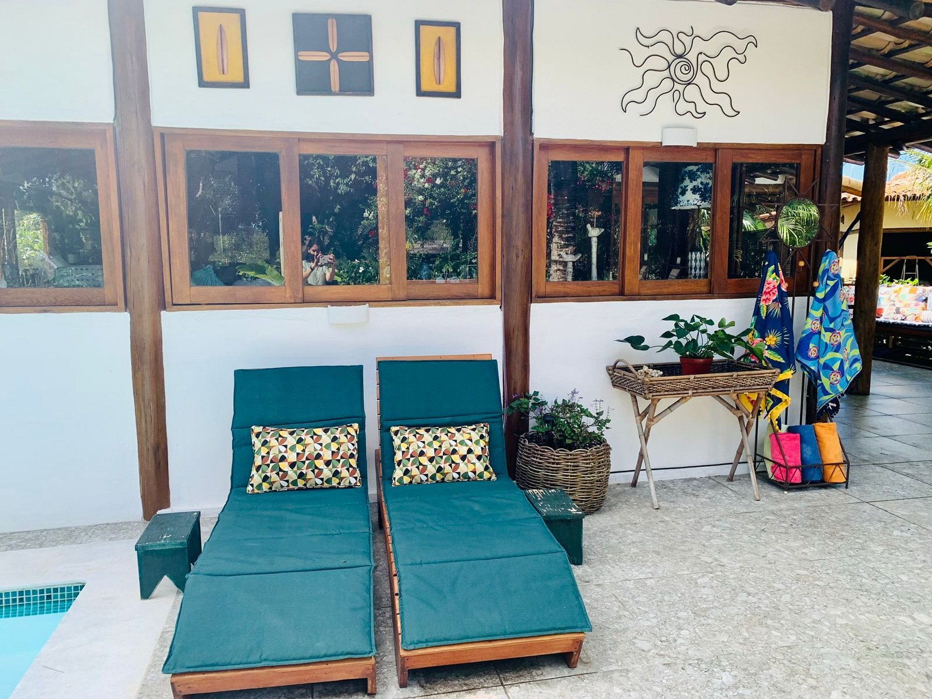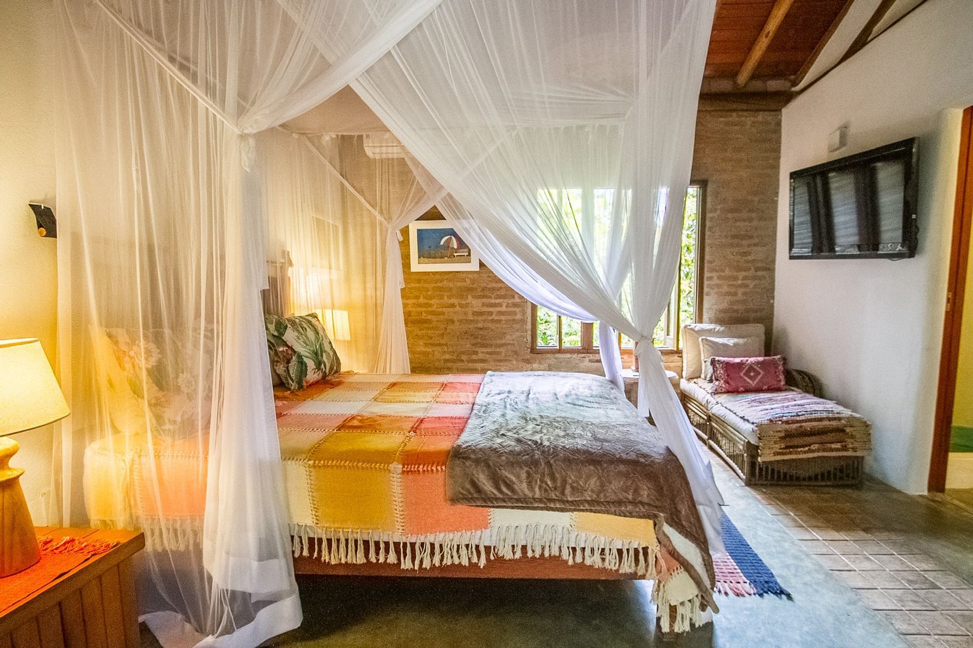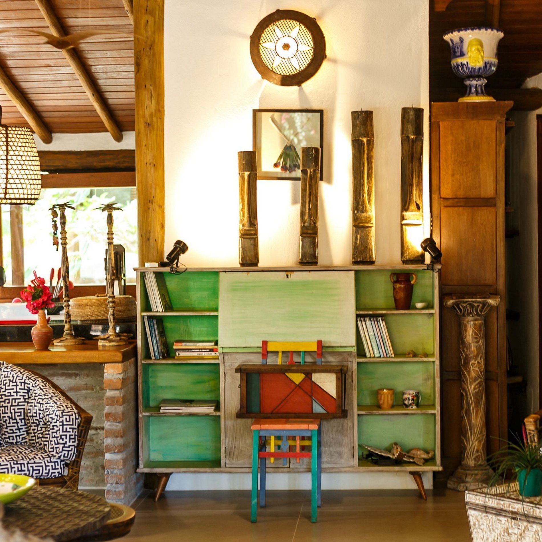 Os ambientes internos são espaçosos, bem iluminados e decorados com artefatos locais que refletem o estilo baiano. A casa conta com sala de TV climatizada, cozinha de apoio e amplas varandas integradas, ideais para descanso e convivência. A arquitetura assinada por Daniel Fromer valoriza a luz natural e o contato com o verde, proporcionando uma sensação constante de bem-estar e harmonia.