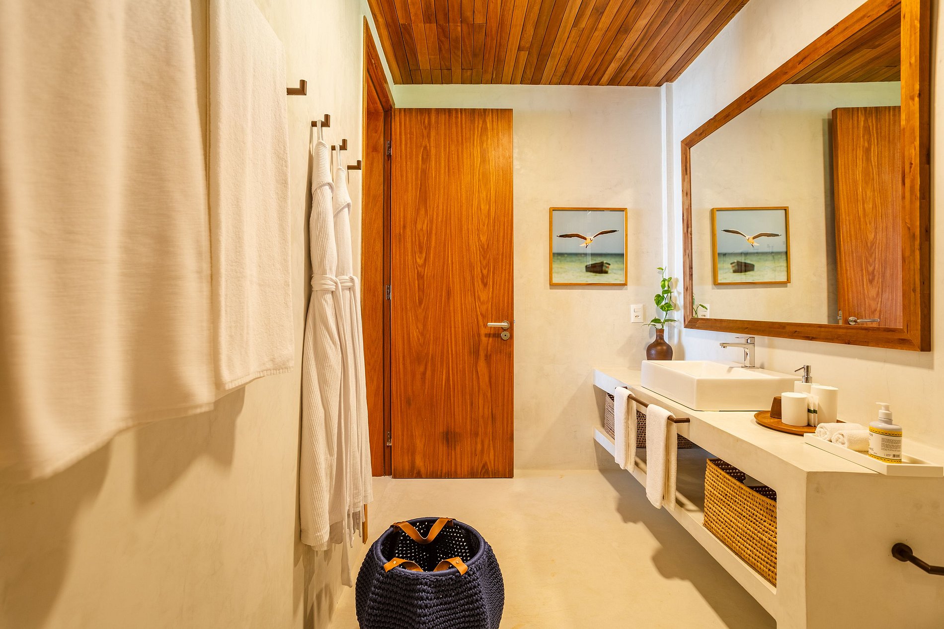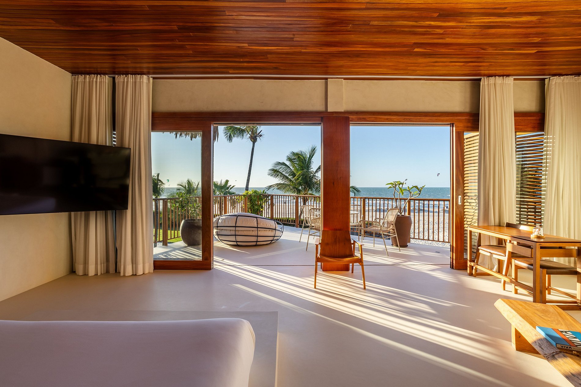 Os ambientes da Vila Siará foram planejados para proporcionar conforto e bem-estar. A sala de estar é ampla, arejada e integrada à sala de jantar e à varanda, criando uma atmosfera acolhedora e luminosa. O design valoriza materiais naturais e tons neutros, refletindo o estilo elegante e relaxante do litoral cearense.