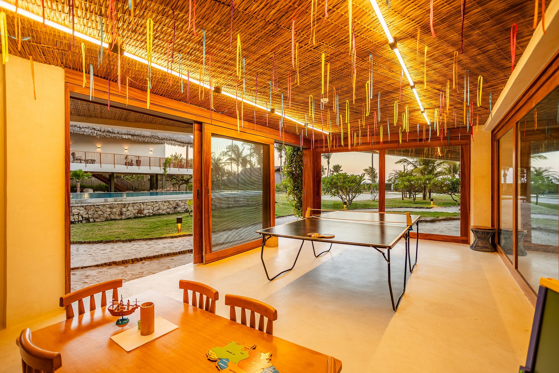 Rodeada por um belo jardim tropical, a Vila Siará oferece uma piscina privativa com espreguiçadeiras, chuveirão e uma ampla área gourmet, perfeita para momentos de lazer e descontração. O espaço conta com churrasqueira, forno de pizza e bancada equipada, ideal para reunir amigos e familiares em torno de boas refeições e conversas ao ar livre.