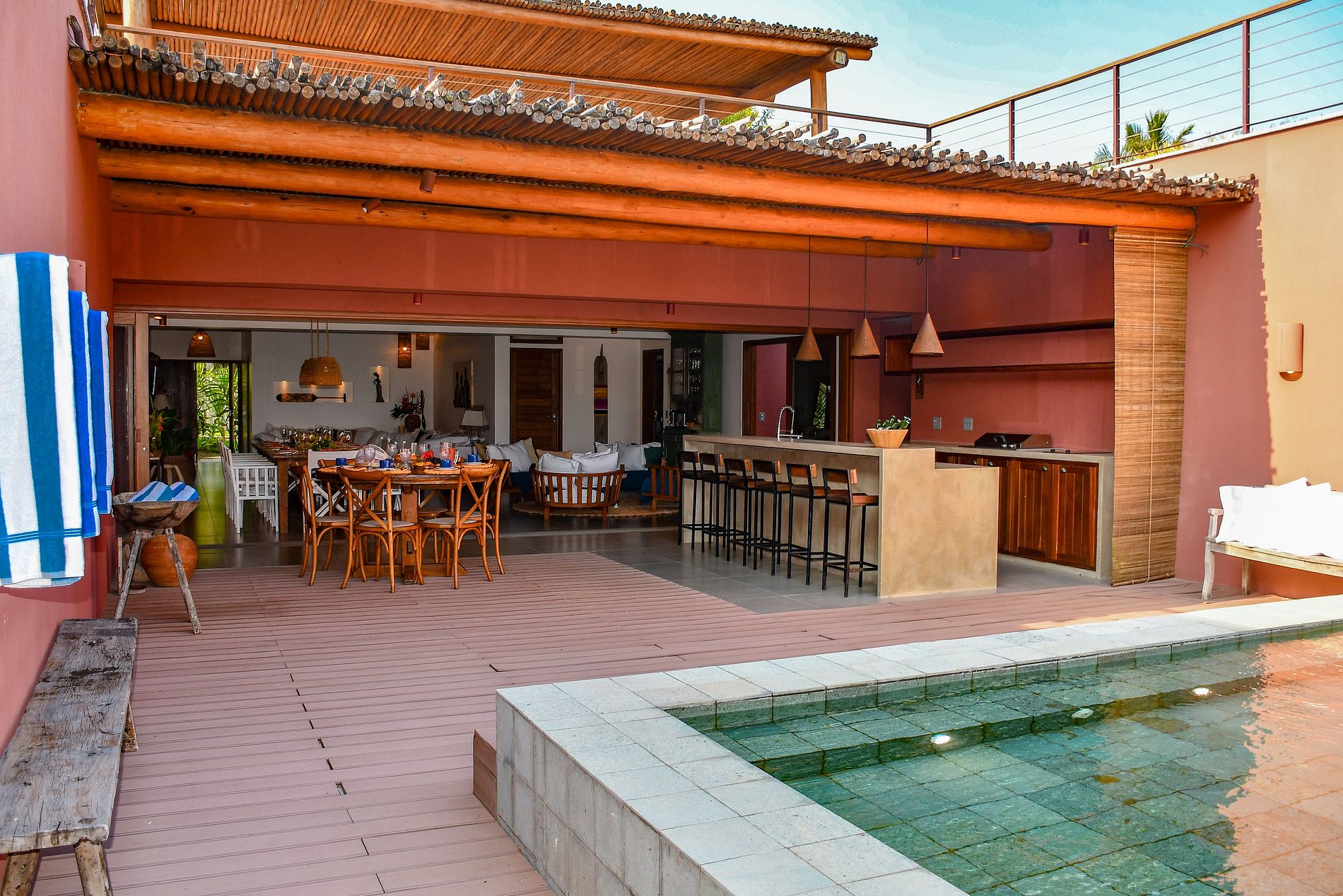A cozinha ampla e bem equipada reflete o equilíbrio entre funcionalidade e estilo. No espaço gourmet, com churrasqueira e bancadas em madeira, o clima é de descontração e boas conversas — perfeito para almoços longos e jantares sob o pôr do sol de Trancoso.