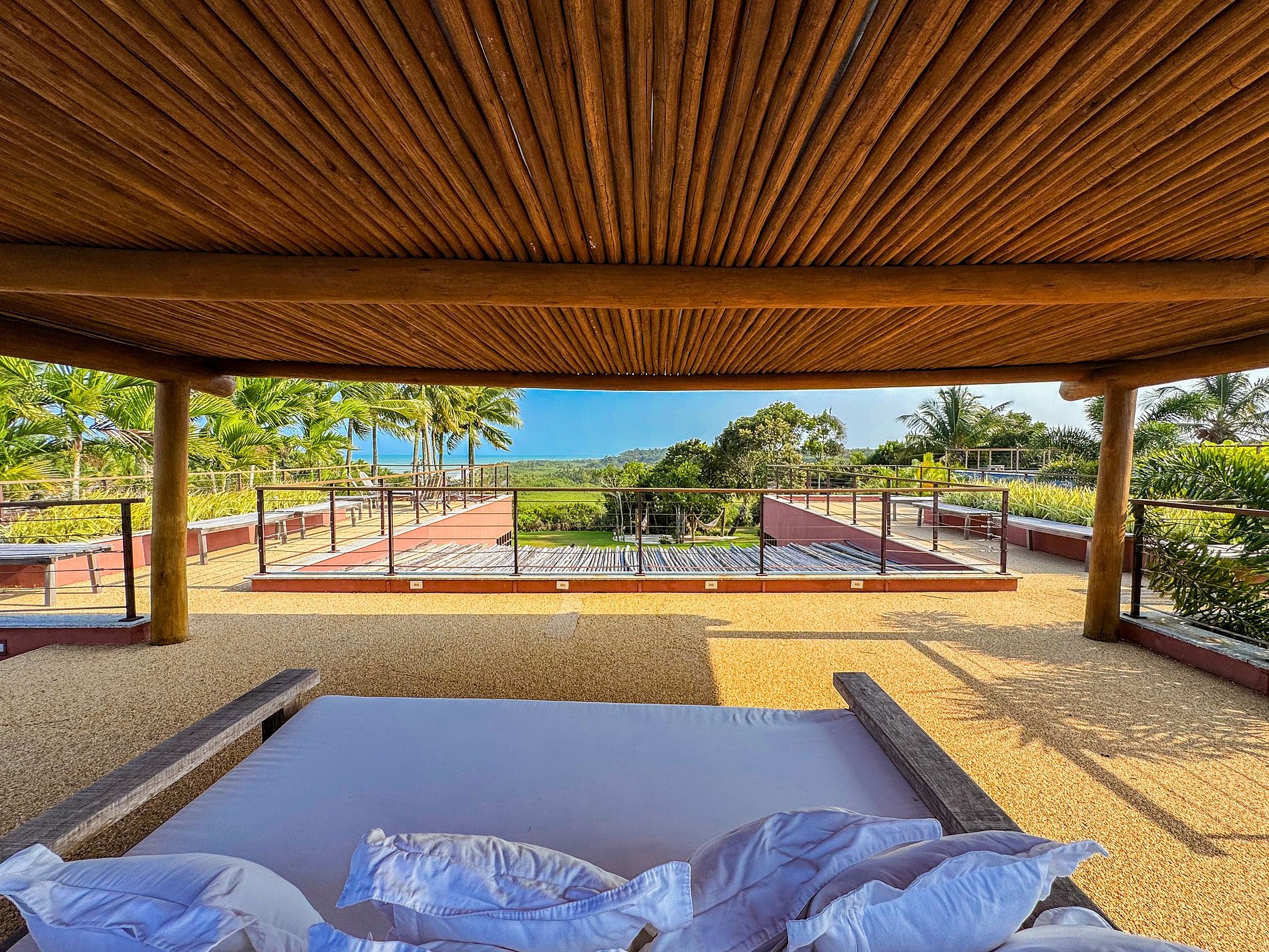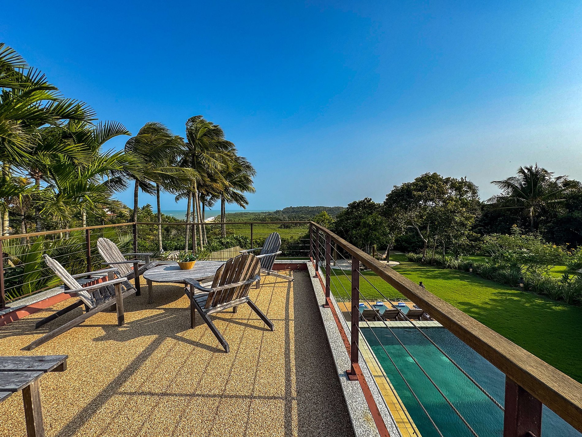 A varanda espaçosa convida a contemplar a paisagem e o pôr do sol baiano. O espaço reúne áreas de estar acolhedoras, espreguiçadeiras e uma rede com vista para o verde — o cenário ideal para relaxar ao som da natureza ou compartilhar momentos tranquilos com amigos e família.