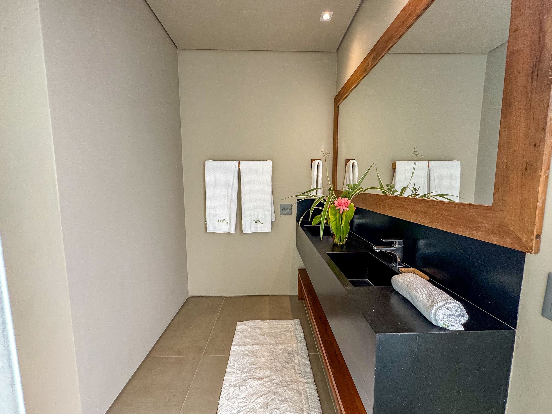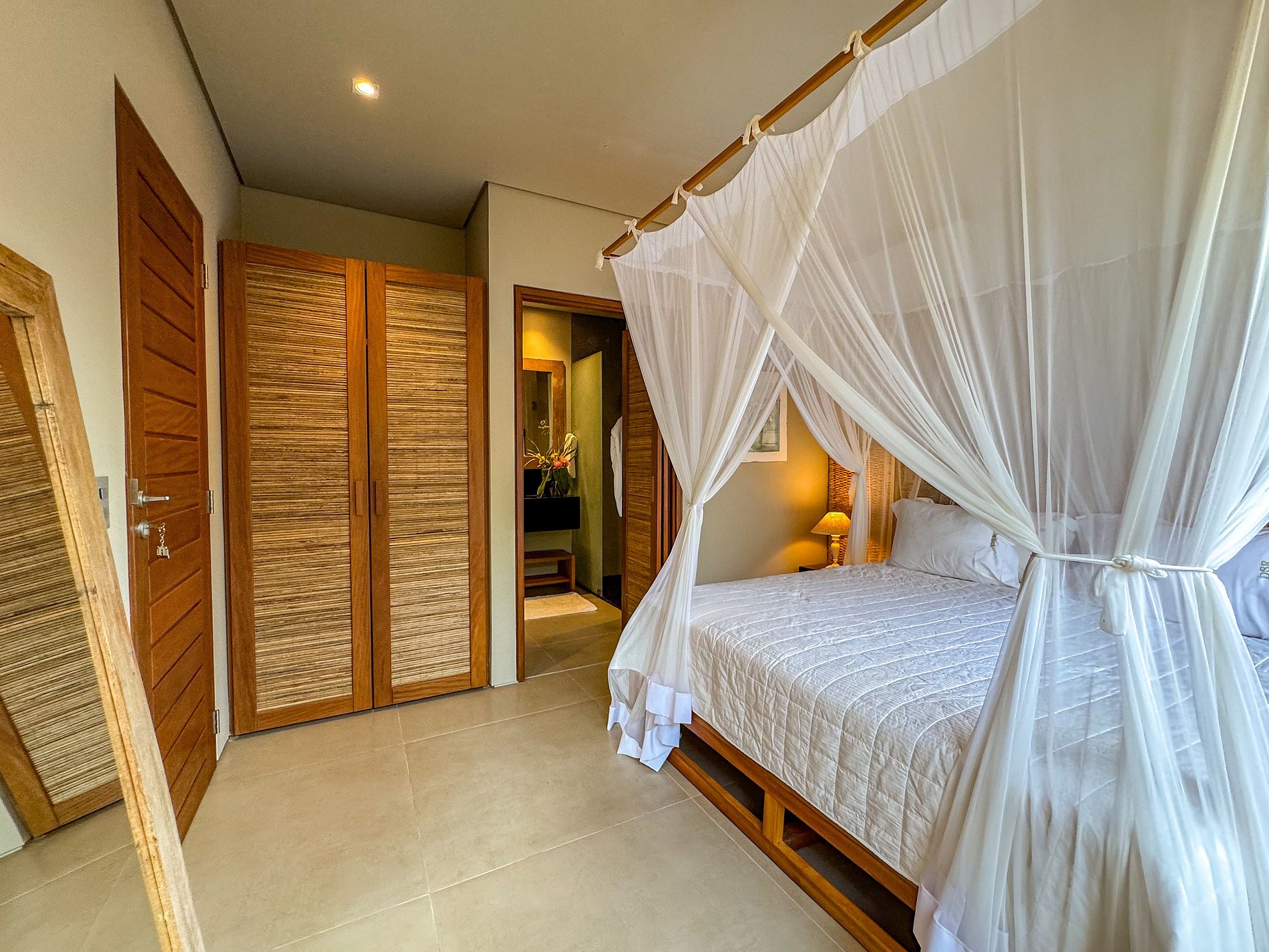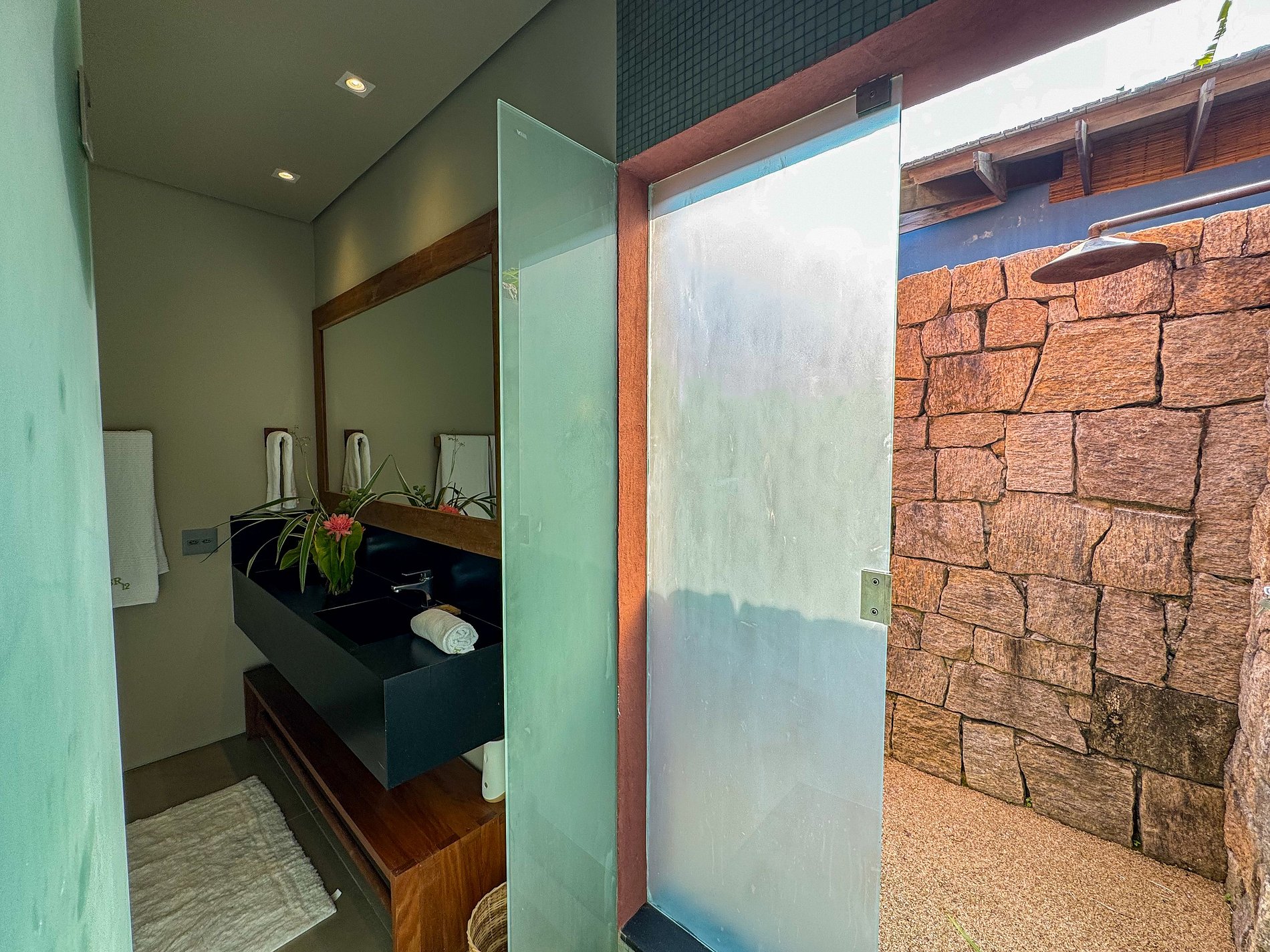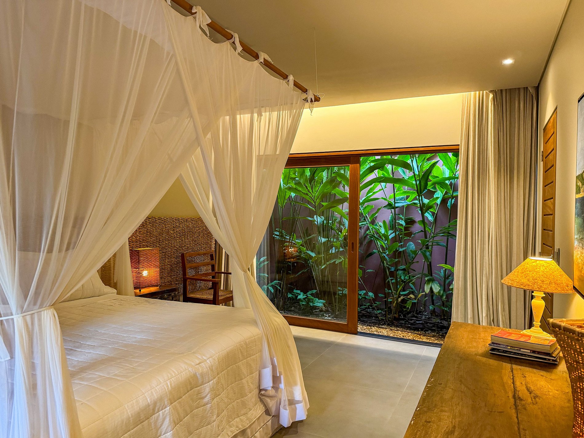 A casa dispõe de 5 suítes com camas de casal, todas climatizadas e decoradas com elegância e conforto. Cada quarto é um refúgio privativo, pensado para oferecer bem-estar e tranquilidade após um dia entre o mar e o sossego da mata.