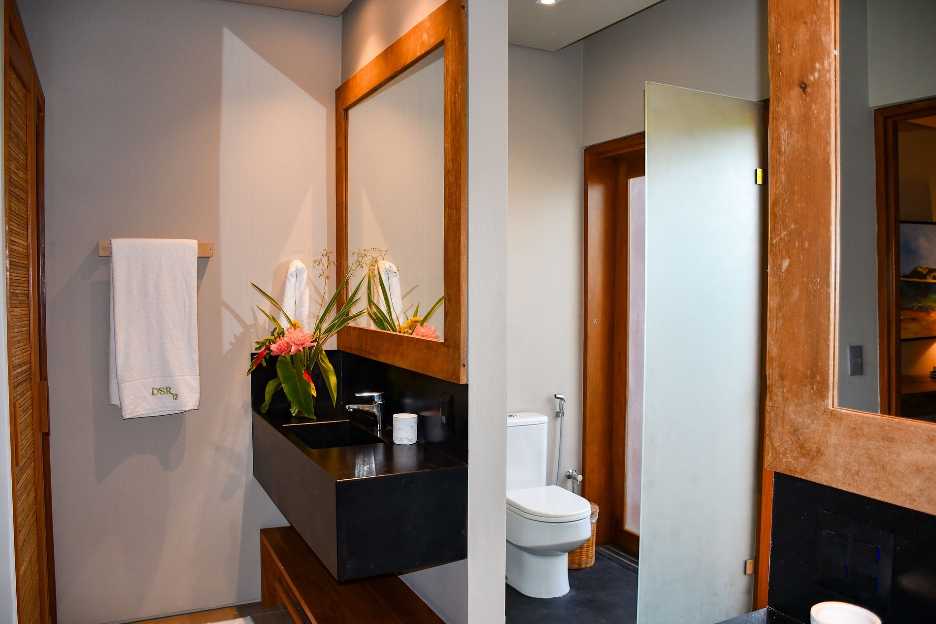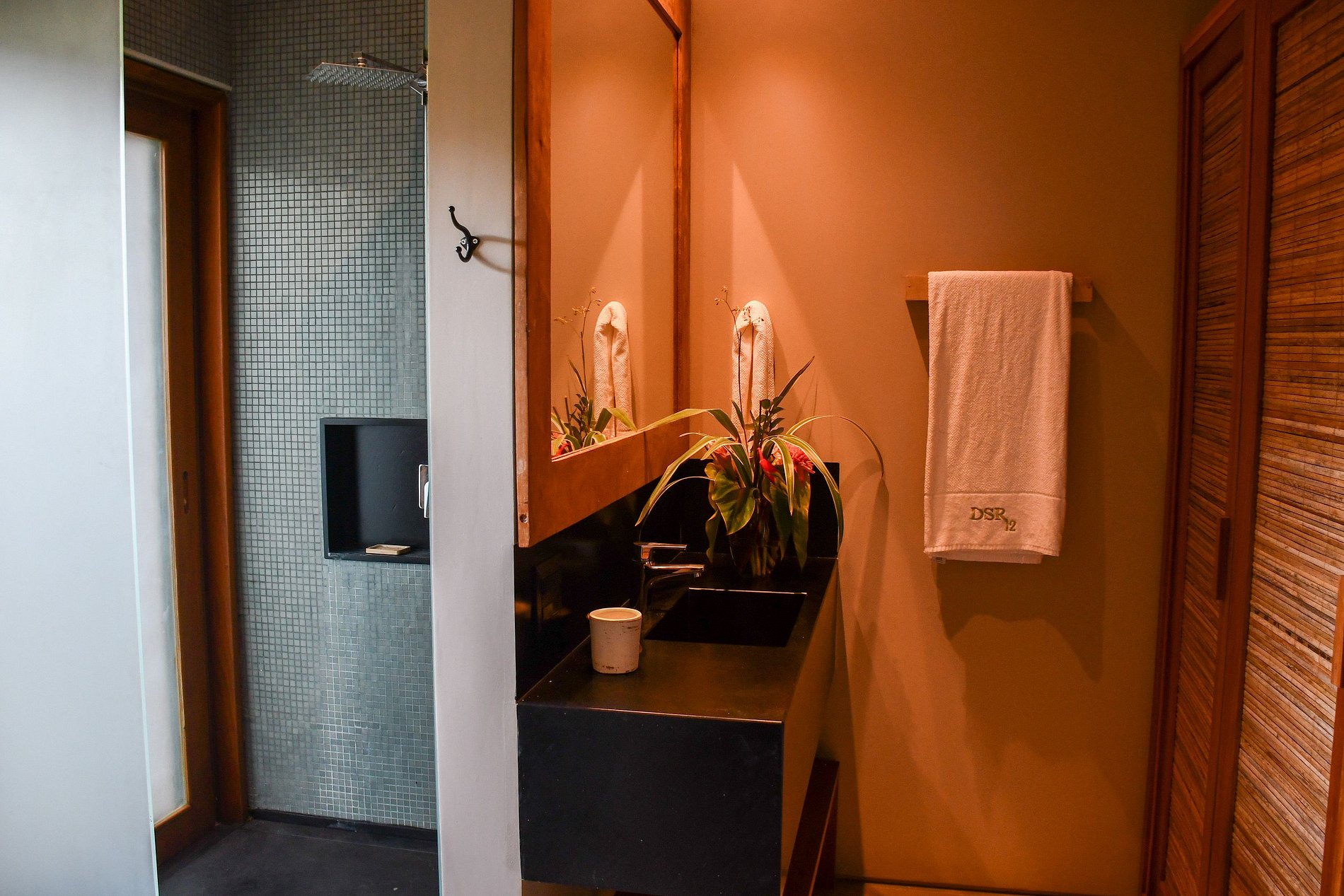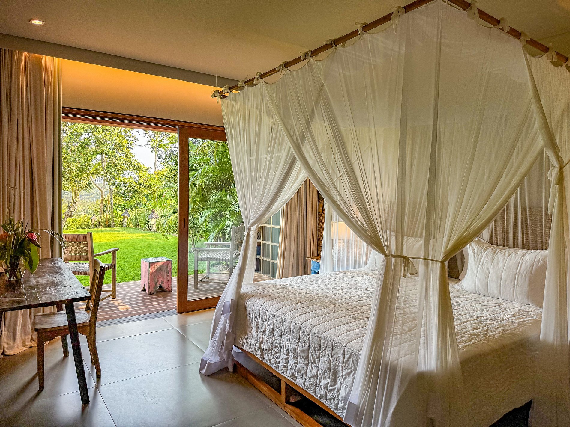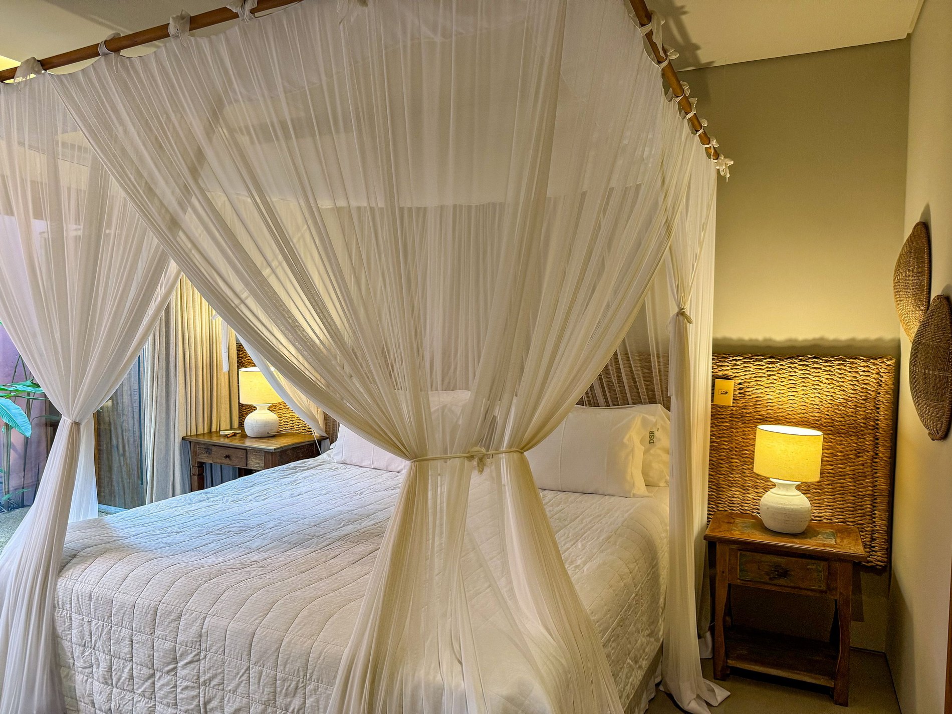 A casa dispõe de 5 suítes com camas de casal, todas climatizadas e decoradas com elegância e conforto. Cada quarto é um refúgio privativo, pensado para oferecer bem-estar e tranquilidade após um dia entre o mar e o sossego da mata.