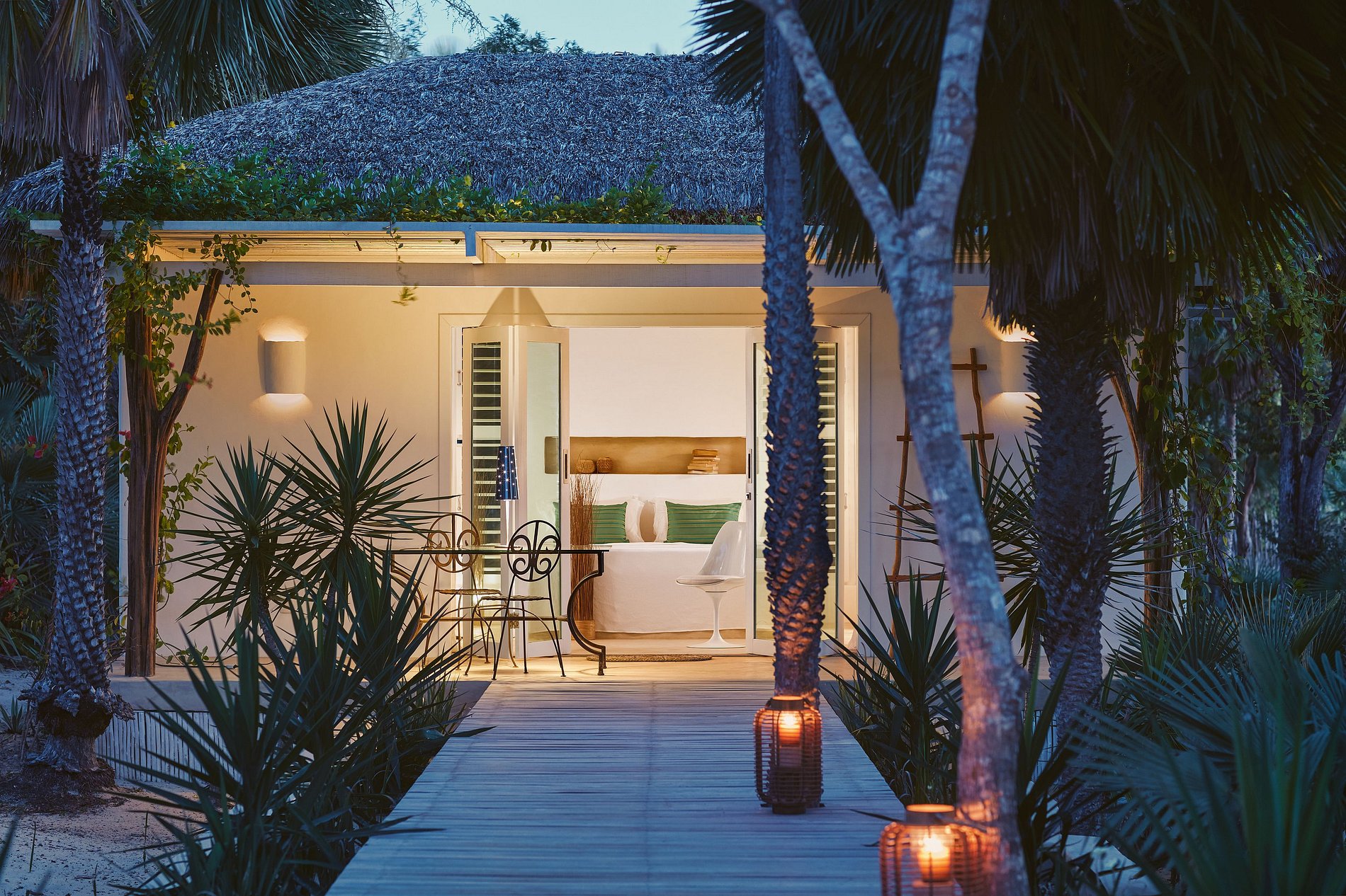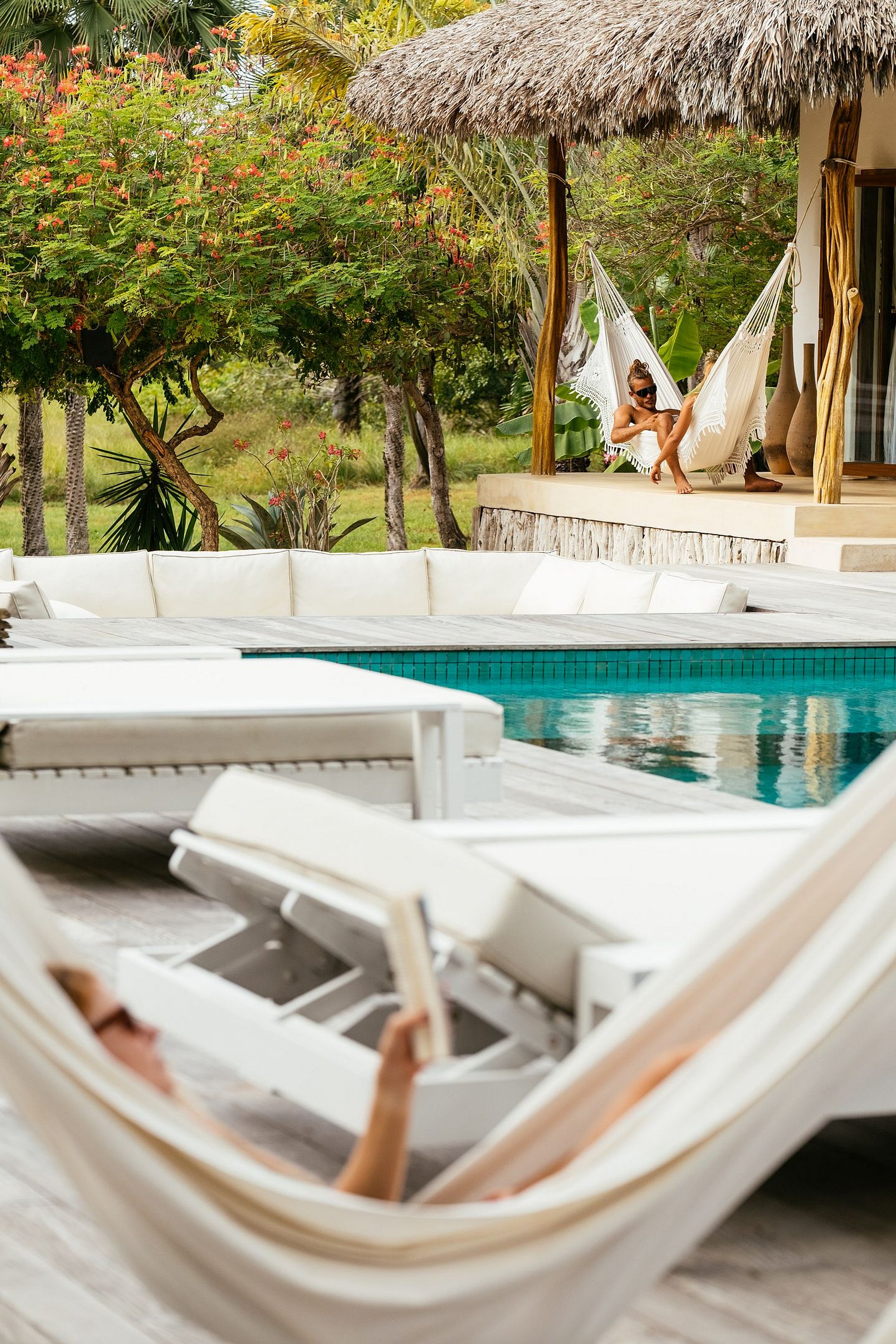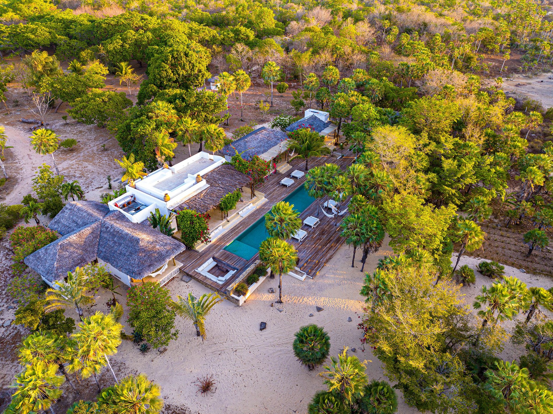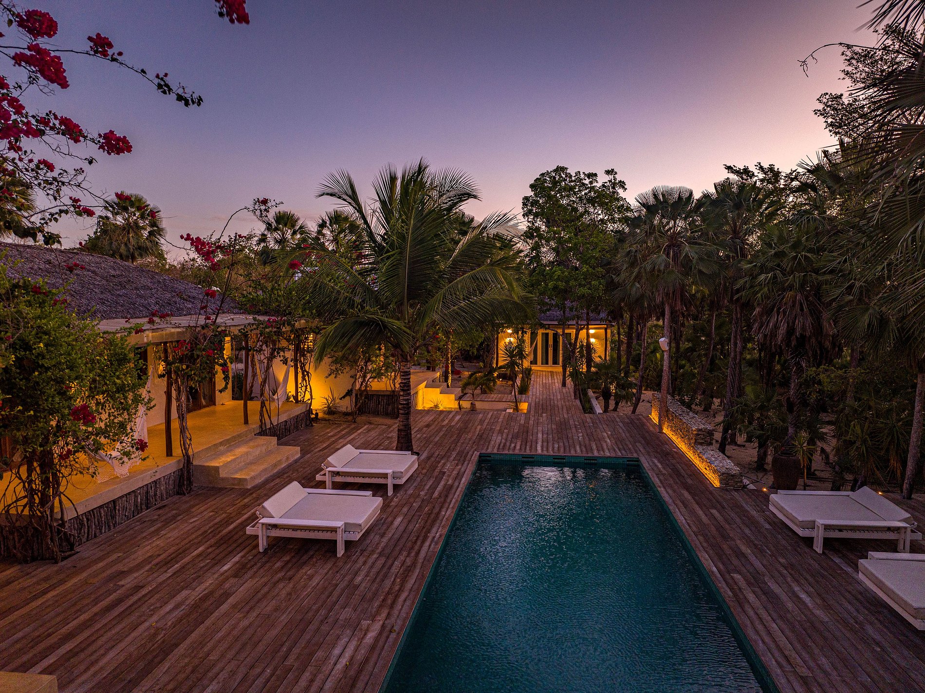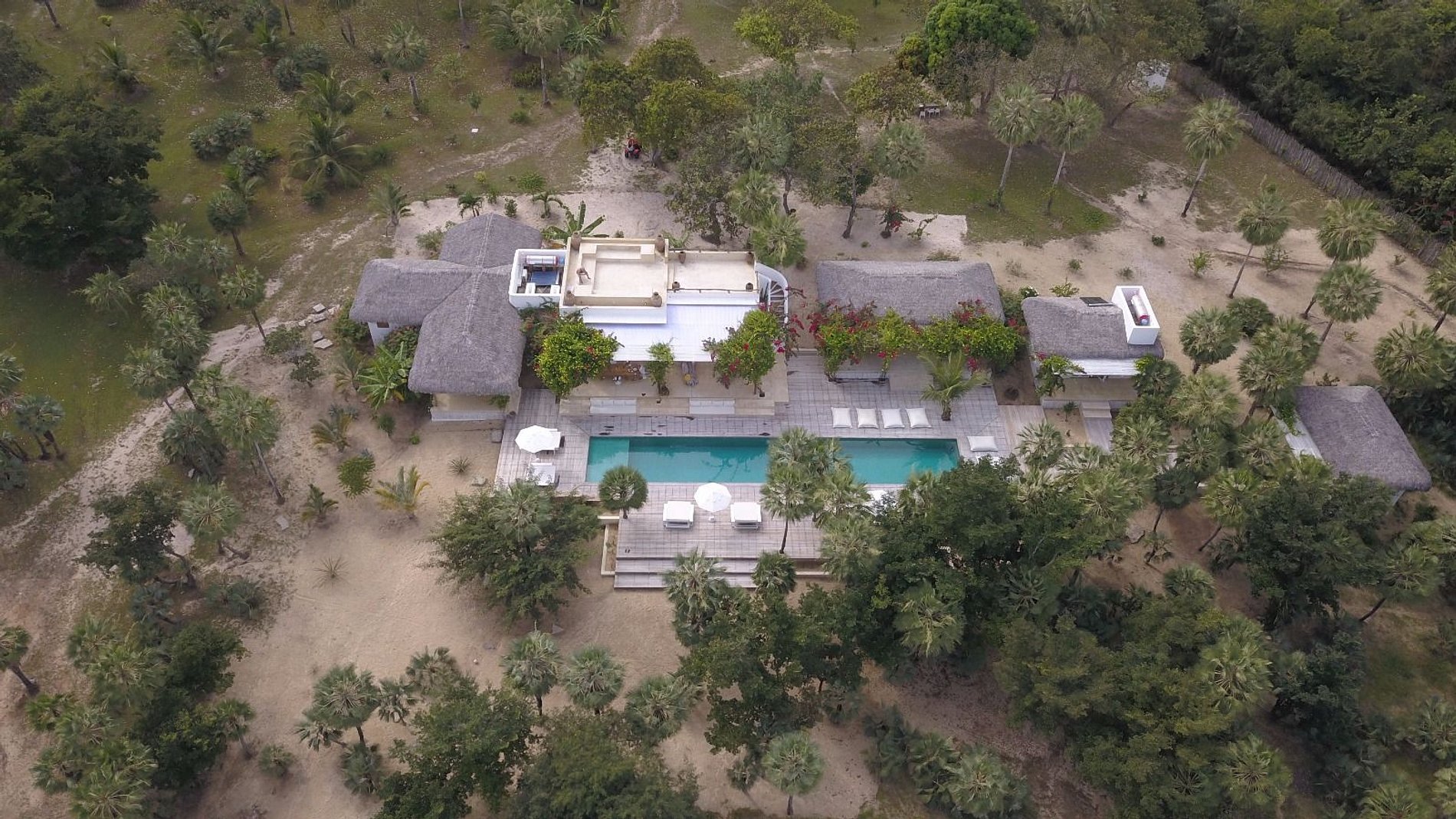 A casa térrea, de arquitetura refinada e integrada ao paisagismo natural, distribui-se em uma casa principal, dois bangalôs e dois chalés, todos projetados com harmonia e conforto. Os espaços se abrem para uma deslumbrante piscina verde-esmeralda de 25 metros, ladeada por palmeiras e carnaúbas — um verdadeiro convite ao descanso.
