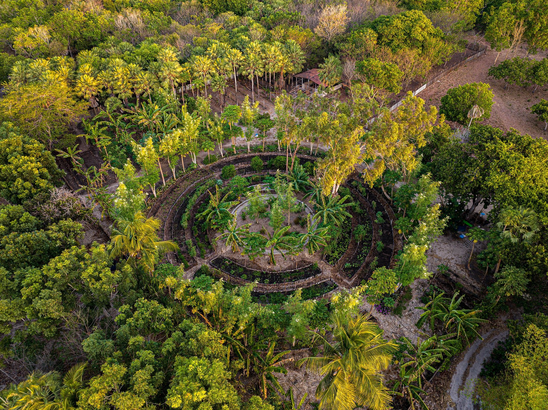 Entre as árvores, uma ampla mesa ao ar livre e uma churrasqueira criam o cenário ideal para longos almoços e jantares entre amigos. A horta em formato de mandala, cultivada com cuidado, oferece frutas e legumes frescos que enriquecem a gastronomia local.