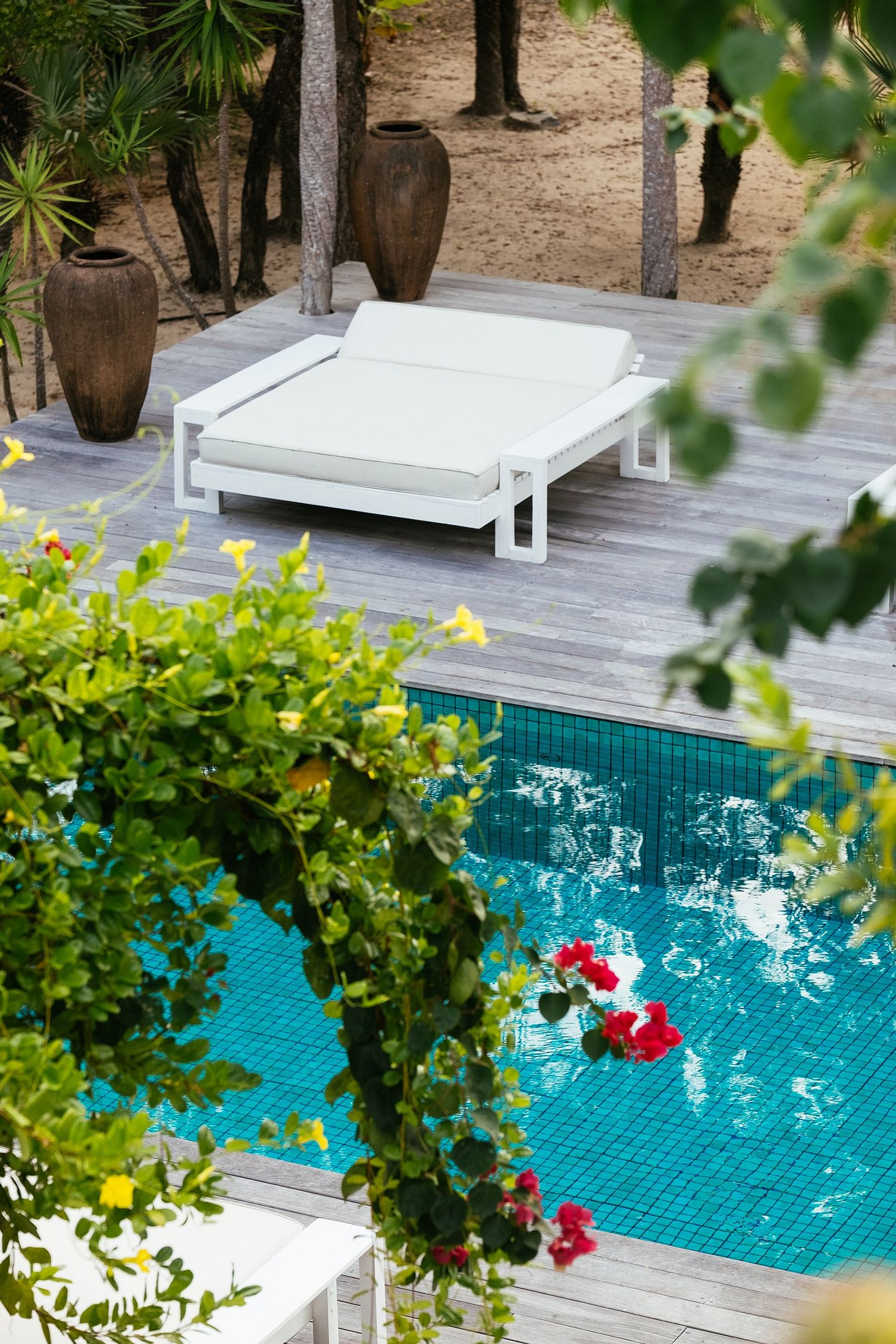 A piscina central, com seus 25 metros de extensão, é o ponto de encontro entre conforto e paisagem. Somente um passo separa o descanso nas espreguiçadeiras do mergulho refrescante.