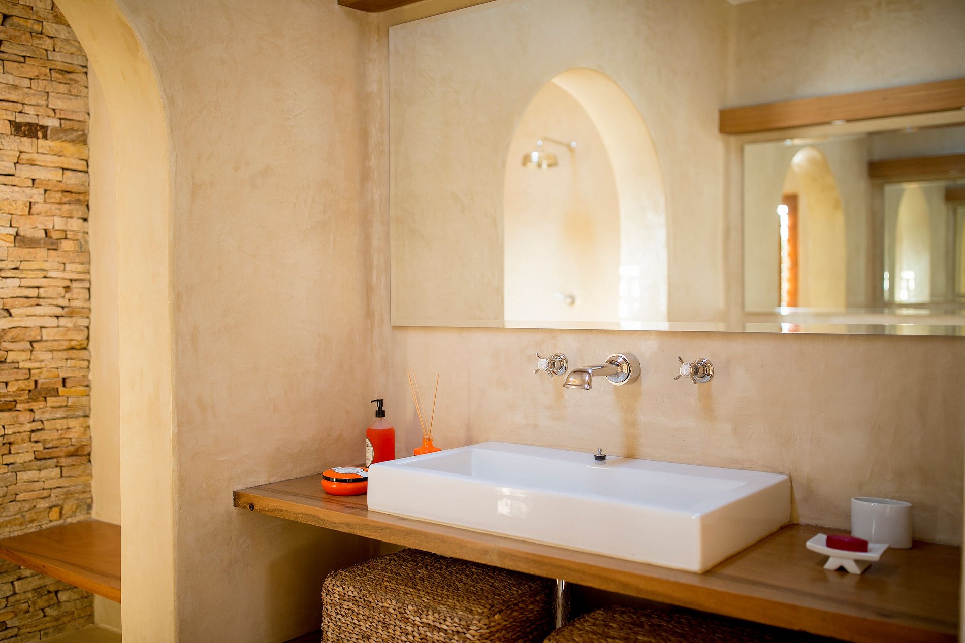 A casa principal abriga amplas salas de estar e jantar, com decoração leve e mobiliário elegante que reforçam a sensação de conforto e amplitude. Cada ambiente foi pensado para valorizar a iluminação natural e a integração com o exterior.