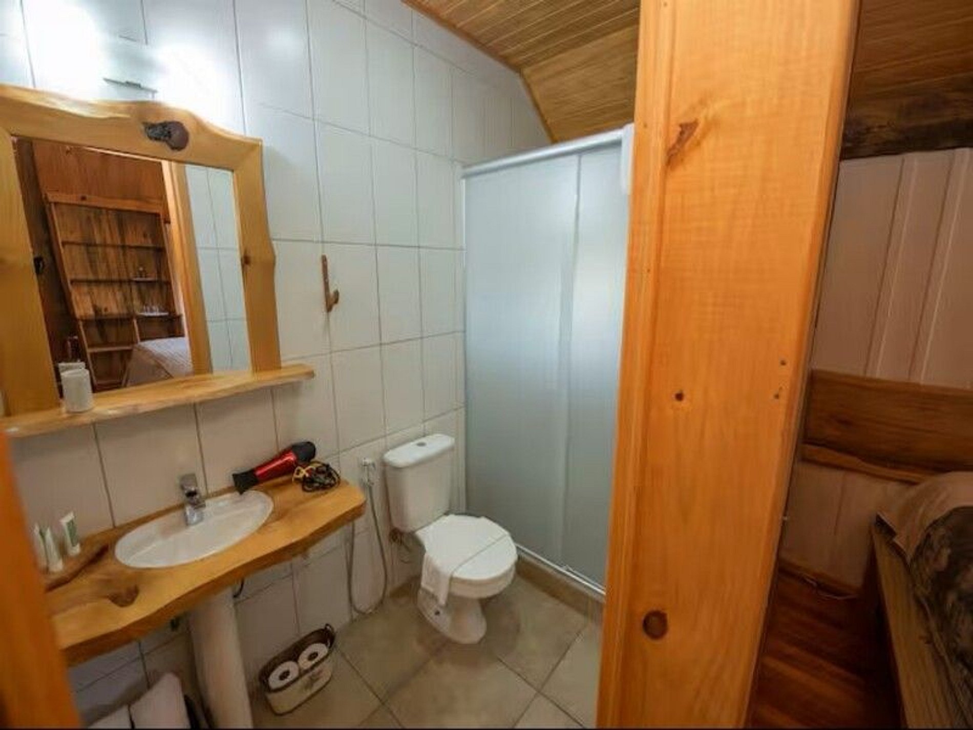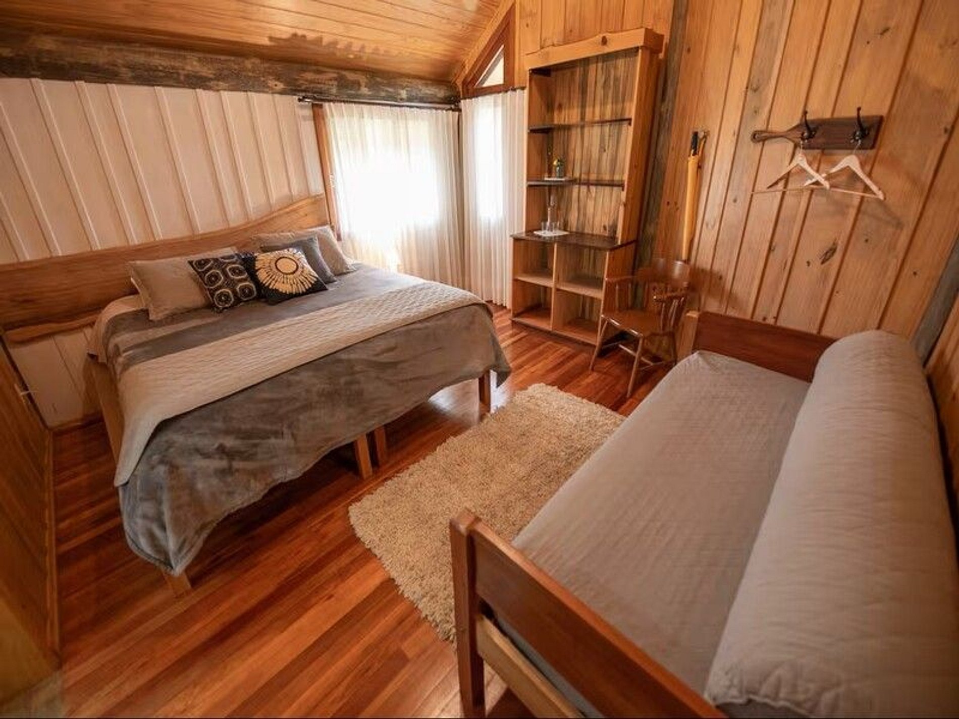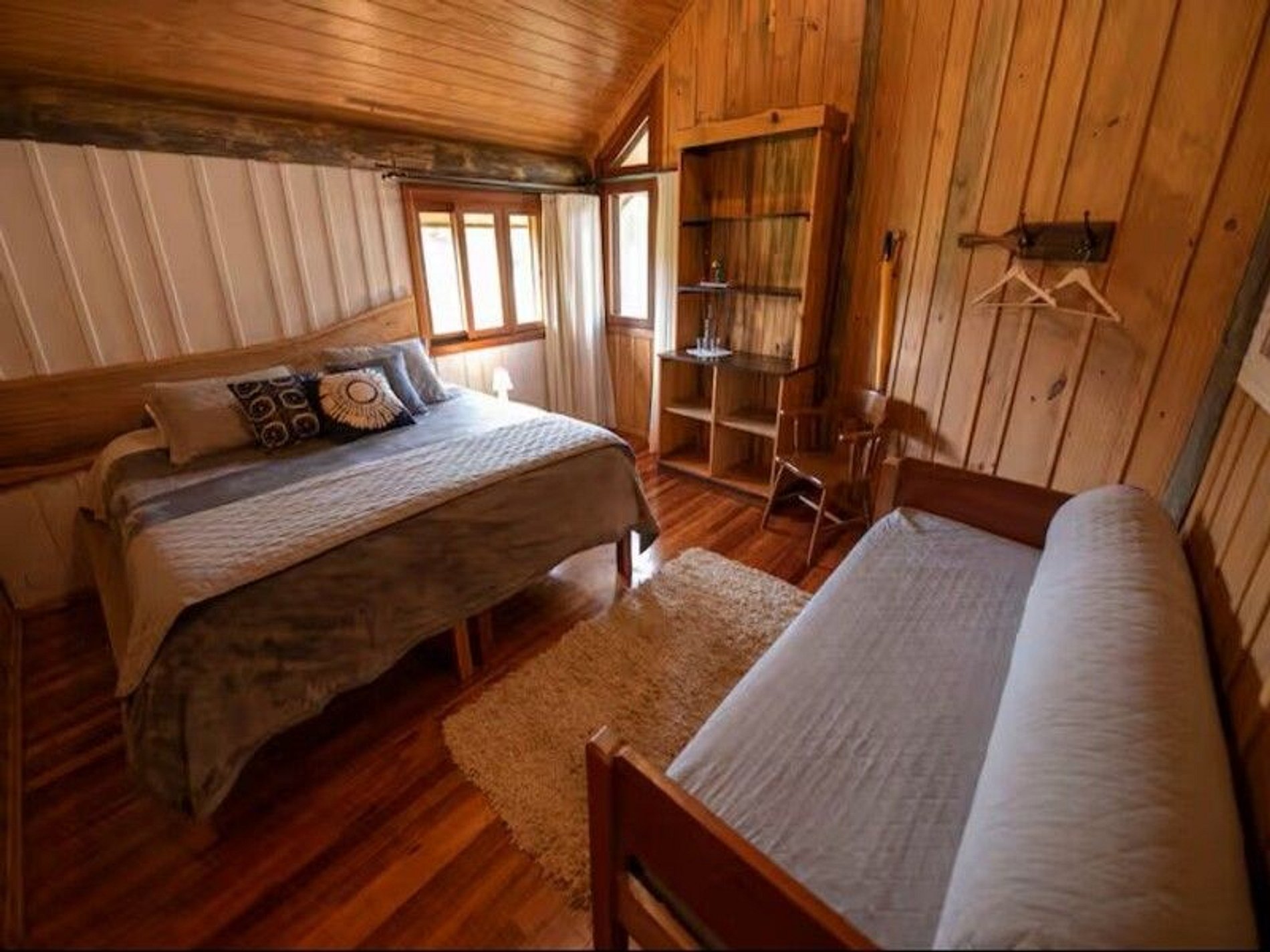 A sala de estar é ampla, aconchegante e de uso exclusivo dos hóspedes — o espaço perfeito para boas conversas, jogos e momentos de descanso. O ambiente combina o charme rústico da serra com o conforto de uma hospedagem cuidadosamente preparada.