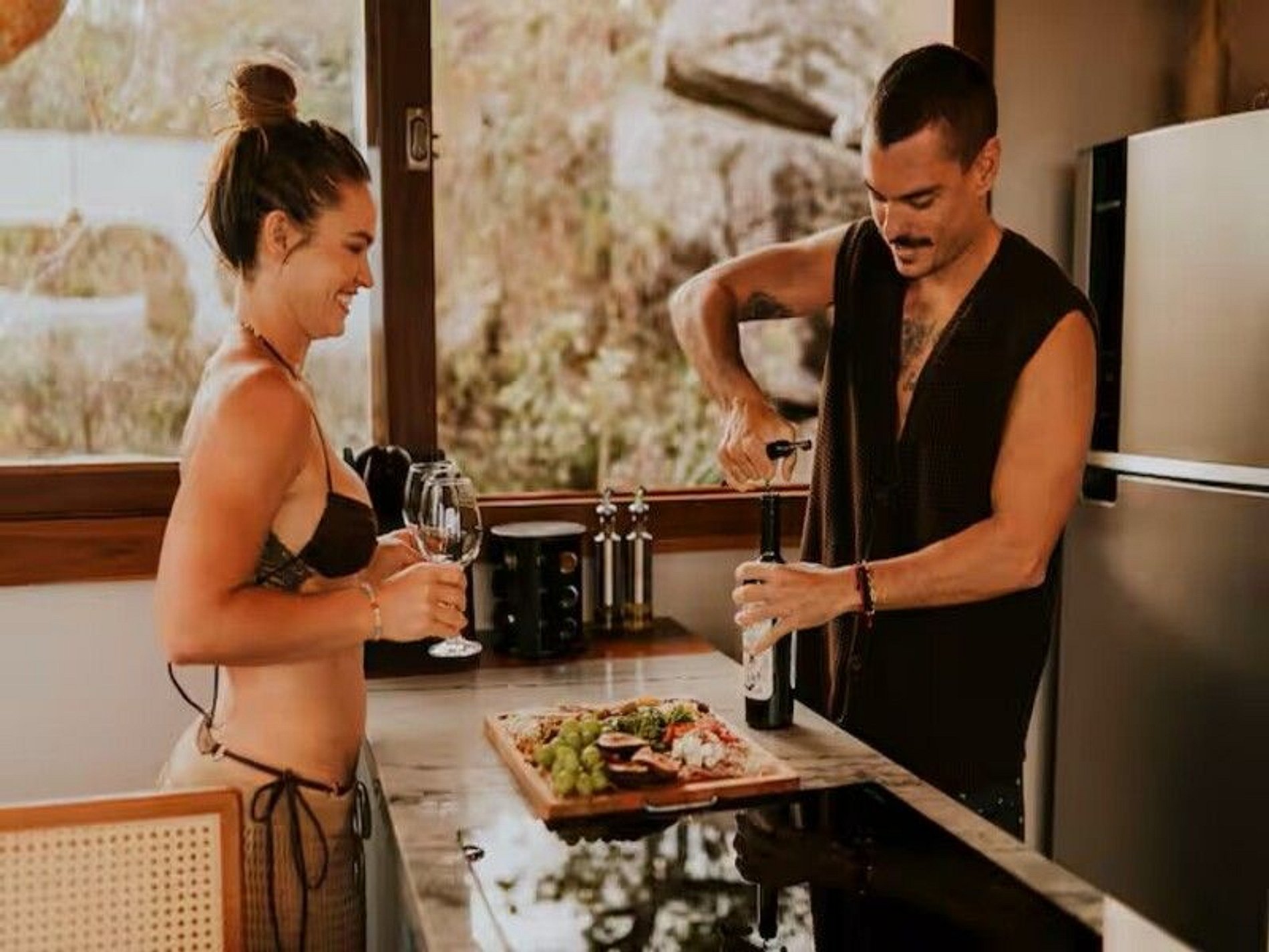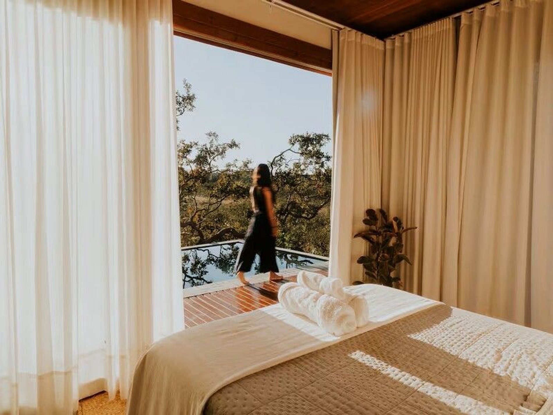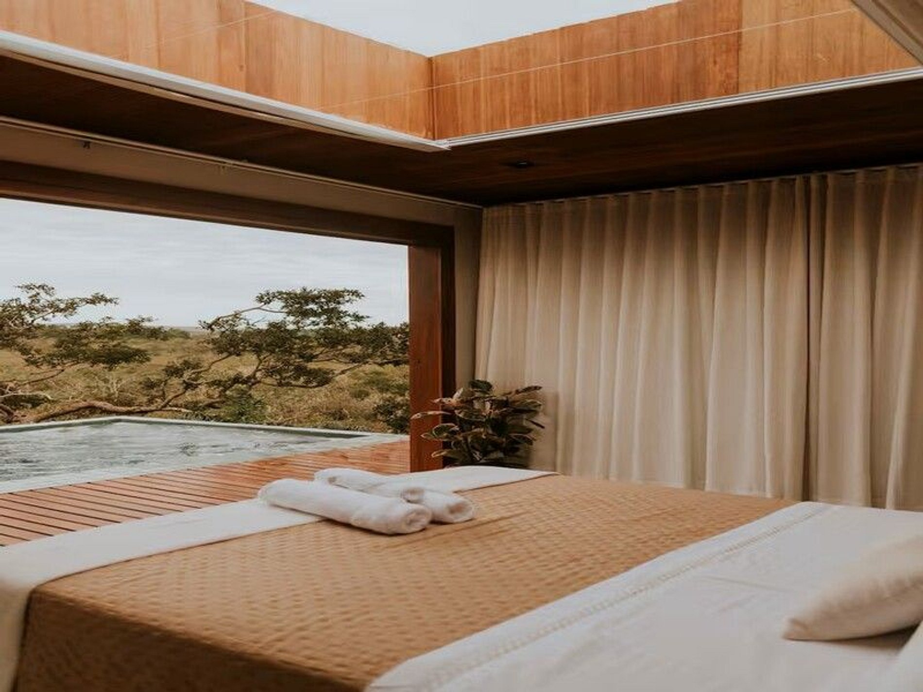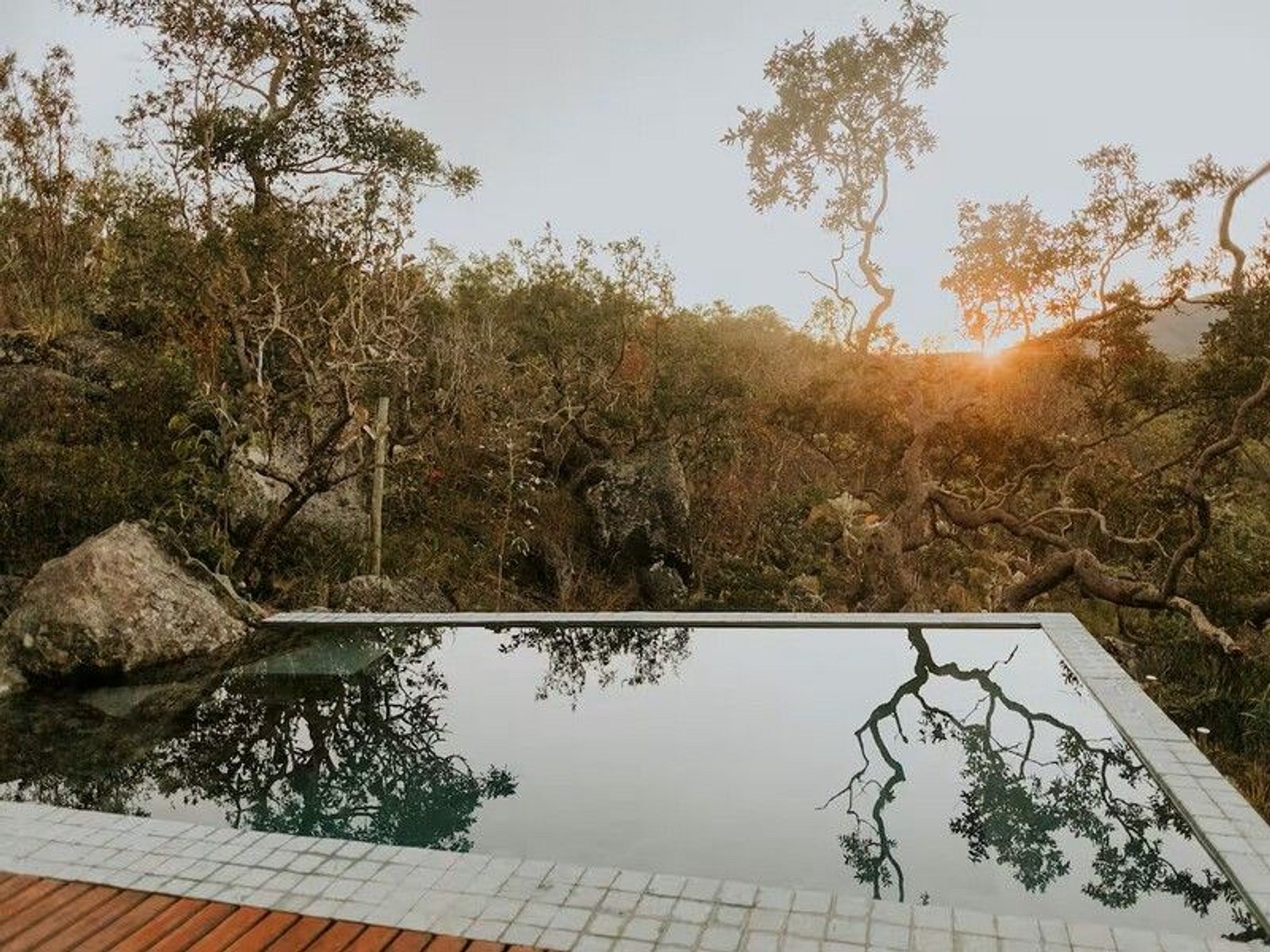 Do lado de fora, o cenário é ainda mais encantador: uma piscina privativa aquecida revestida com pedra Hijau, varanda com deck de madeira e um jardim que envolve a casa. Um espaço pensado para desacelerar, sentir o vento, apreciar o pôr do sol e se reconectar com o presente.
