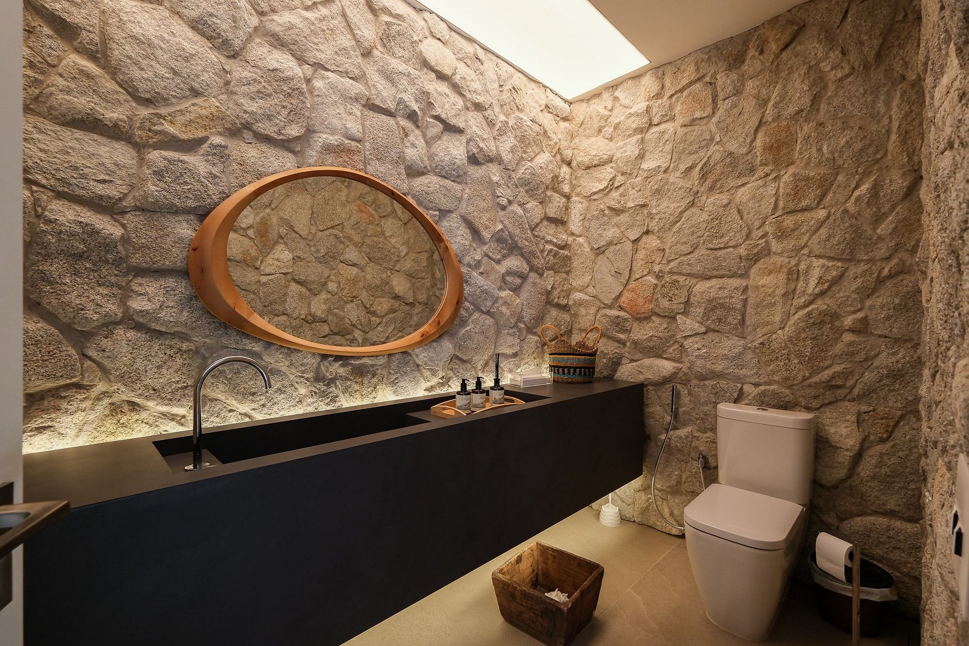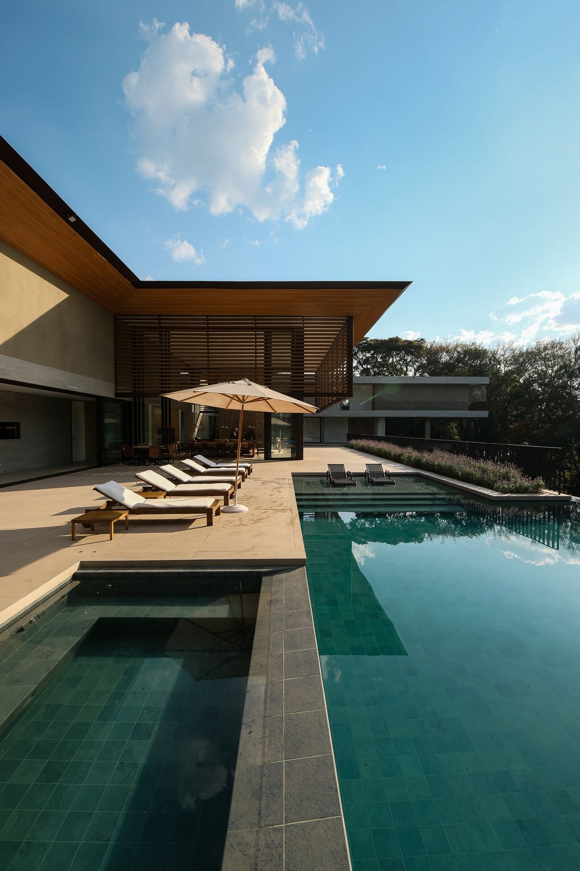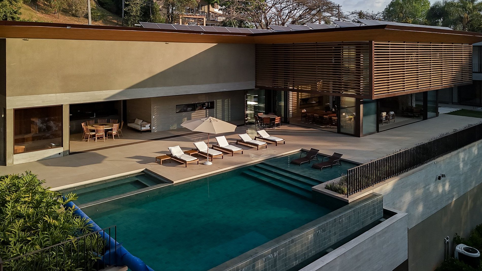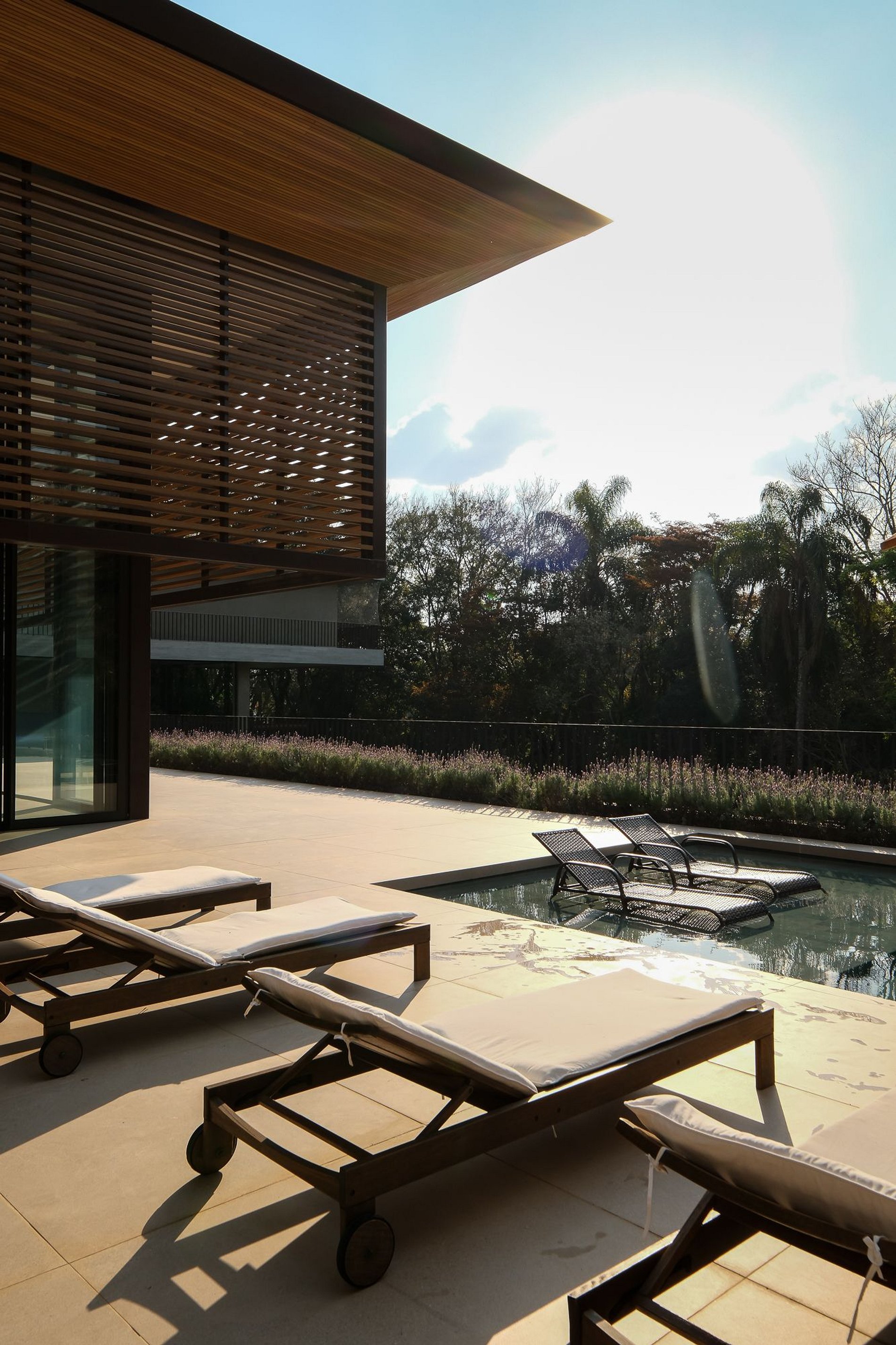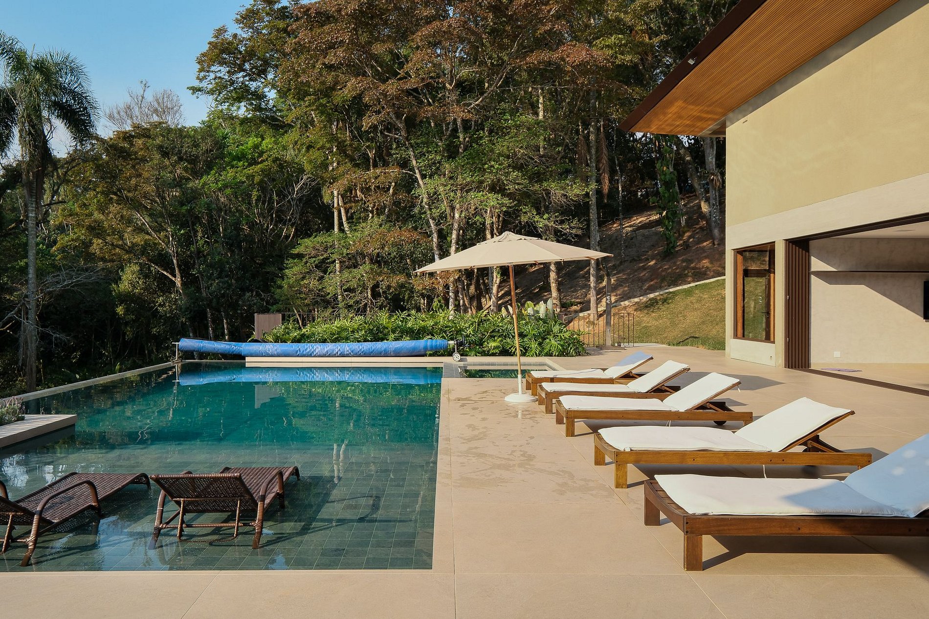 A área externa foi pensada para momentos de relaxamento e convivência. A piscina com borda infinita se integra à paisagem verde, criando um visual deslumbrante e convidativo. O solarium com espreguiçadeiras garante horas agradáveis ao sol, enquanto o amplo gramado oferece espaço para brincadeiras, atividades físicas ou simplesmente apreciar o silêncio e o ar puro da região. Tudo isso em um ambiente totalmente reservado e cercado pela mata nativa.