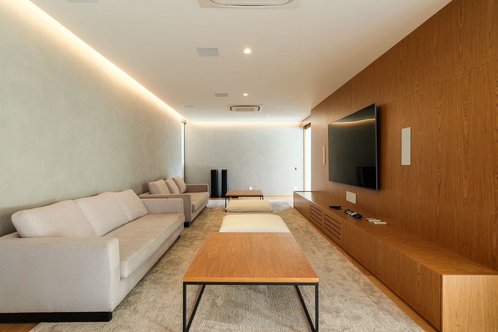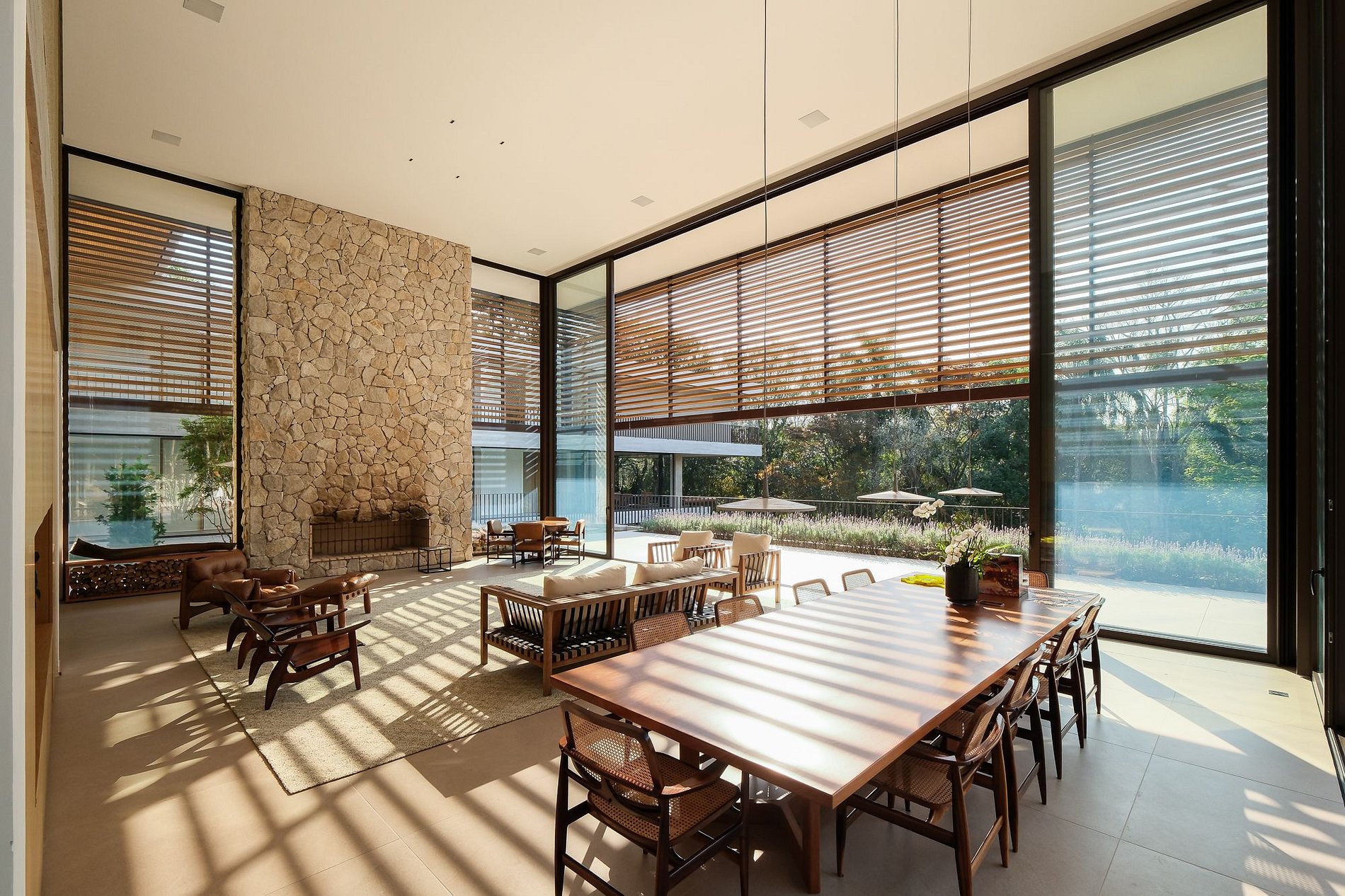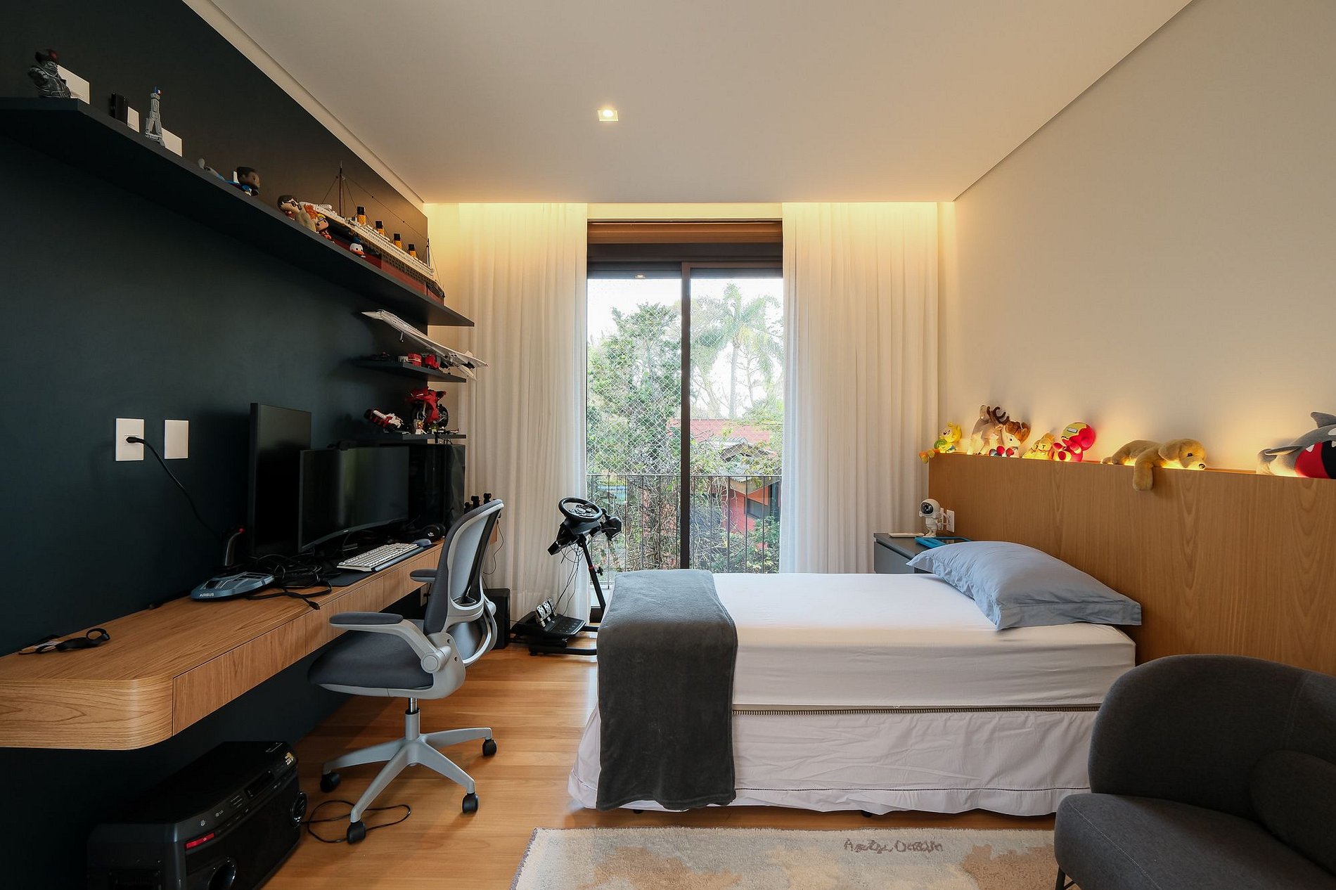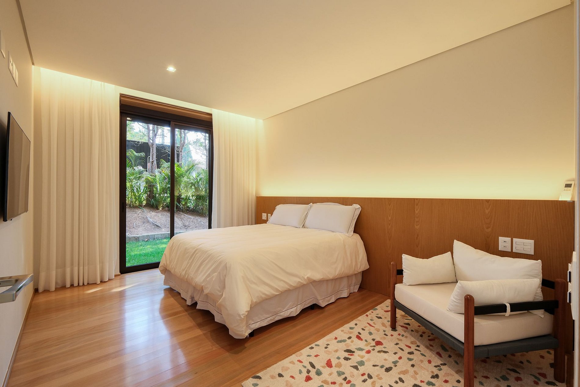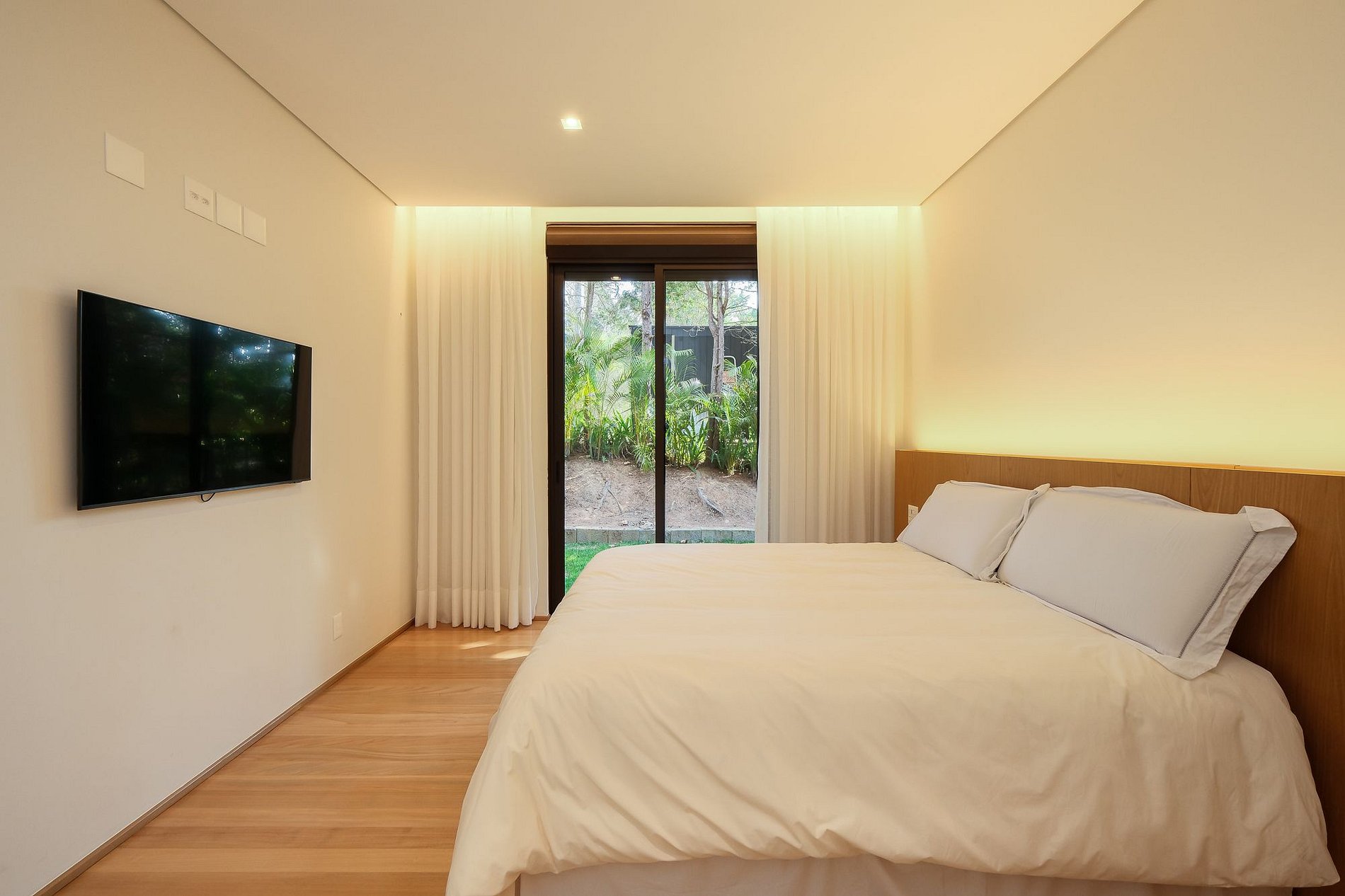 A sala oferece amplitude, luz natural e muito conforto, com sofá espaçoso, TV de grandes proporções e um projeto de iluminação que valoriza cada detalhe. O ambiente se conecta ao jardim por meio de grandes aberturas, criando uma sensação relaxante de continuidade entre interior e exterior.