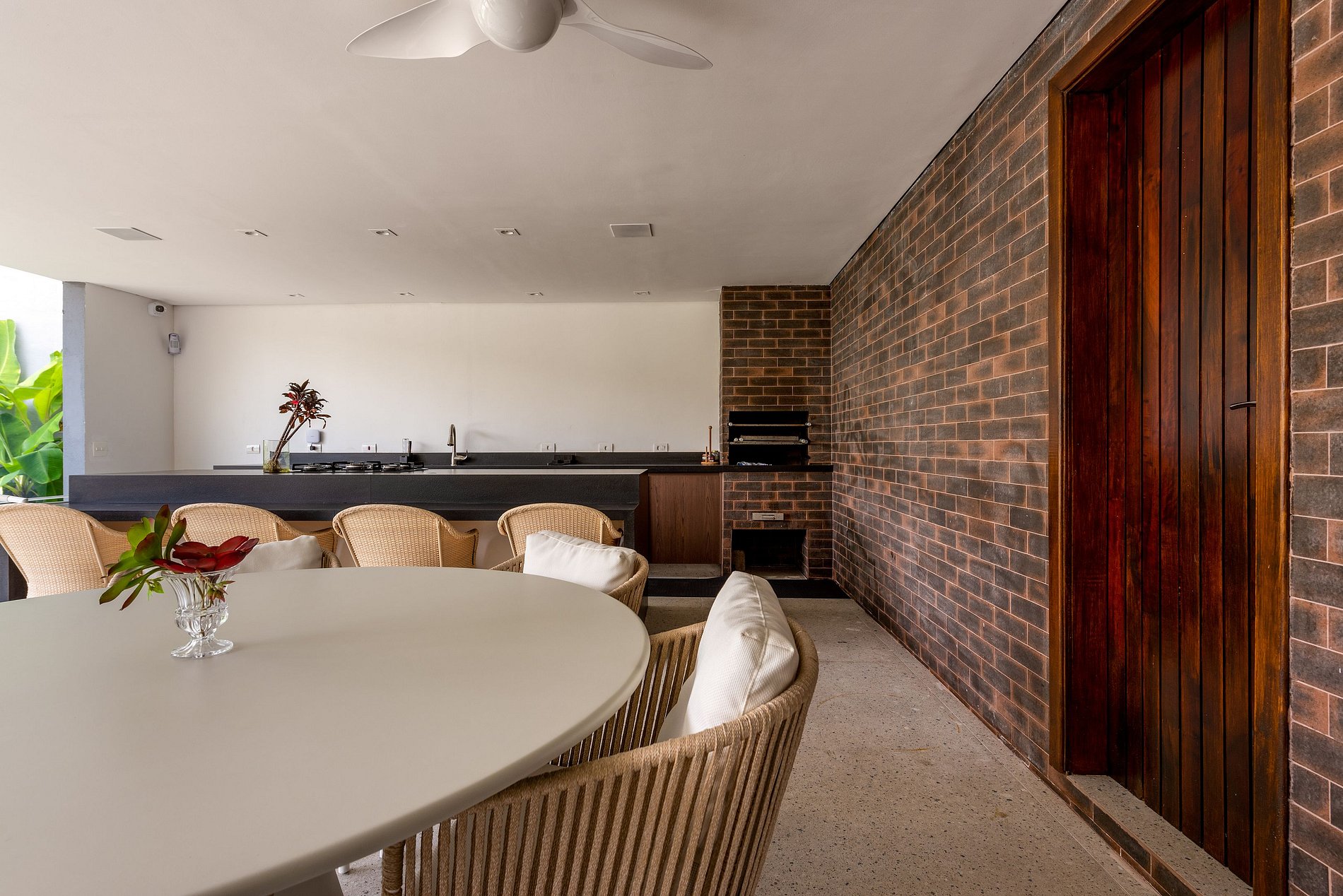 Destaque para o bem cuidado jardim, que além da piscina conta com um lindo e florido pergolado com mobiliário de descanso, projetado para ambientes abertos. Na lateral se encontra o espaço gourmet com bancada, churrasqueira, mesas e cadeiras, ideal para refeições leves e descontraídas.