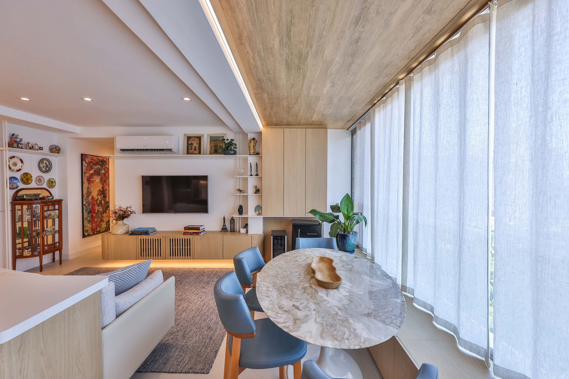 Os espaços de convivência são amplos, confortáveis e muito bem iluminados. A sala de estar integra-se à sala de jantar, criando um ambiente perfeito para relaxar, receber convidados ou compartilhar refeições. A cobertura conta ainda com uma sala de TV adicional, equipada com sofá confortável, ideal para momentos de descanso e entretenimento.