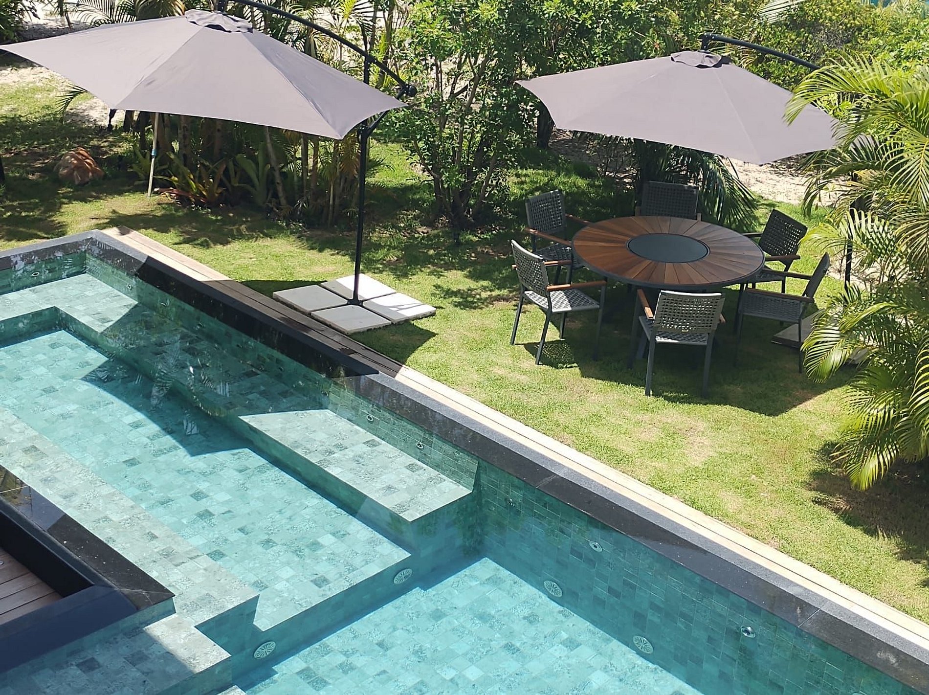 Imensos e bem cuidados jardins, circundam a residência, tendo a piscina e as pequenas ilhas espalhadas pelo gramado, com mesas, cadeiras retráteis redes e ombrelones como destaque especial da propriedade.