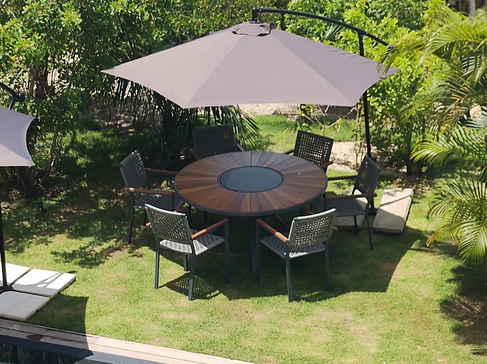 Aberto para o jardim, essa é uma área ideal para refeições leves e informais, com churrasqueira, mesas, cadeiras, louças e utensílios de cozinha.