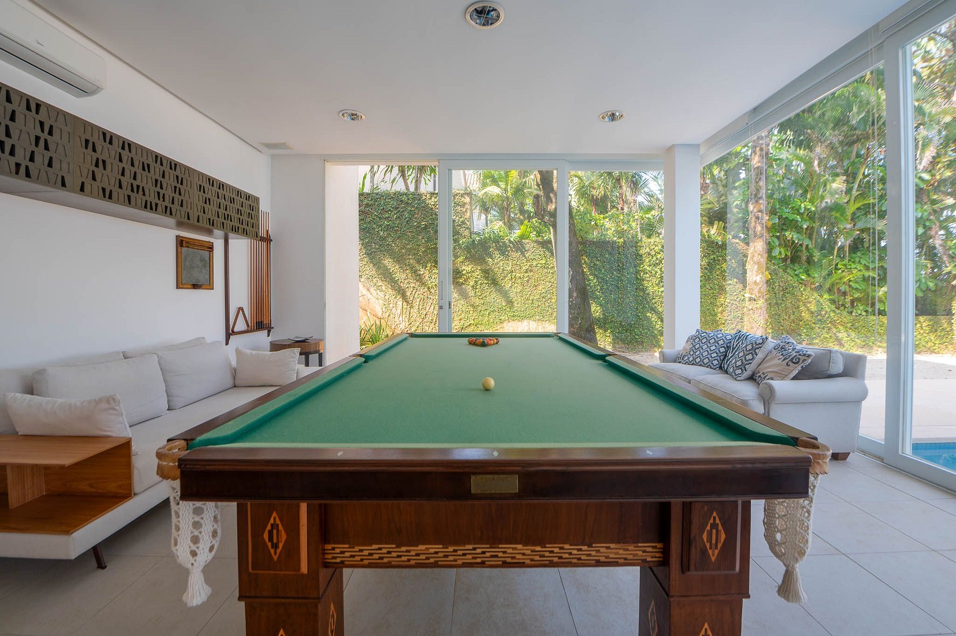 A casa ampla e bem iluminada possui dois andares. Na sala de estar móveis em madeira e amplos sofás com almofadas conferem uma decoração elegante e sofisticada. Na sala de jantar há uma mesa de madeira com lugar para 14 pessoas para refeições descontraídas. Em uma parte mais reservada, tem uma mesa de sinuca para jogar com os amigos e sofás. Há também uma sala de TV com um super sofá para as crianças assistirem um filminho.