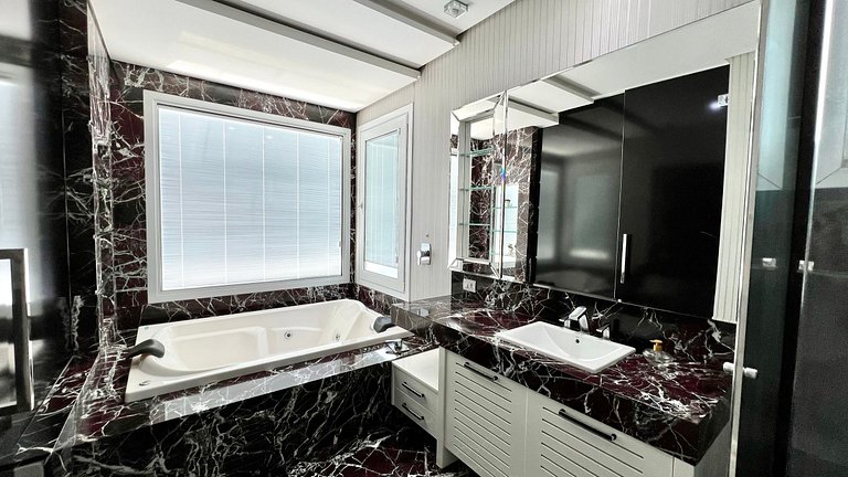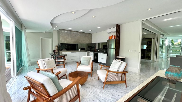 573 m² de área útil para comportar 7 dormitórios, sendo 6 suítes, 8 banheiros e 4 vagas de garagem. Sala de estar, sala de jantar, cozinha, área gourmet com churrasqueira e piscina complementam os ambientes. Além disso, o imóvel conta com:
